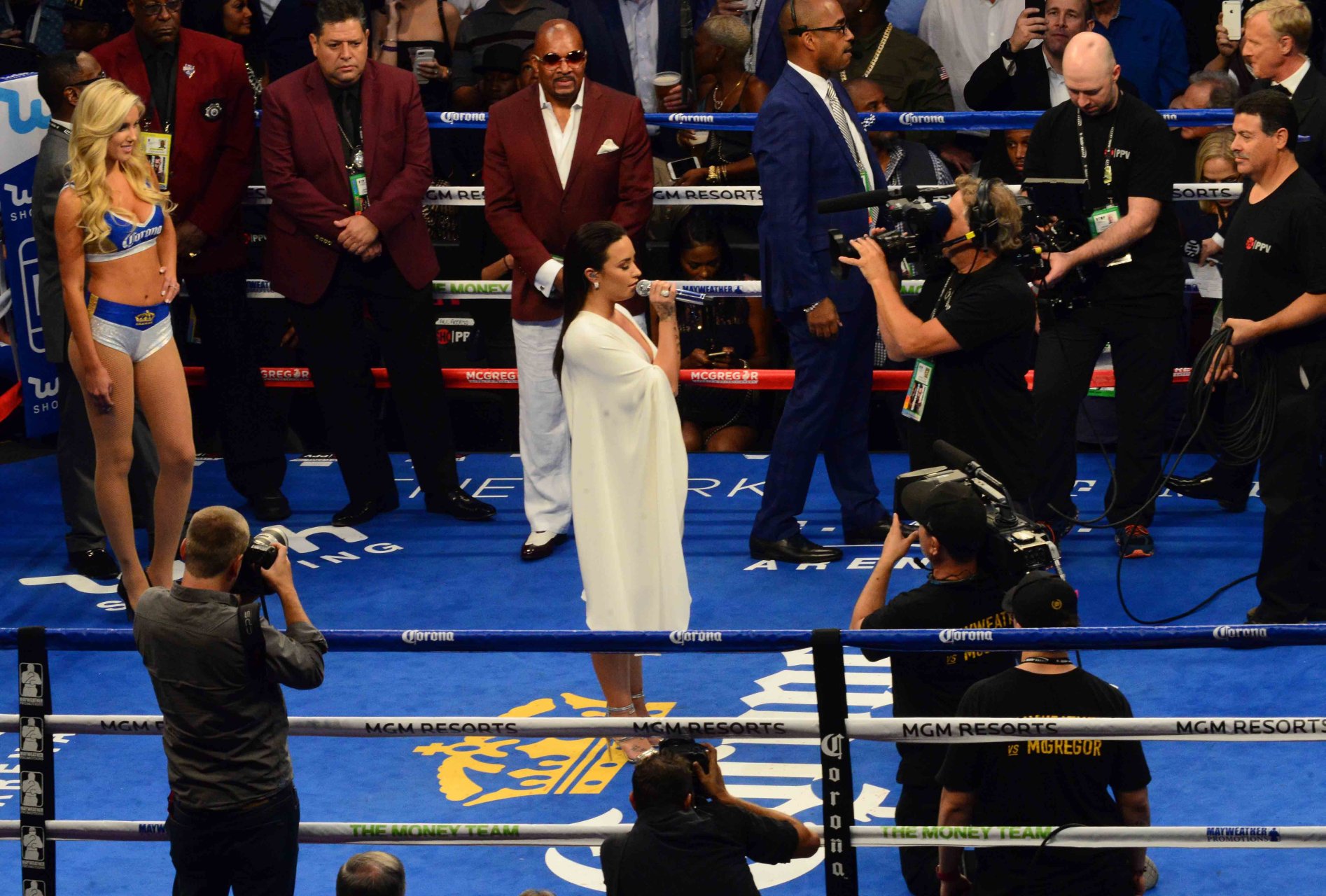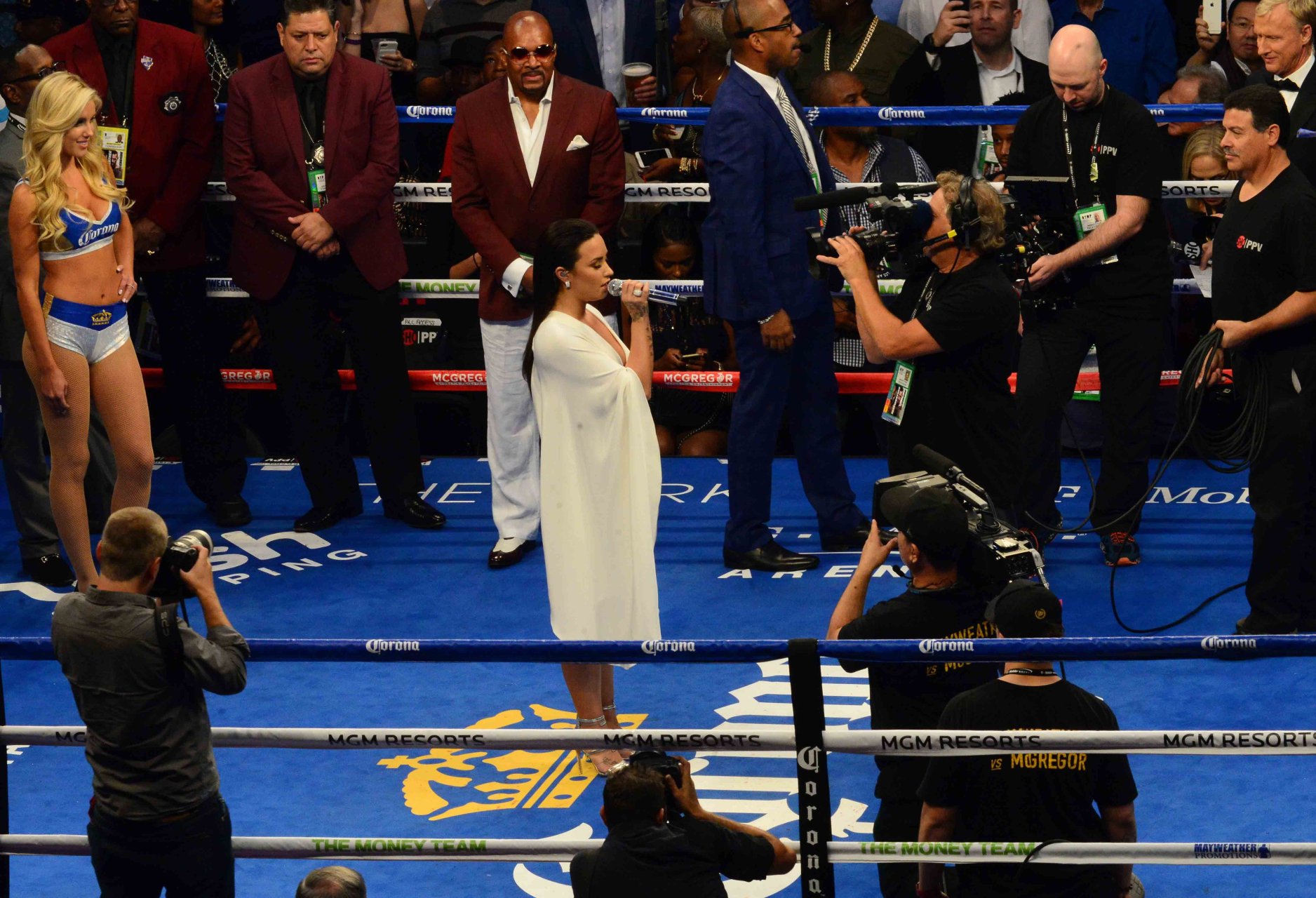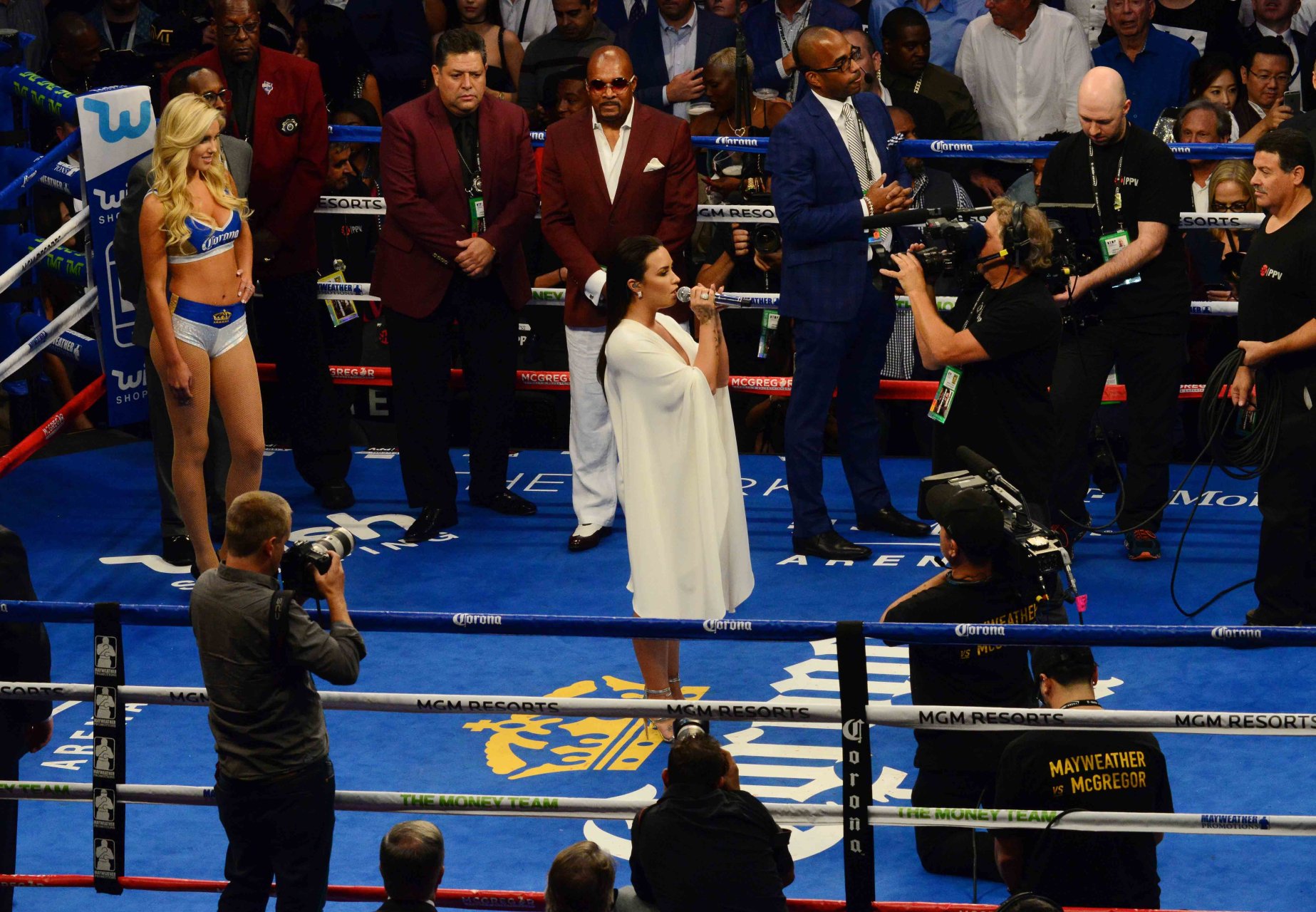 Demi Lovato canta o Hino Nacional na luta Mayweather / McGregor na T-Mobile Arena em Las Vegas, 26/08/2017.