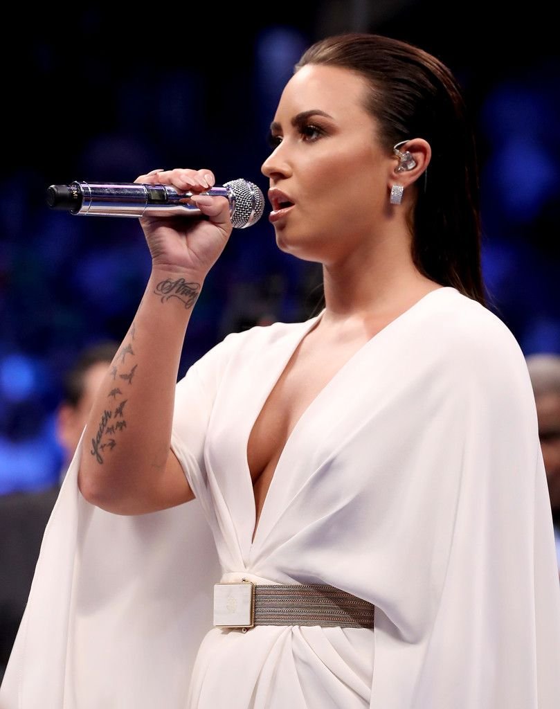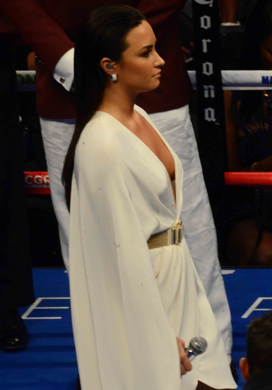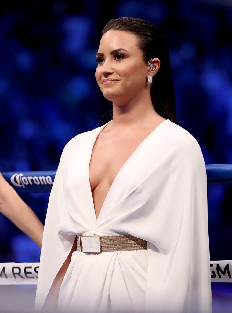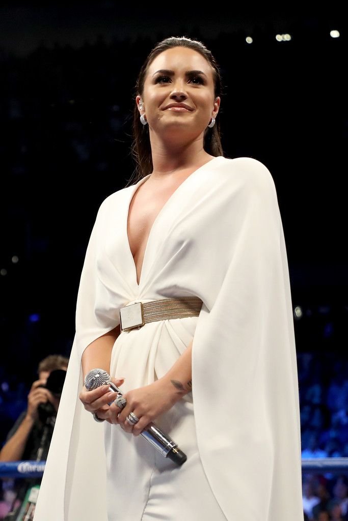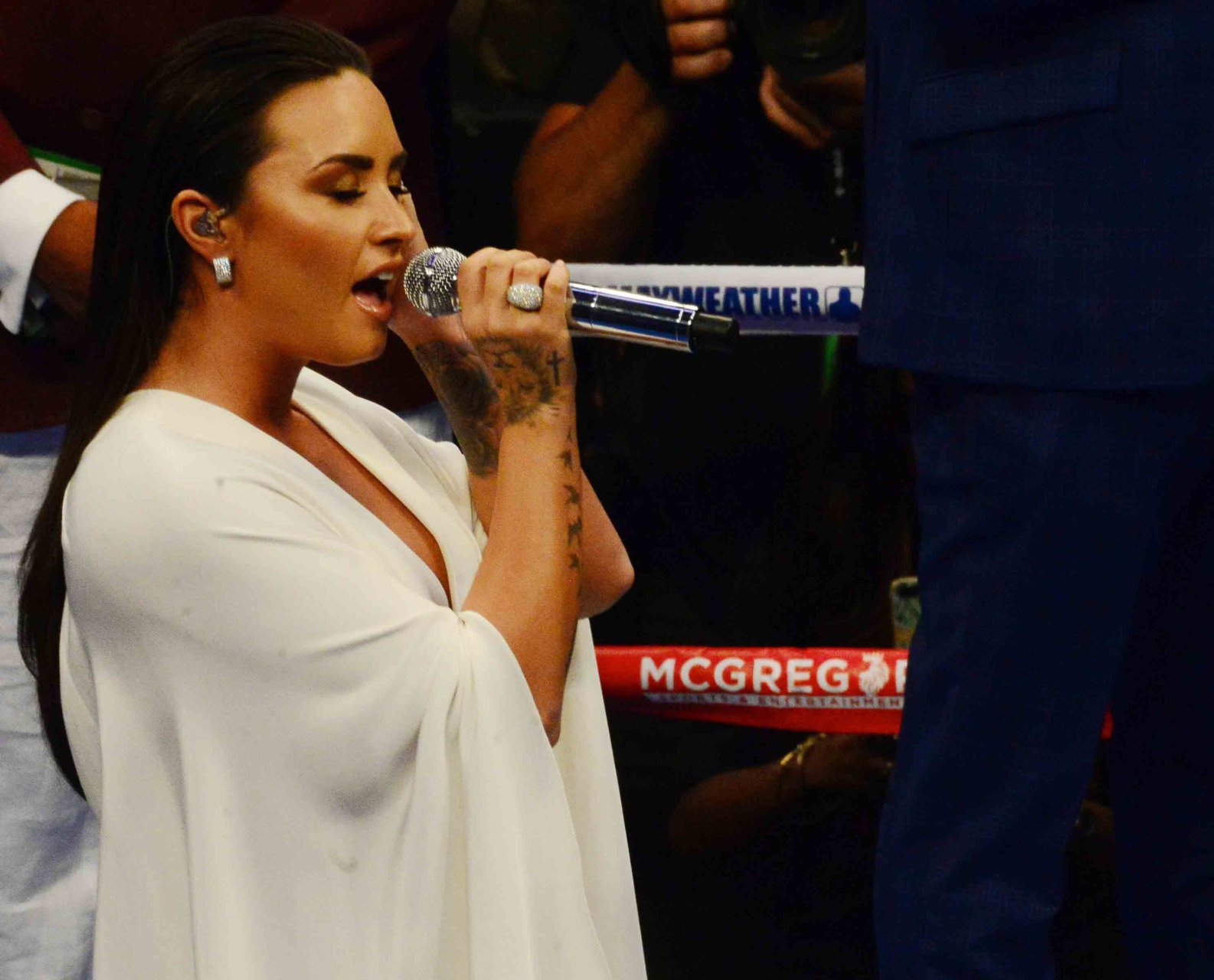 Demi Lovato canta o Hino Nacional na luta Mayweather / McGregor na T-Mobile Arena em Las Vegas, 26/08/2017.