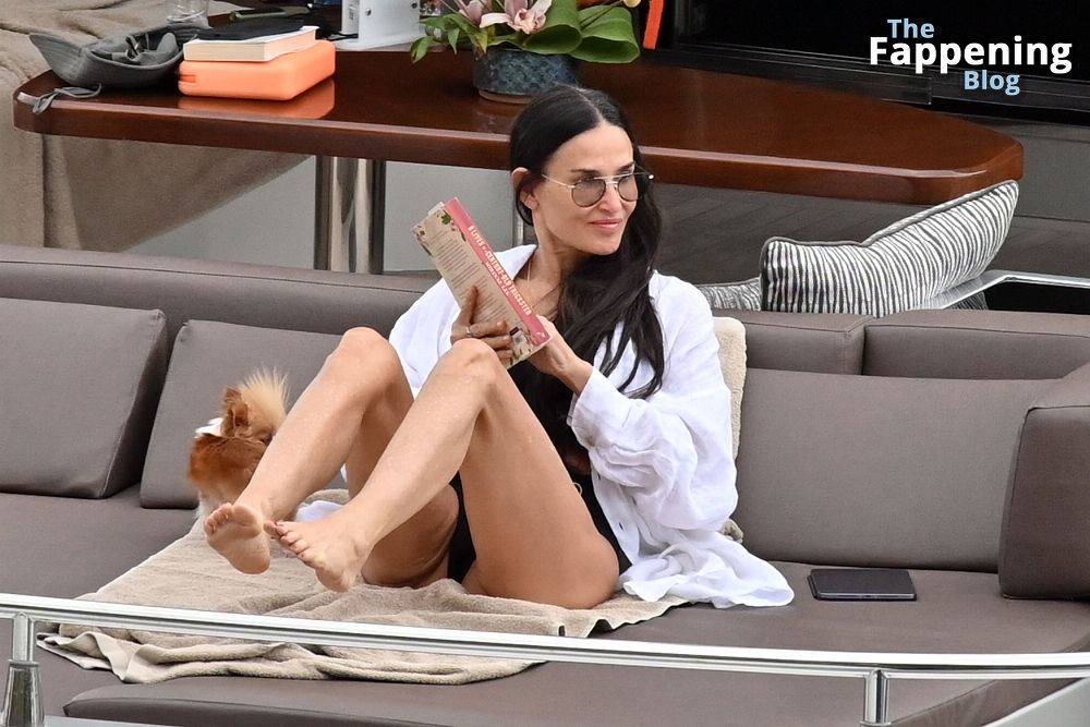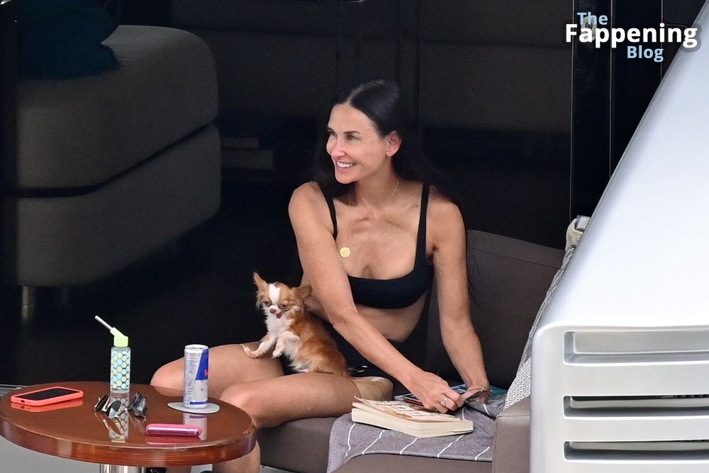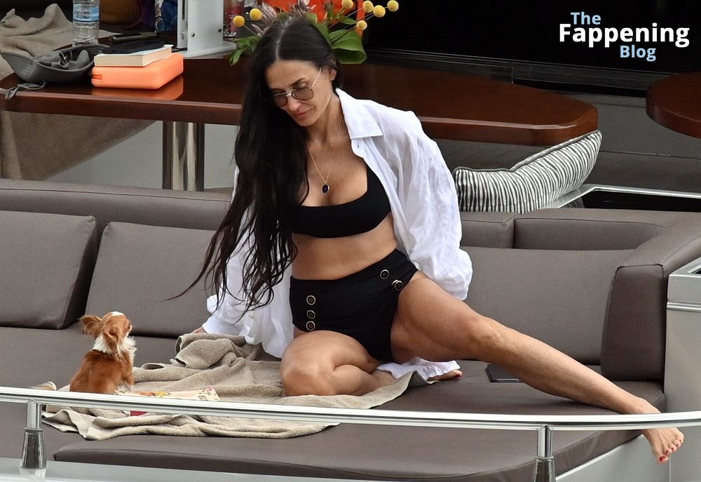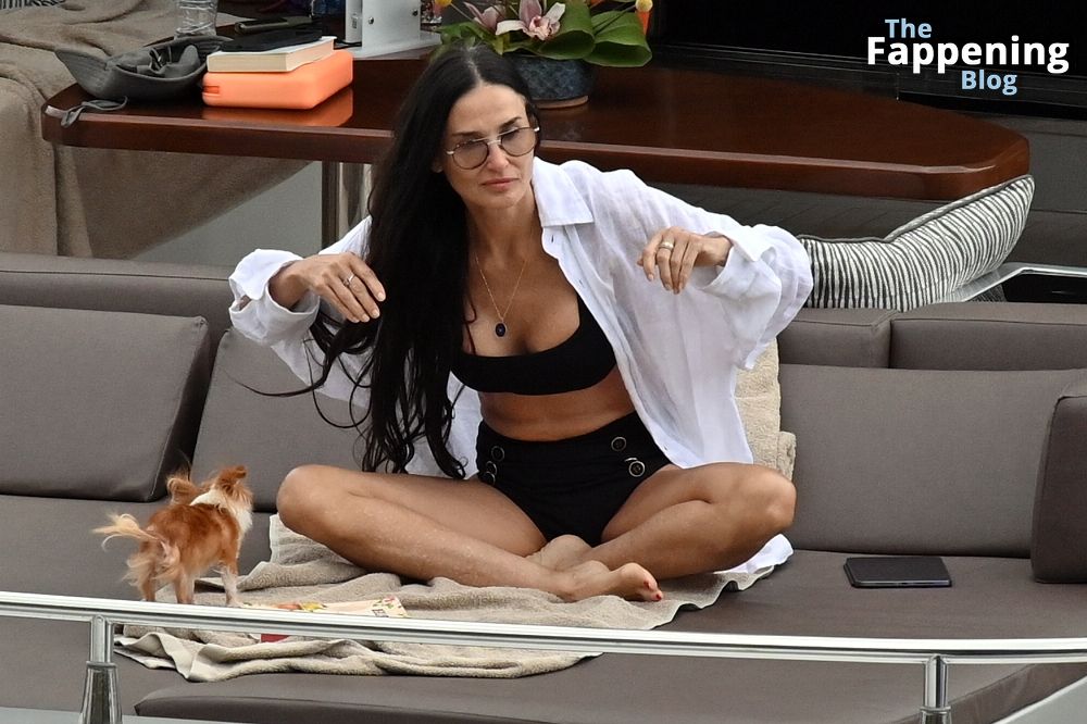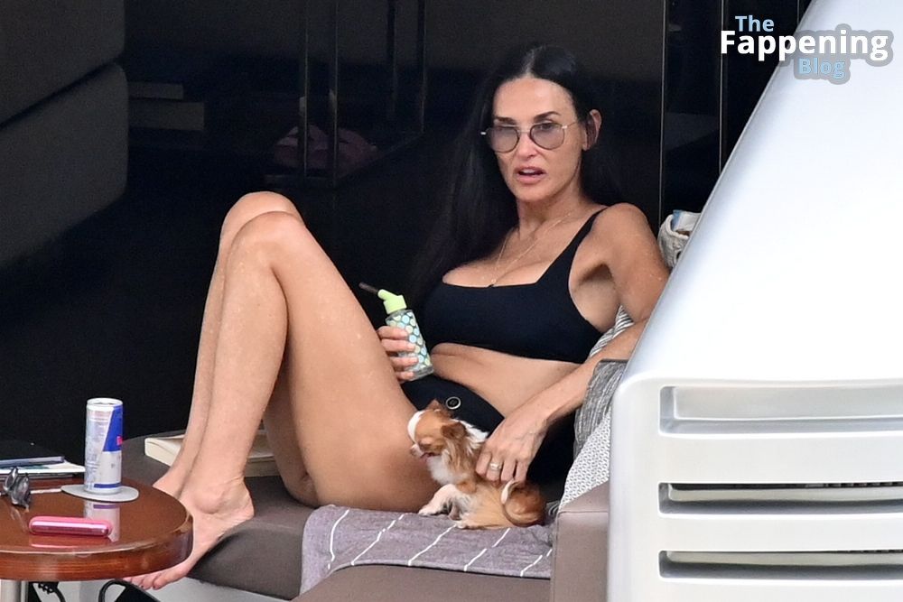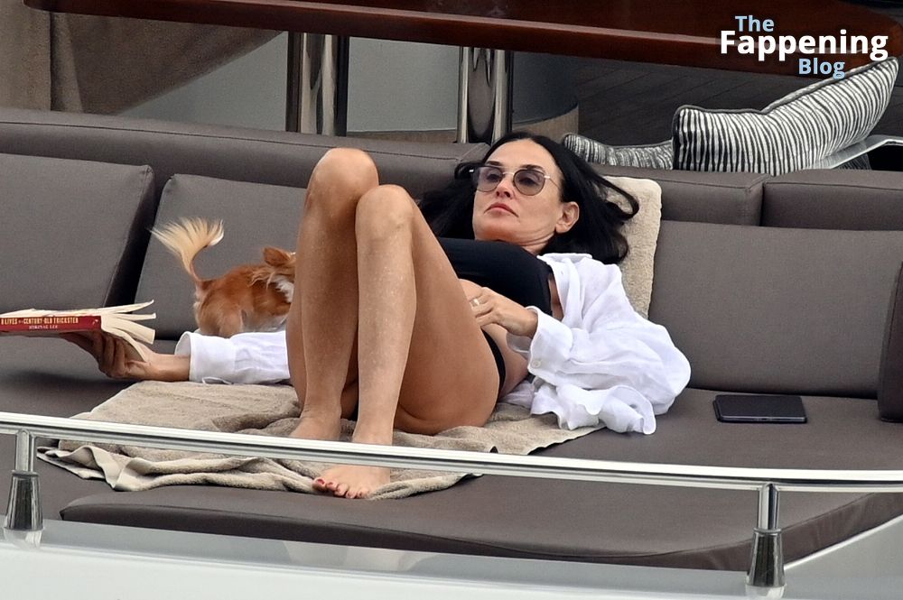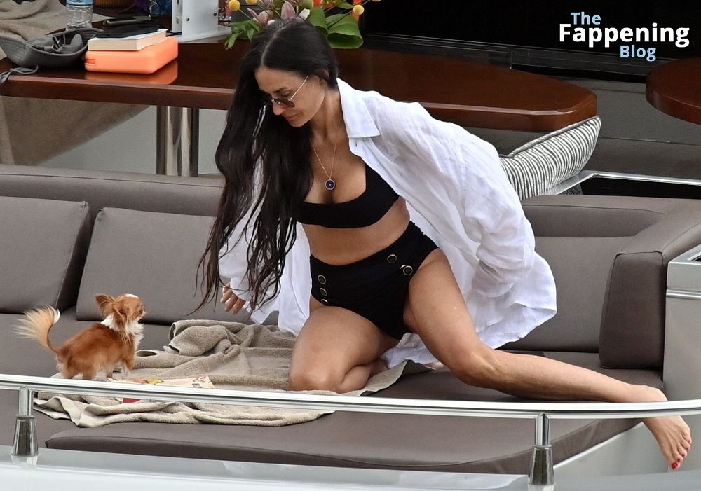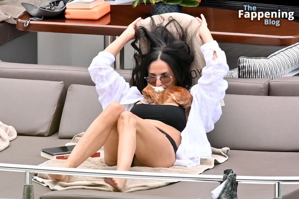 Demi Moore está chique em um maiô preto de cintura alta enquanto continua suas férias na Grécia a bordo de um iate de luxo com seu amado cachorro Pilaf, 12/08/2023.