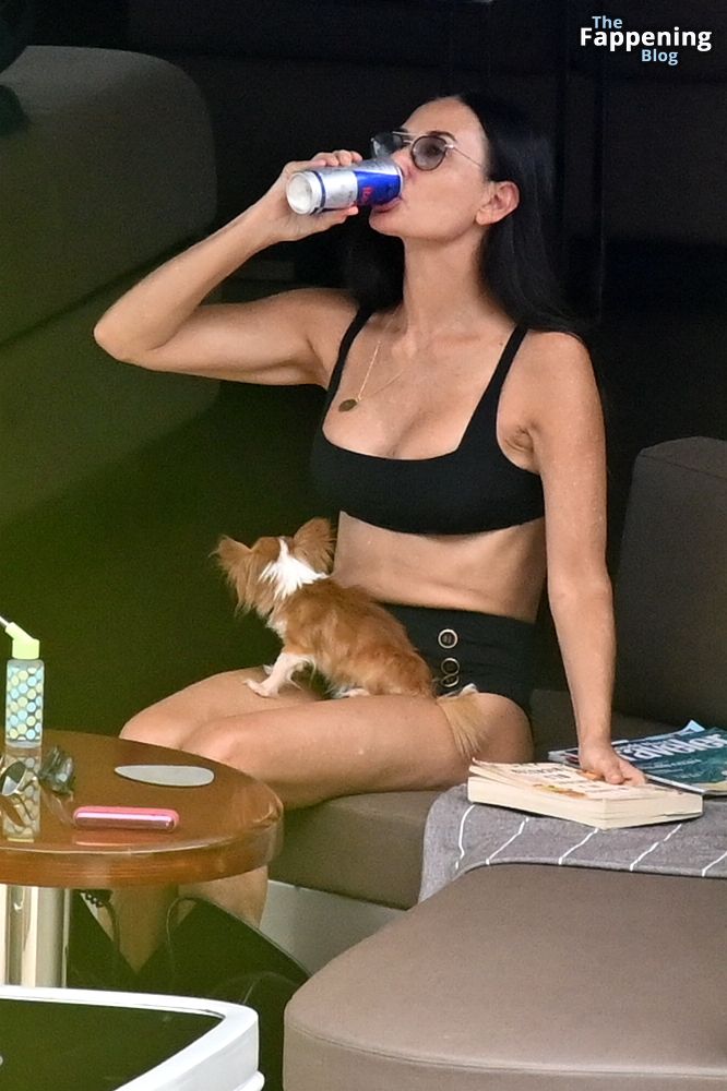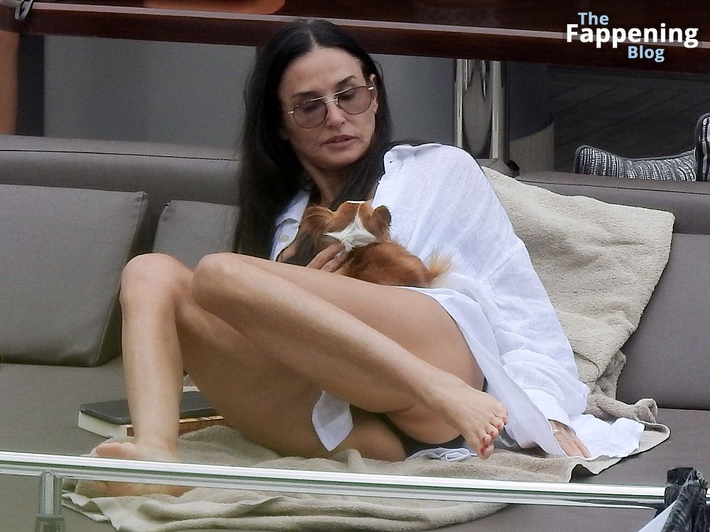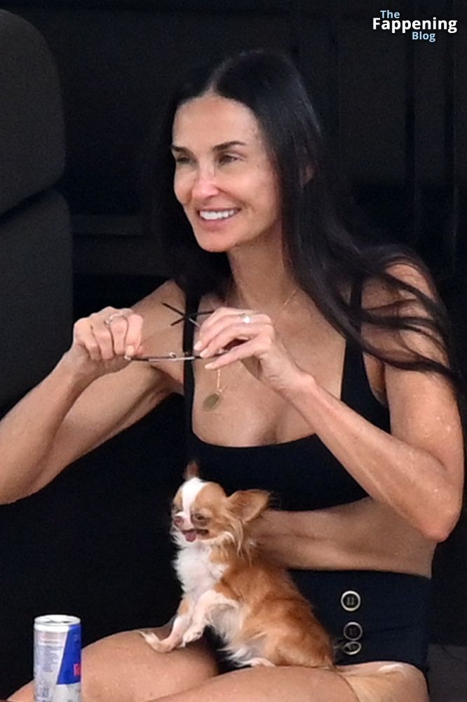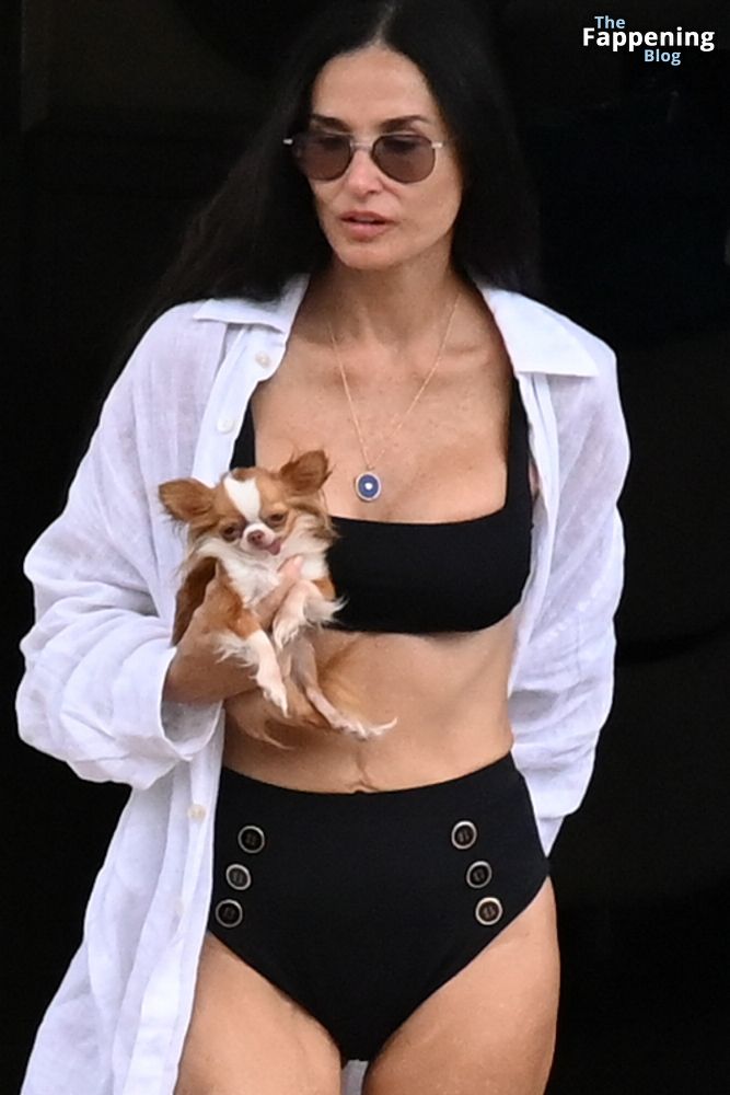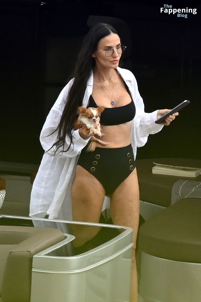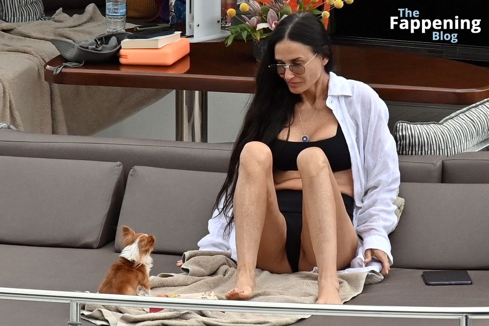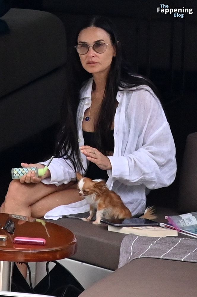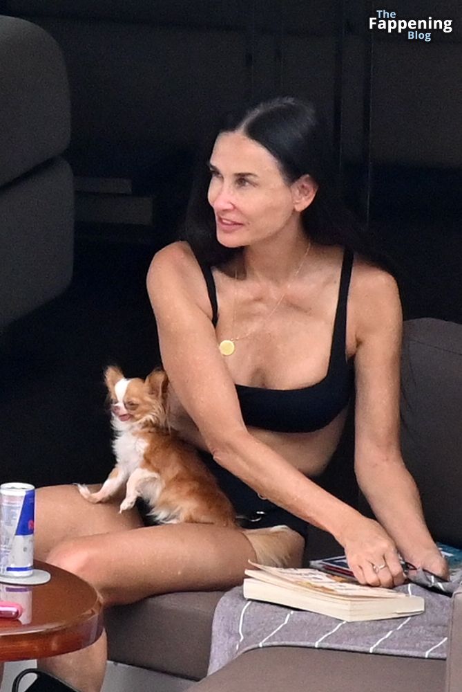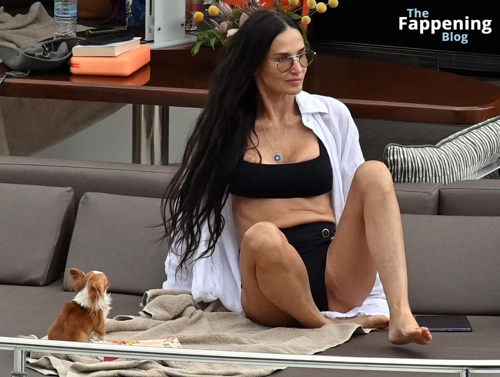 Demi Moore está chique em um maiô preto de cintura alta enquanto continua suas férias na Grécia a bordo de um iate de luxo com seu amado cachorro Pilaf, 12/08/2023.