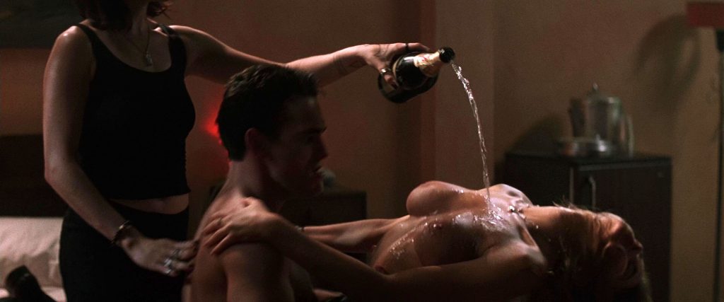 Aquela cena de ménage à trois foi a base de todo o filme, e os seios de silicone da Denise Richard foram o centro daquela cena. Pena que tudo dependesse de um par de peitos tão falsos. Não dá para perceber bem nestas capturas, mas assista ao filme e verá que parecem duas bolsas cheias de cobras.