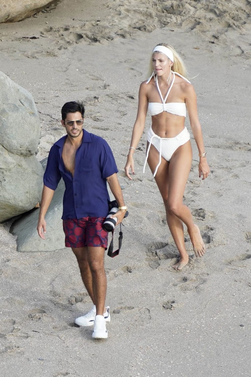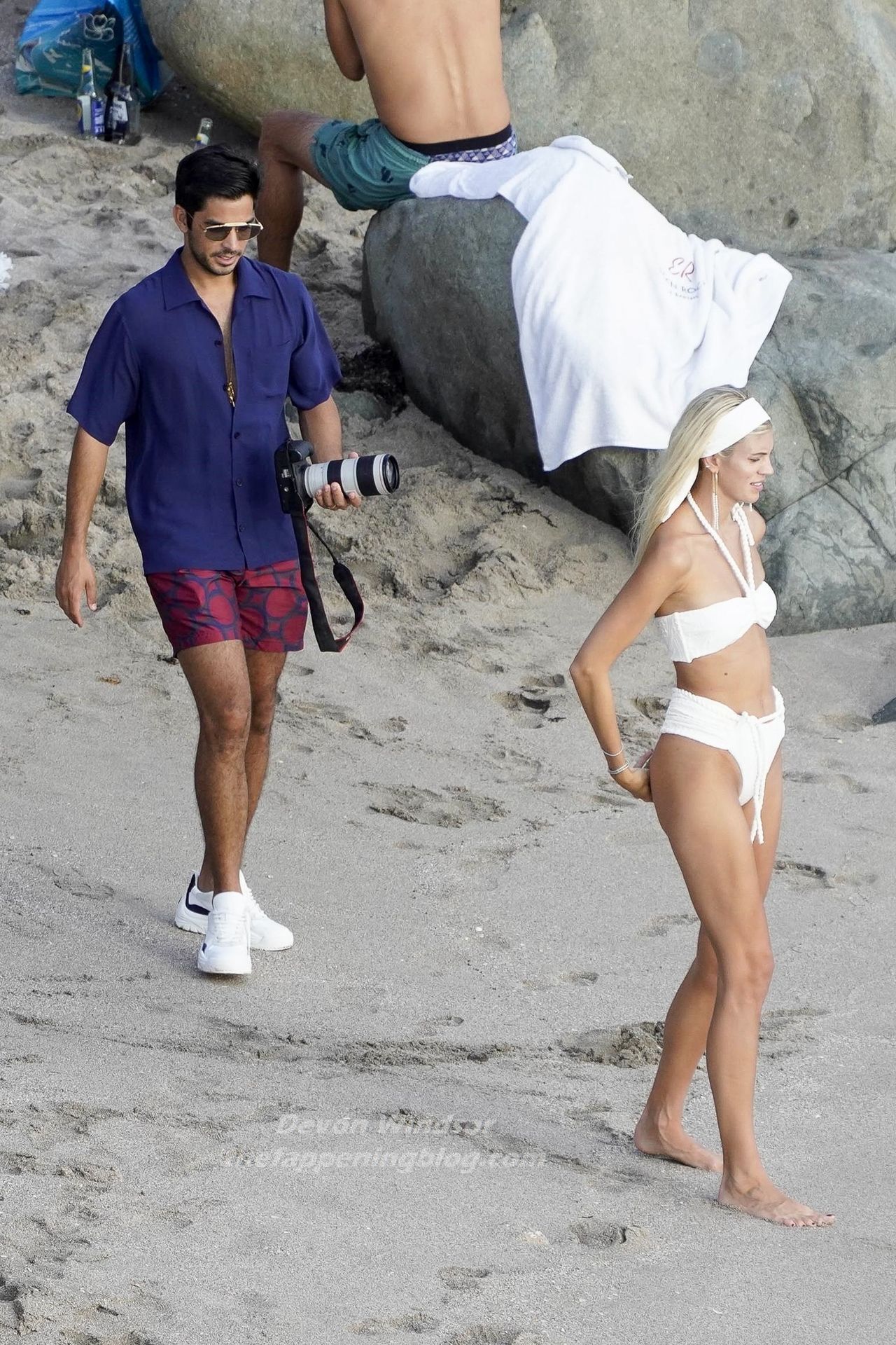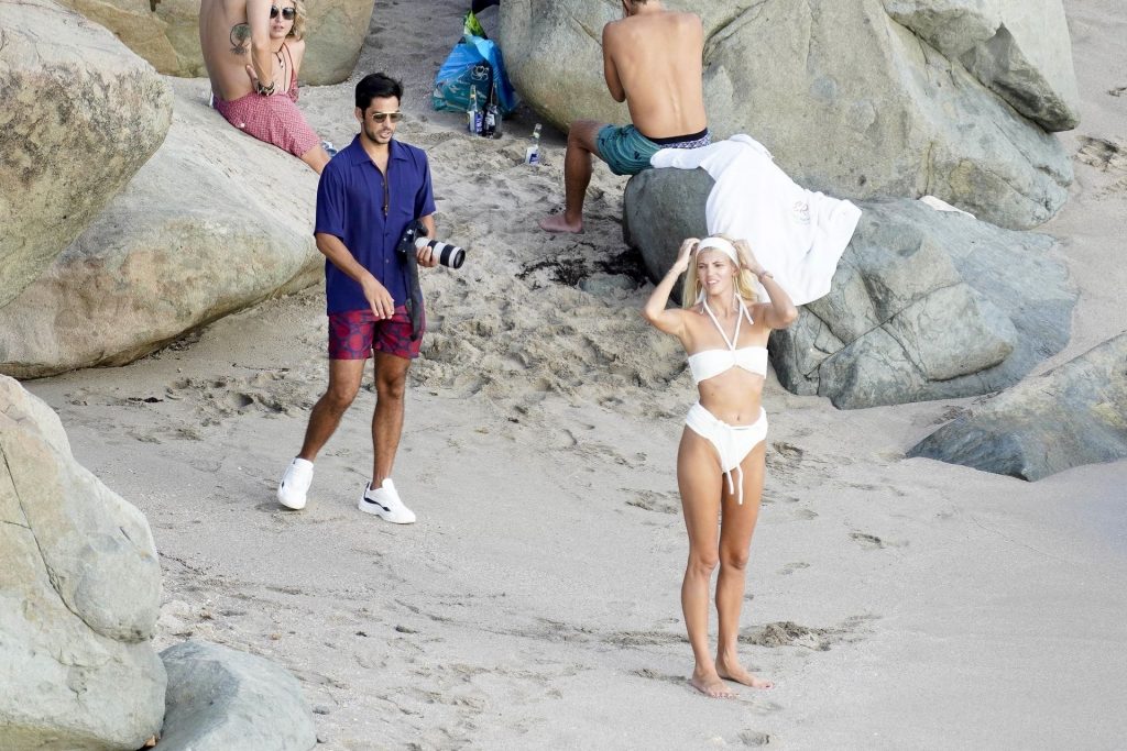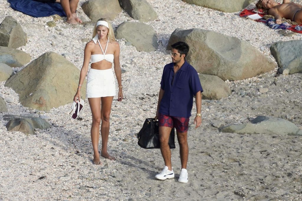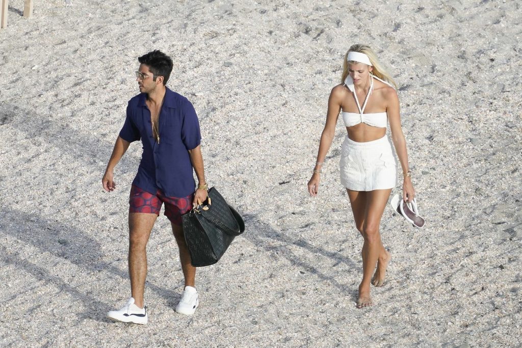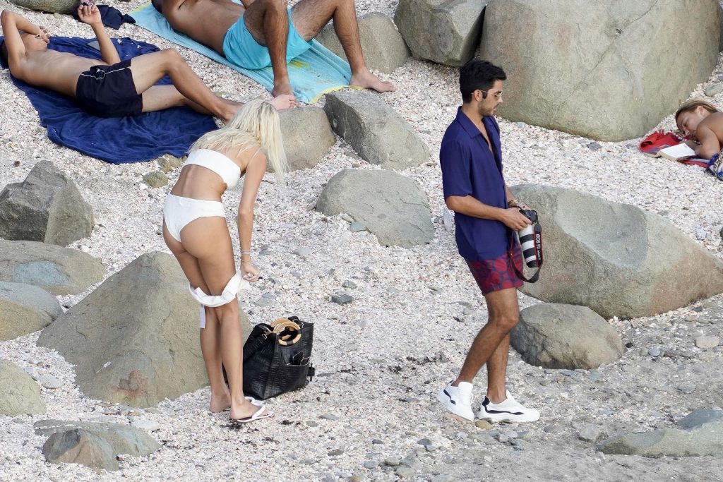 A modelo Devon Windsor exibe sua silhueta em um biquíni branco enquanto ela e seu marido Johnny Barbara comemoram o primeiro aniversário de casamento em St. Barts, 14/11/2020.