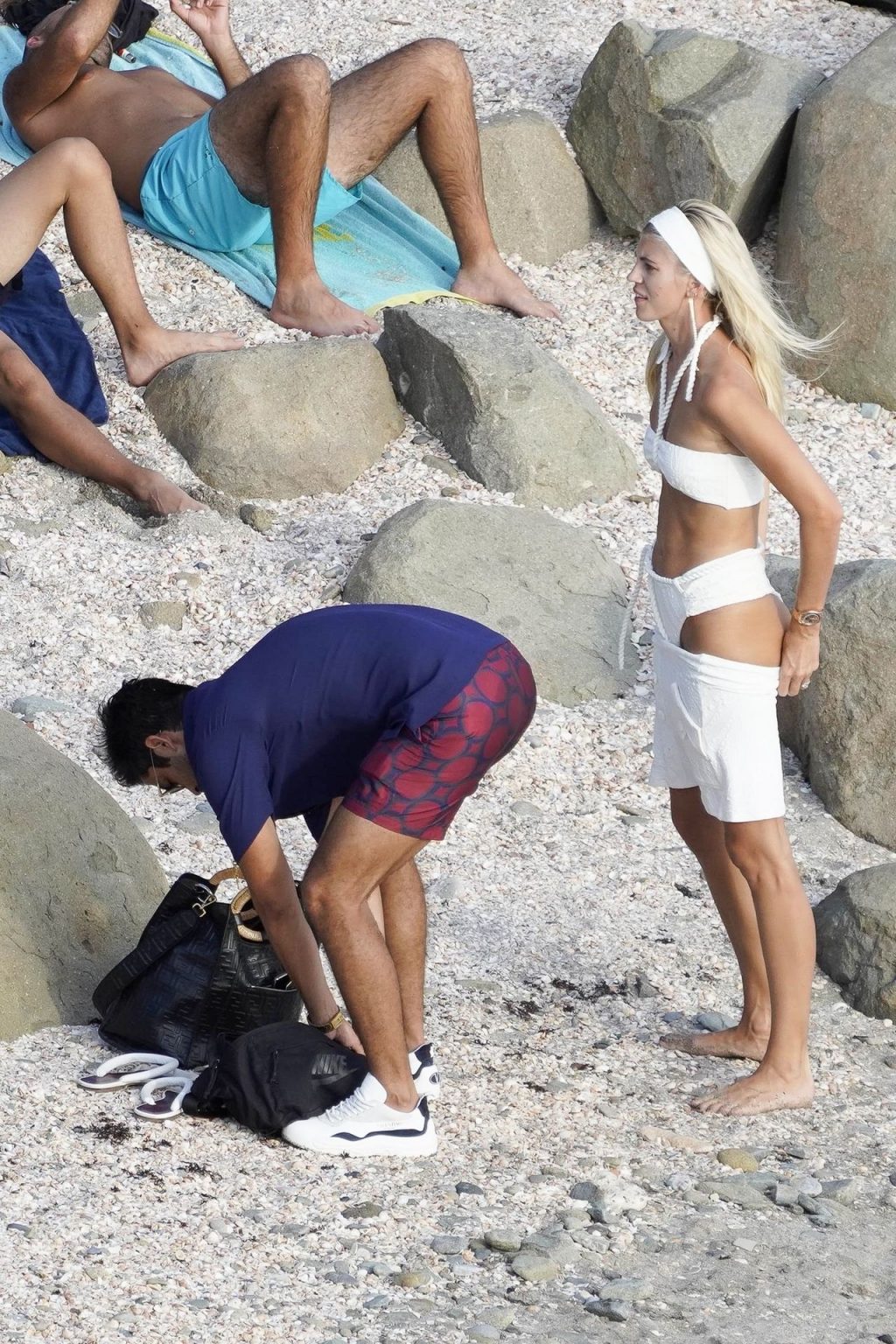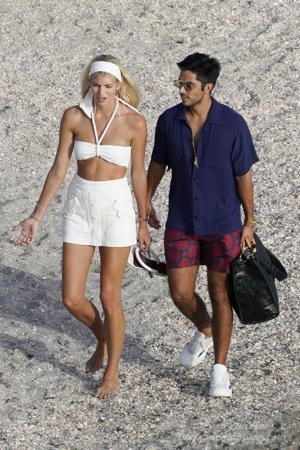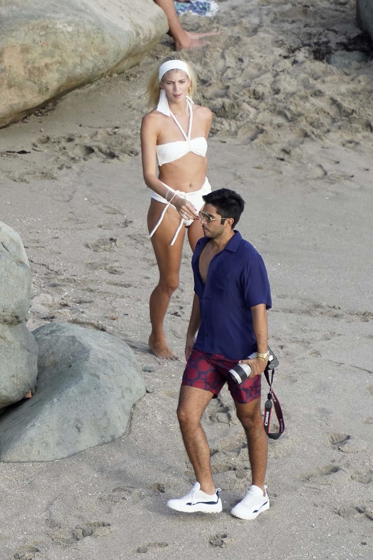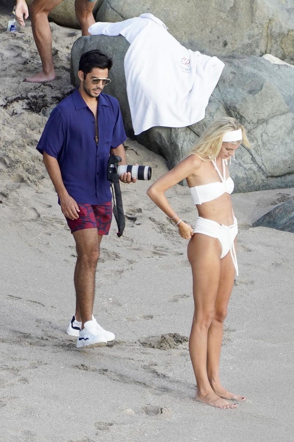 A modelo Devon Windsor exibe sua silhueta em um biquíni branco enquanto ela e seu marido Johnny Barbara comemoram o primeiro aniversário de casamento em St. Barts, 14/11/2020.
