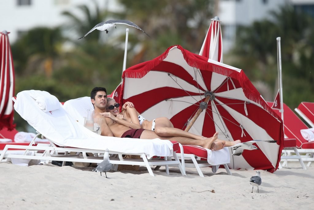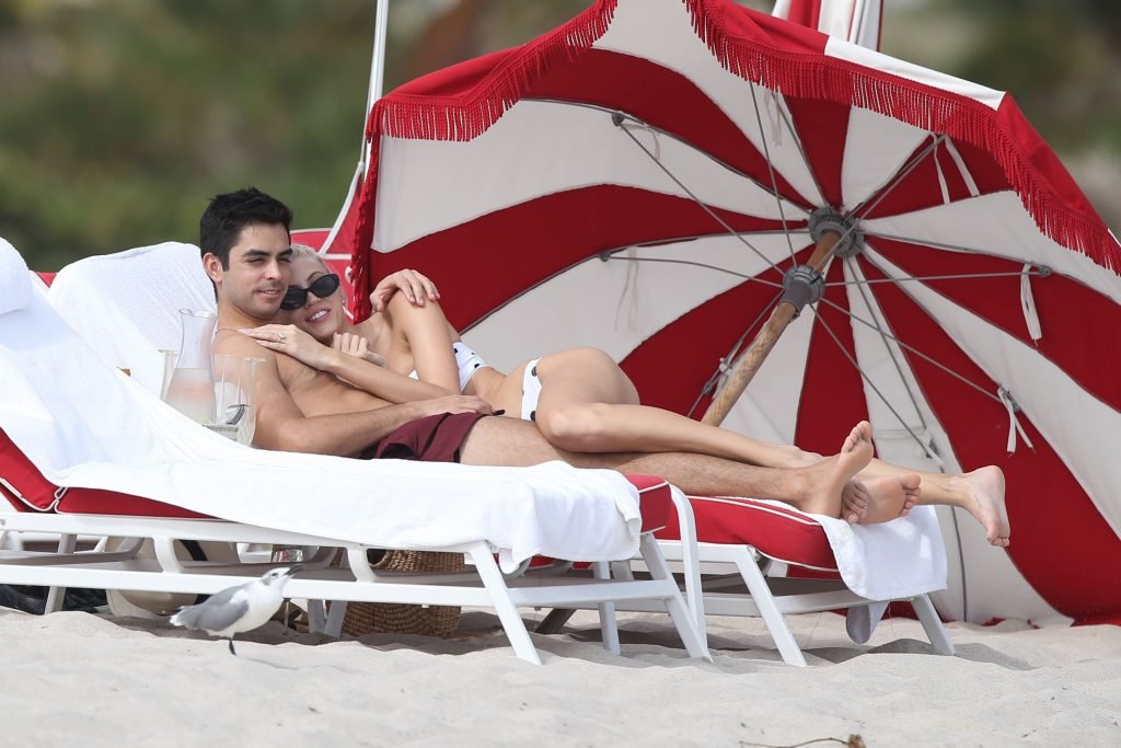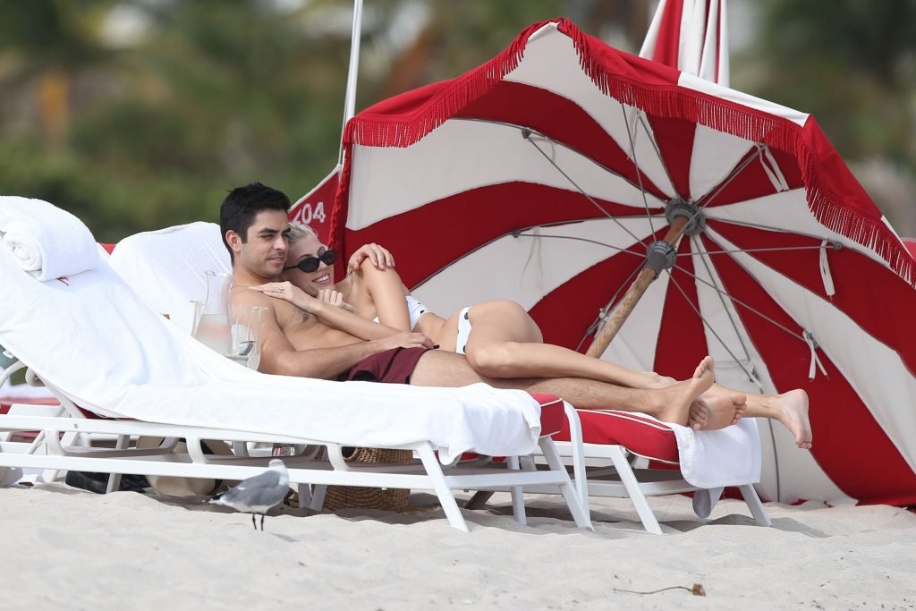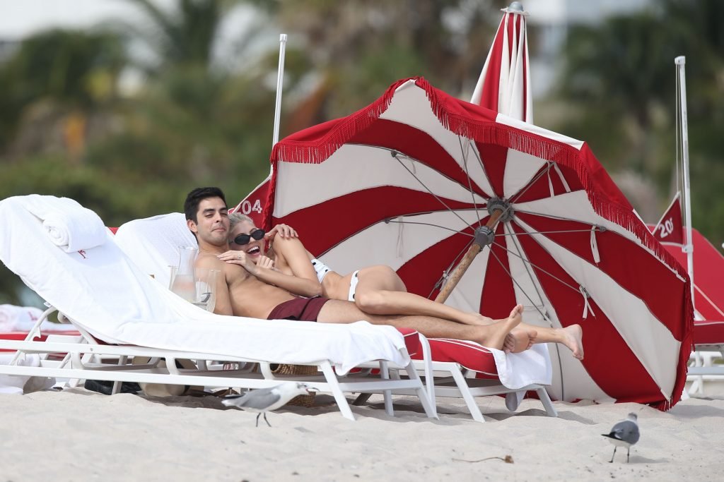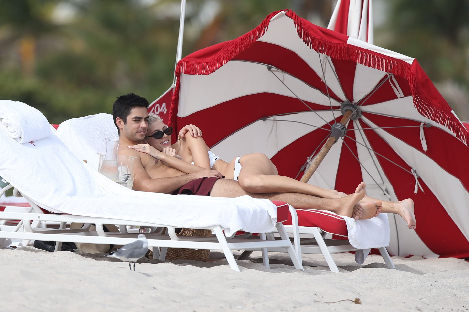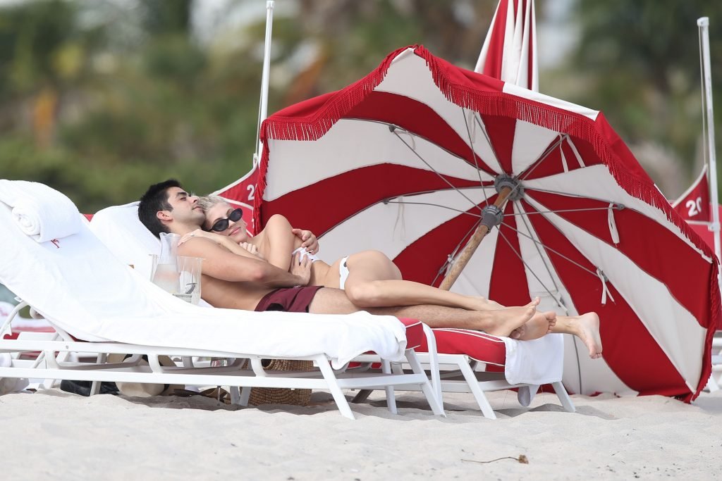 A modelo da Victoria’s Secret, Devon Windsor, exibe sua figura angelical em um biquíni bandeau preto e branco com bolinhas enquanto passa a tarde apaixonada na Miami Beach com o noivo Johnny Dex, 11/03/2018.