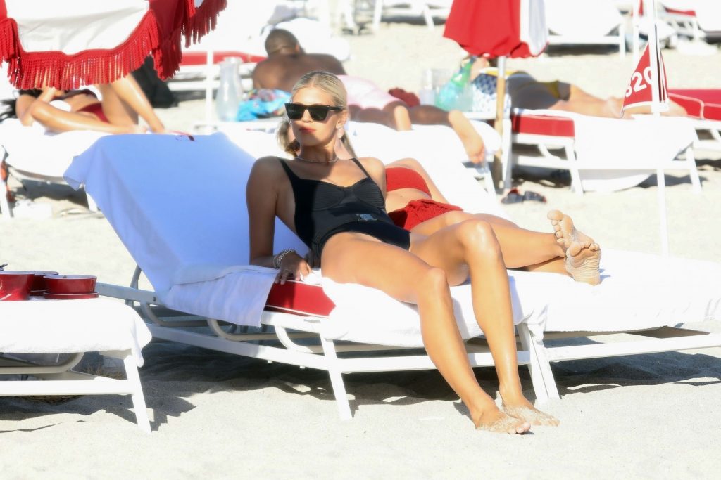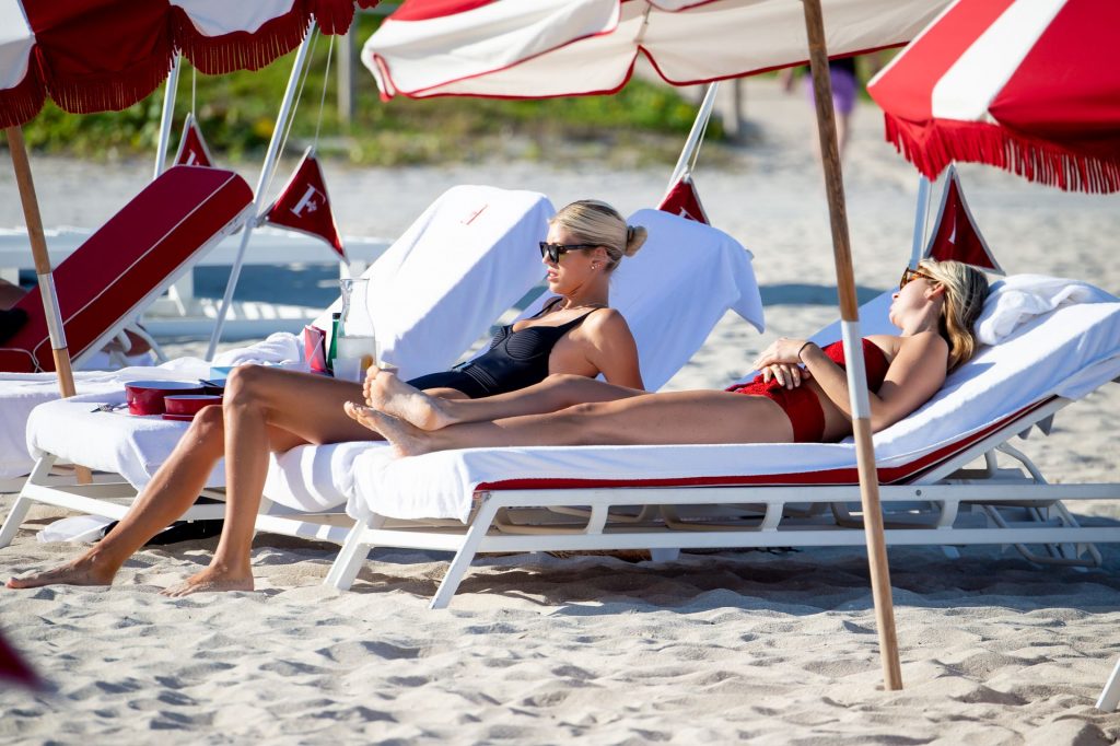 Modelos Devon Windsor e sua irmã Alexandra aproveitam um dia na praia em Miami, 01/04/2020. As duas exibiram suas figuras em forma, Devon com um maiô preto e Alexandra com um biquíni vermelho, enquanto molhavam os pés nas águas quentes e pegavam um pouco de sol nas espreguiçadeiras.