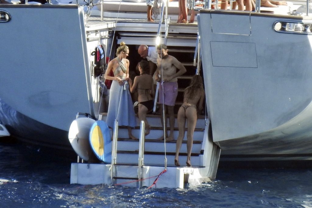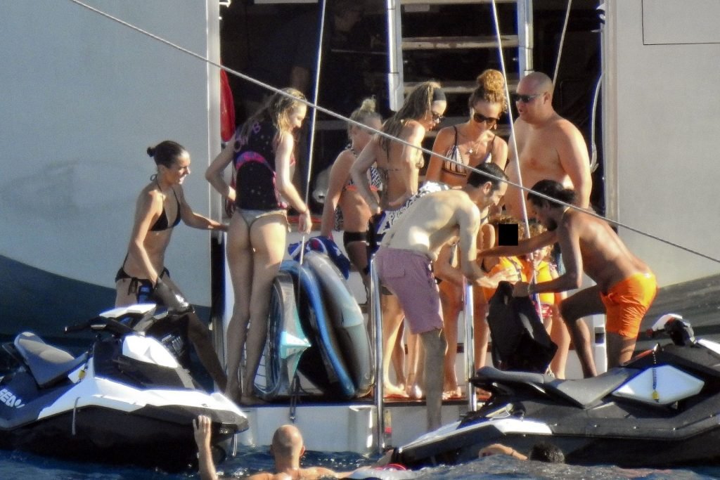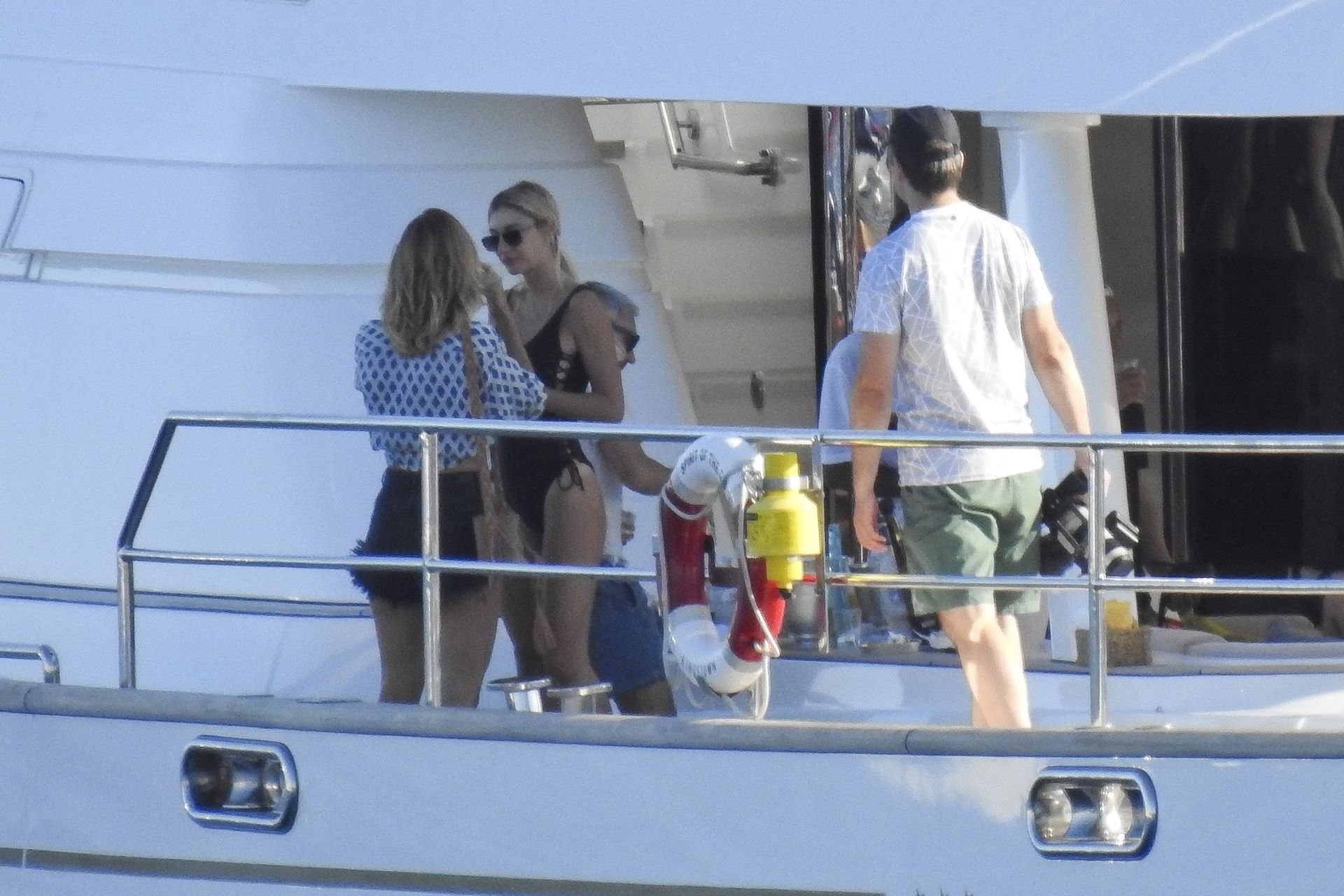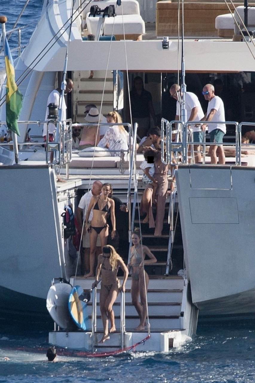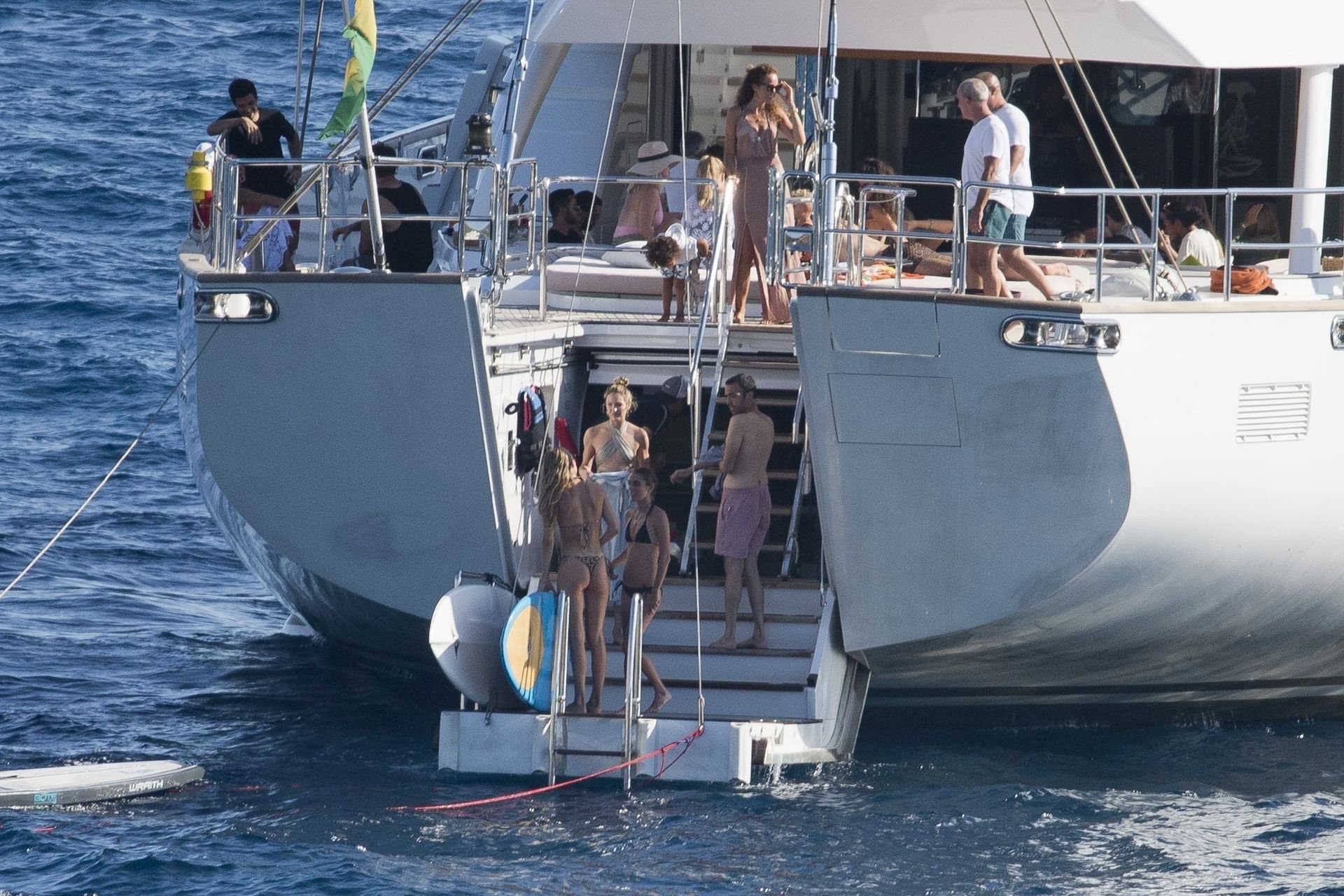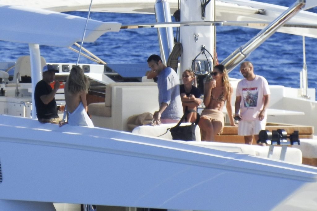 DJs Sunnery James e Ryan Marciano, o ator Glenn Powell e as supermodelos Doutzen Kroes, Candice Swanepoel, Joan Smalls começam a festa a bordo de uma embarcação de luxo em Ibiza, 14/08/2019. Também a bordo estão o produtor de cinema Mohamed al Turki e o socialite Richie Akiva.