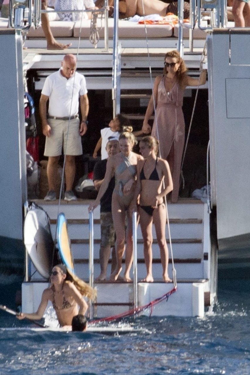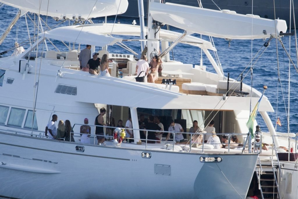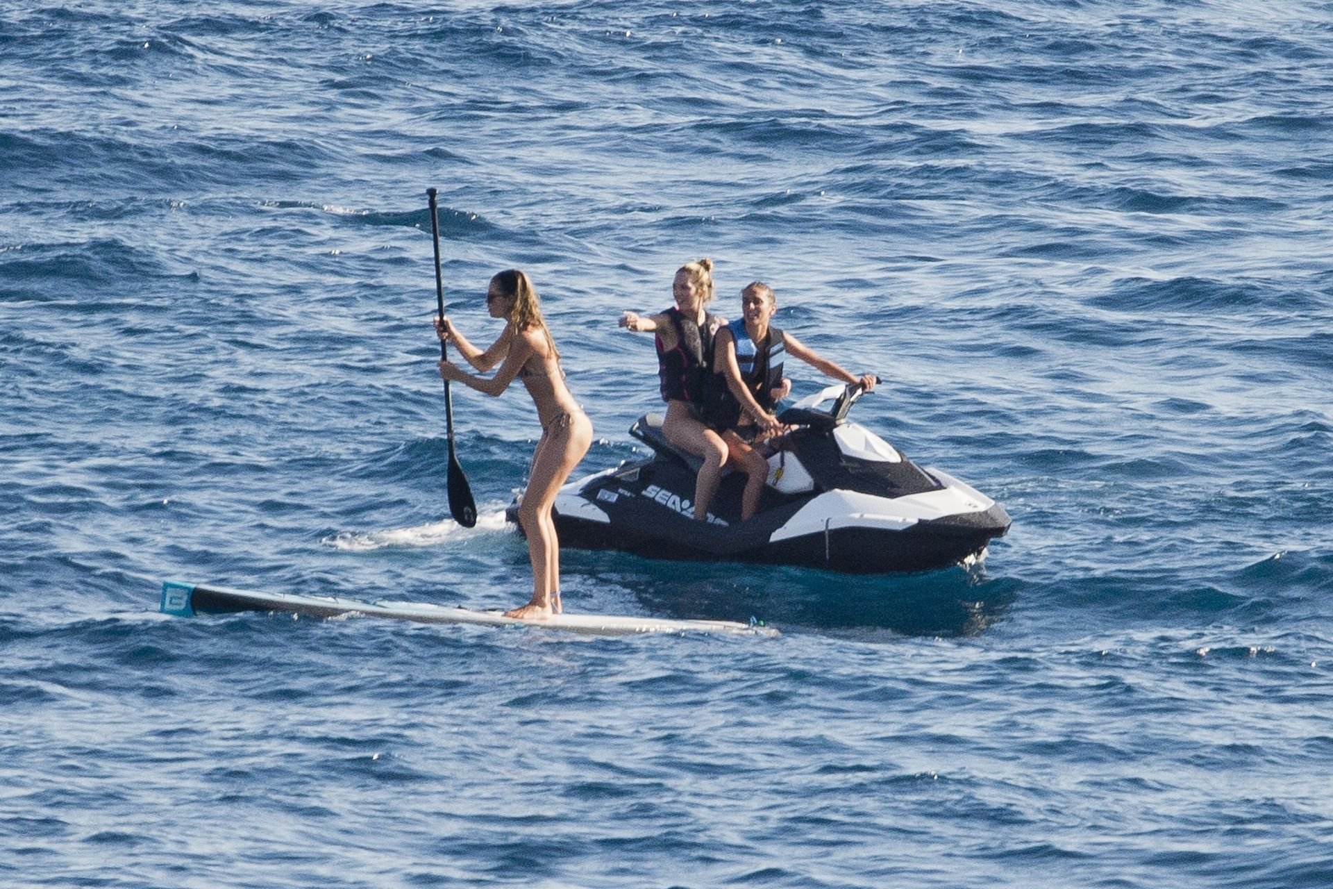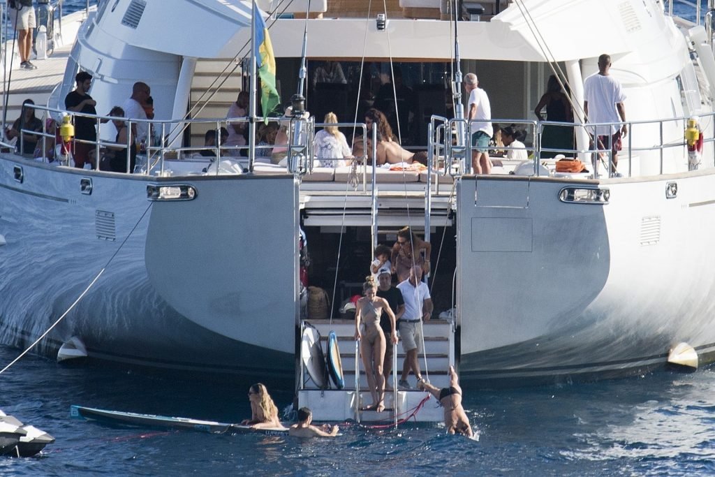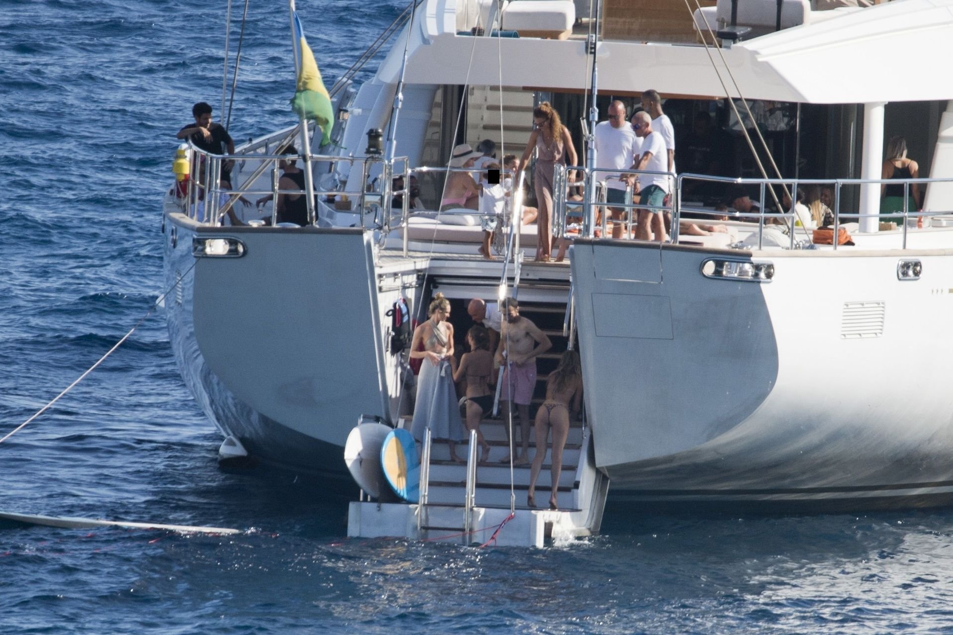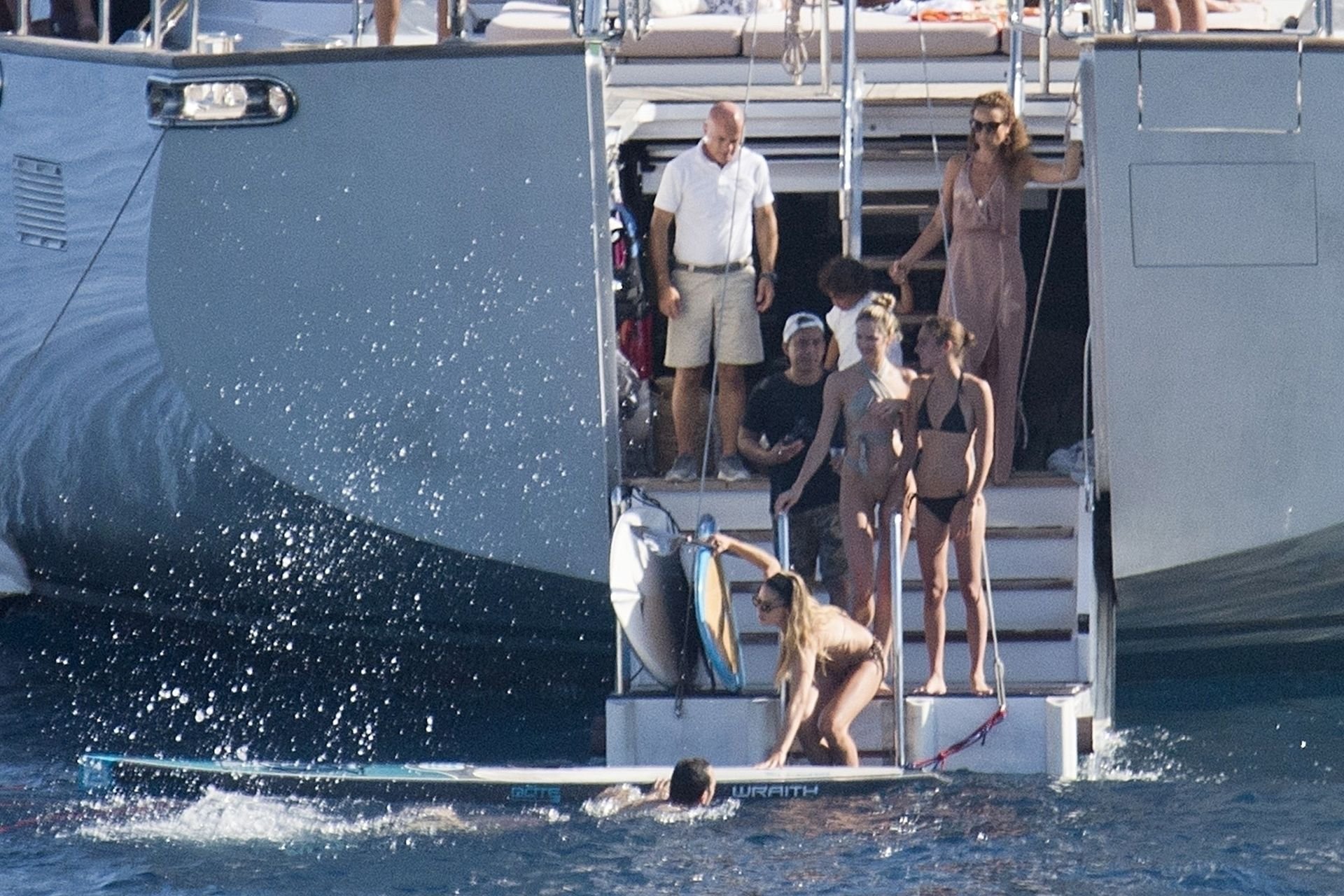 DJs Sunnery James e Ryan Marciano, o ator Glenn Powell e as supermodelos Doutzen Kroes, Candice Swanepoel, Joan Smalls começam a festa a bordo de uma embarcação de luxo em Ibiza, 14/08/2019. Também a bordo estão o produtor de cinema Mohamed al Turki e o socialite Richie Akiva.