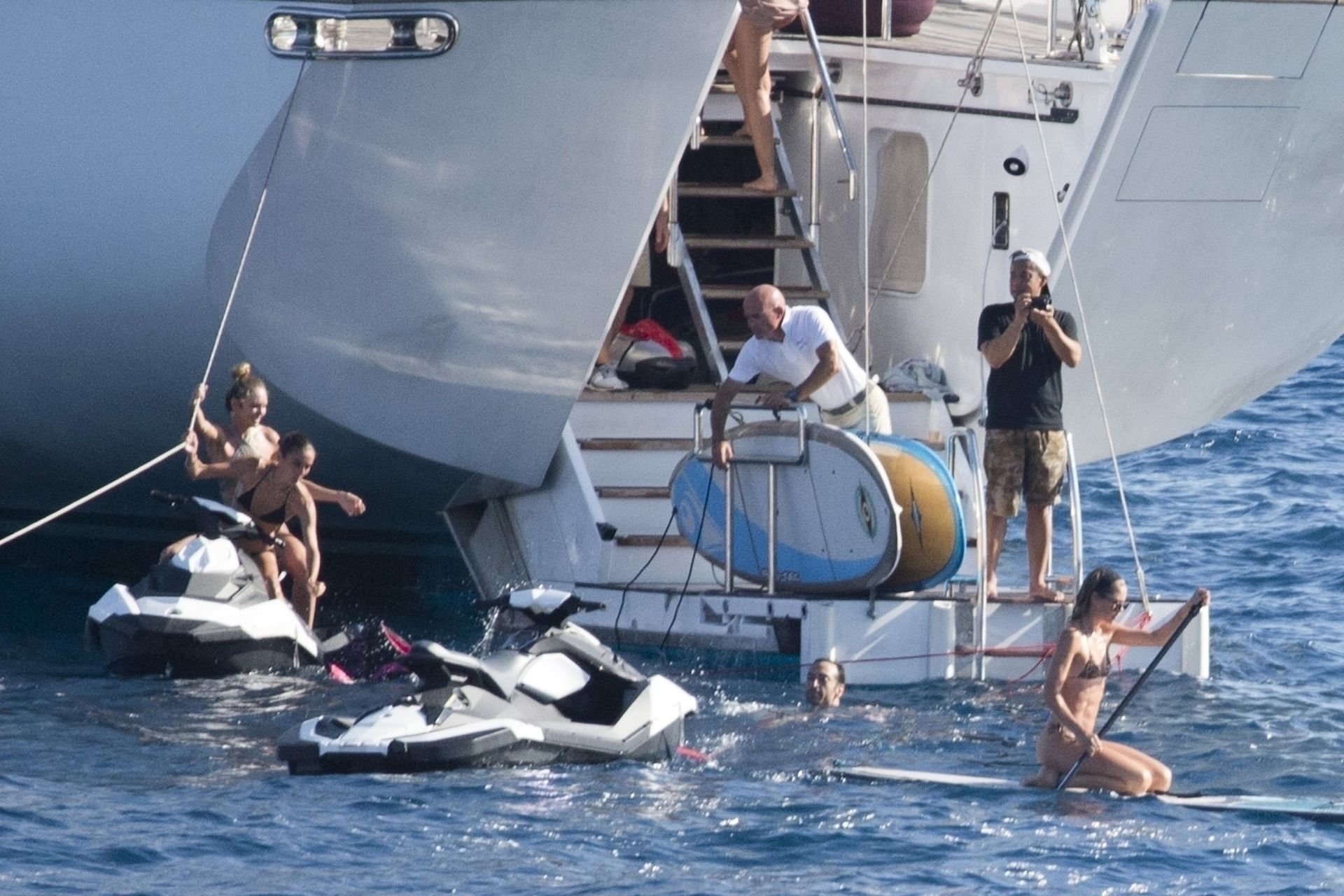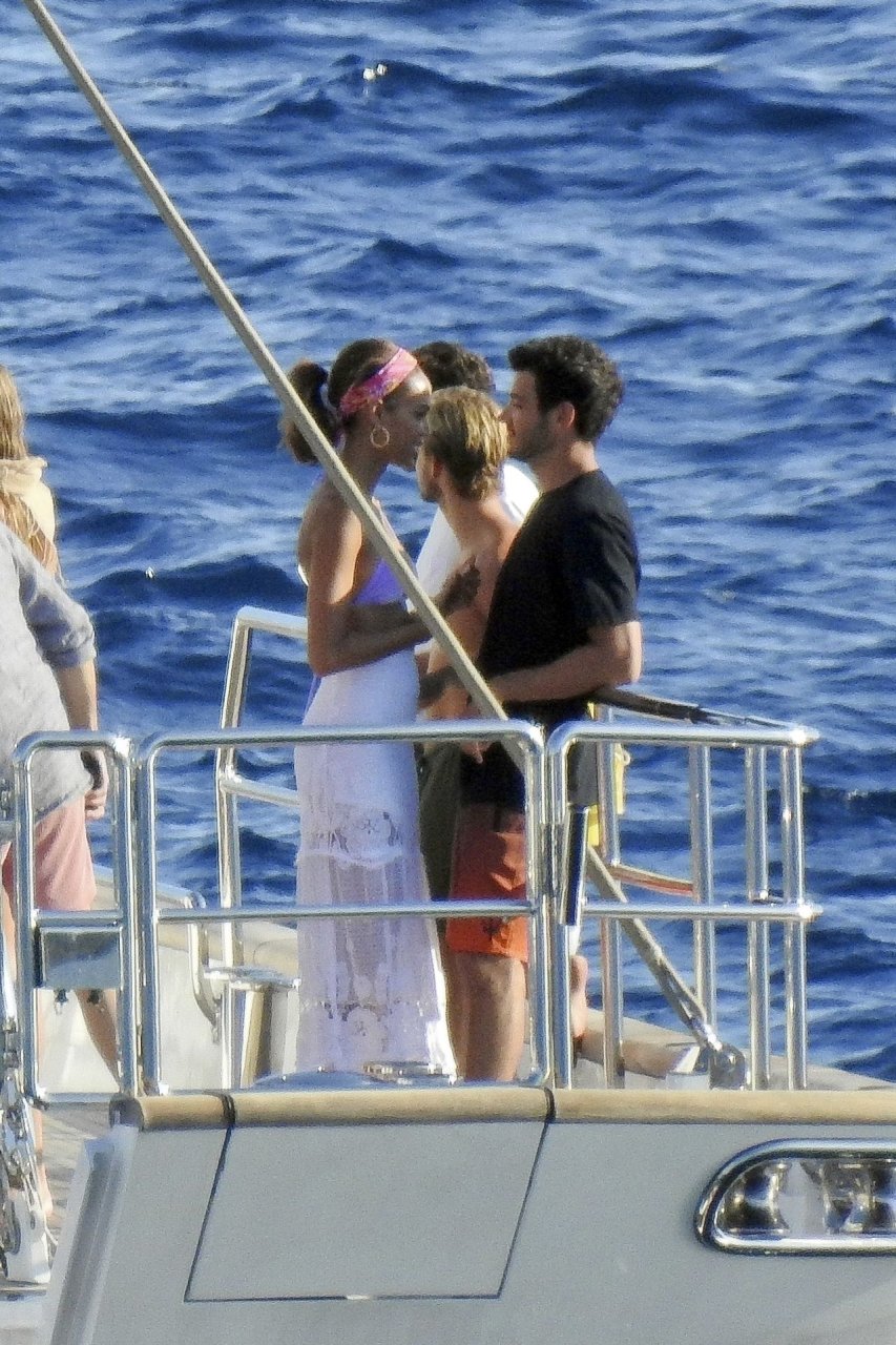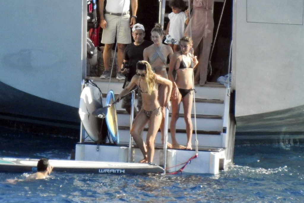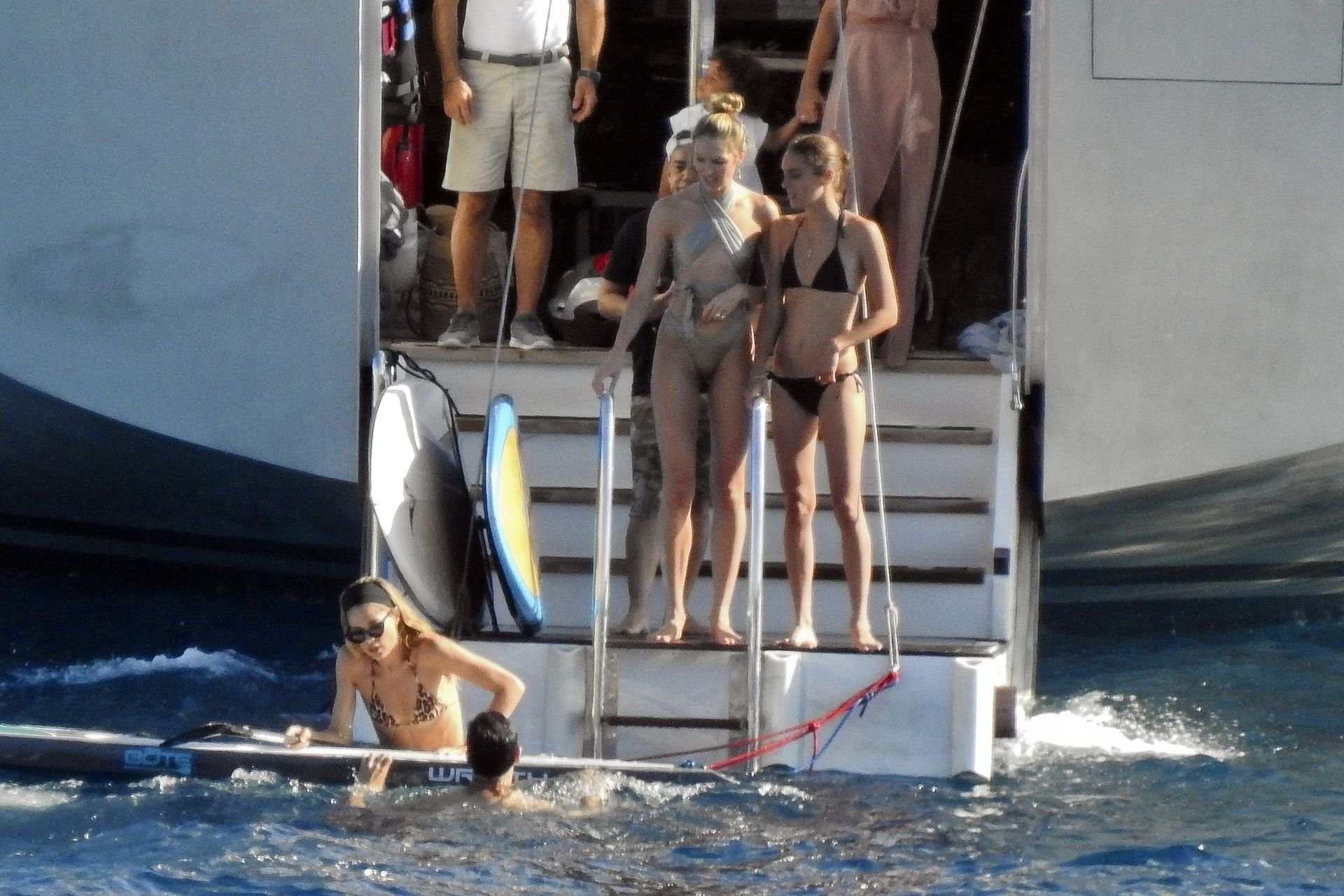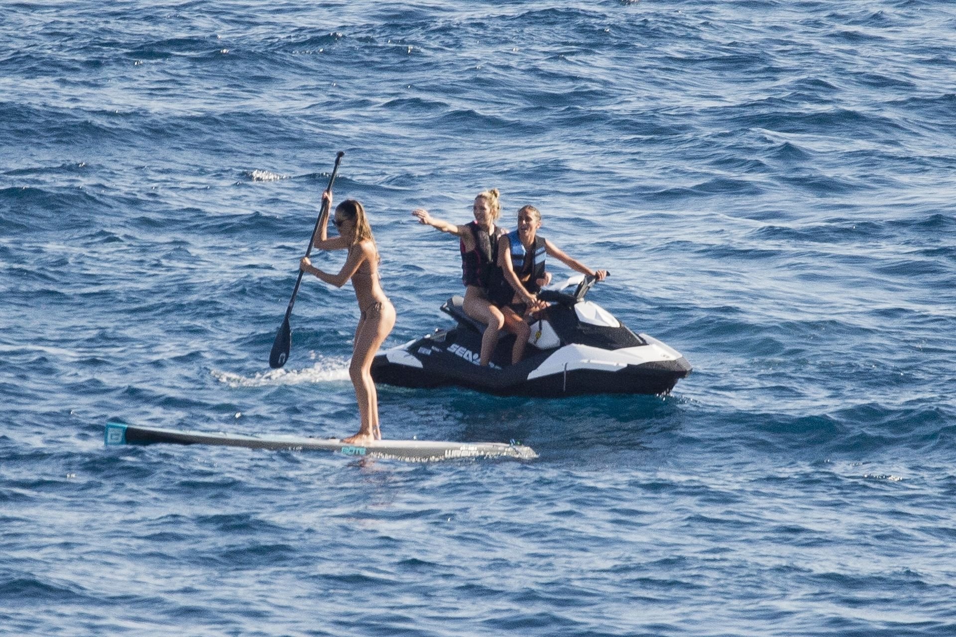 DJs Sunnery James e Ryan Marciano, o ator Glenn Powell e as supermodelos Doutzen Kroes, Candice Swanepoel, Joan Smalls começam a festa a bordo de uma embarcação de luxo em Ibiza, 14/08/2019. Também a bordo estão o produtor de cinema Mohamed al Turki e o socialite Richie Akiva.