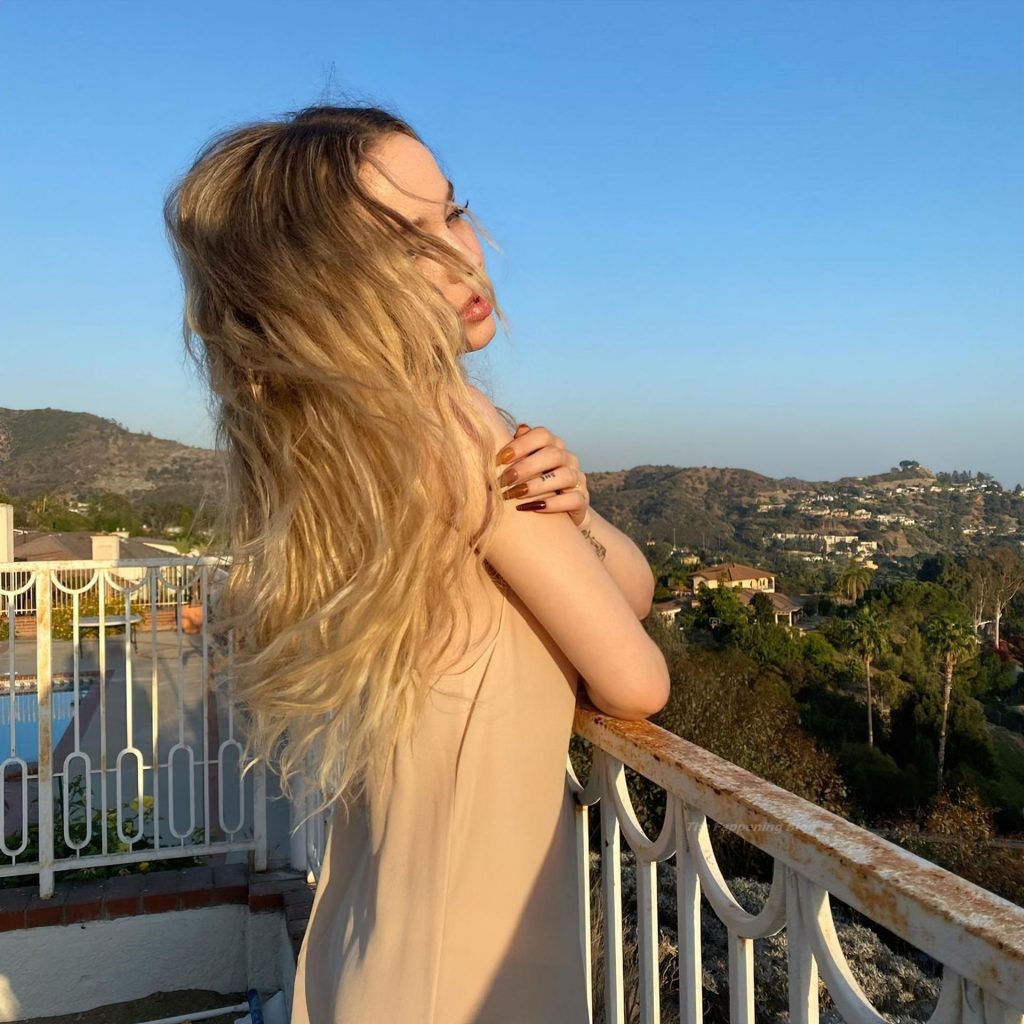 Atriz Dove Cameron está deslumbrante enquanto posa sem sutiã em um novo ensaio fotográfico na varanda – Instagram (julho de 2021). Esta censura estraga tudo…