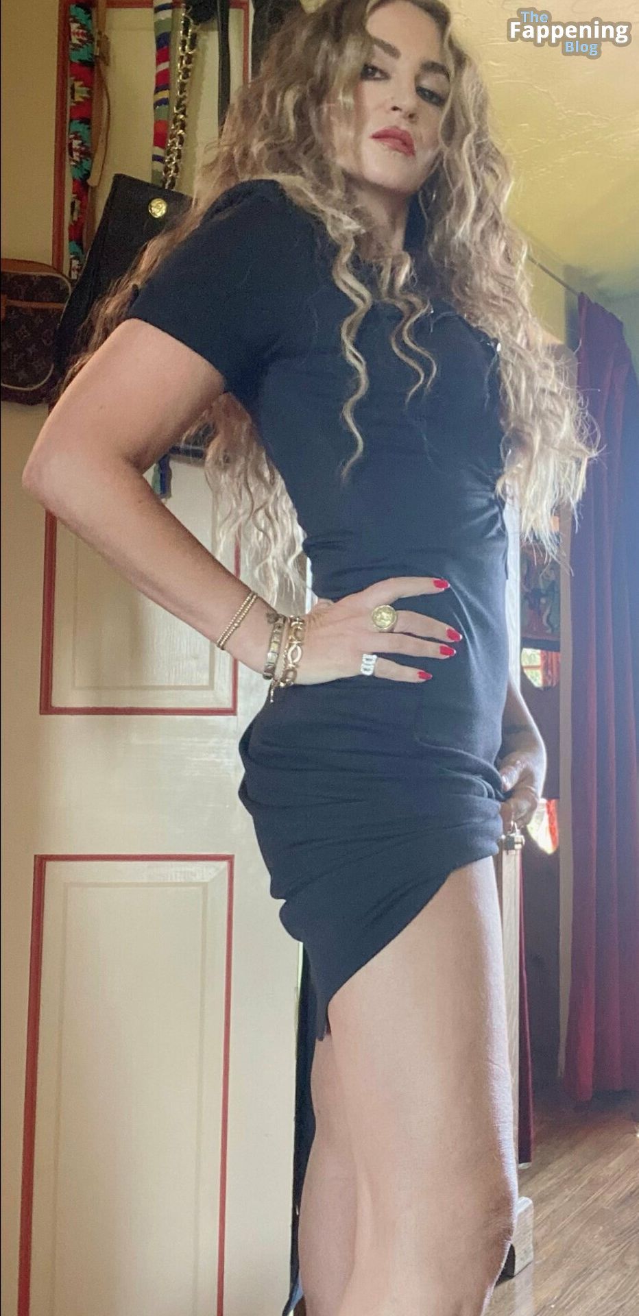Drea de Matteo está exibindo um decote incrível com seus atributos generosos e pernas tonificadas, vestindo um vestido preto pequeno e sensual com a mão em seu gatinho.
