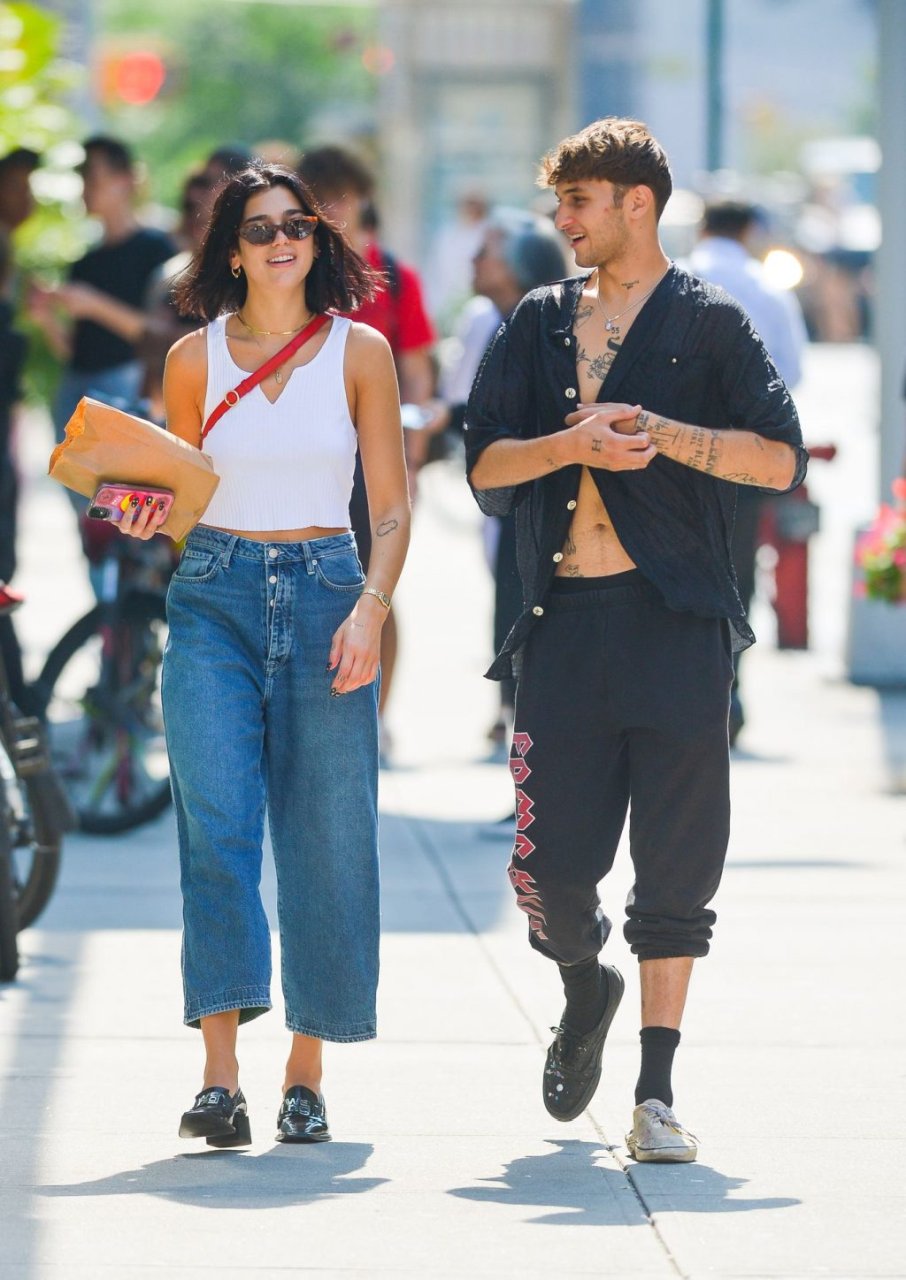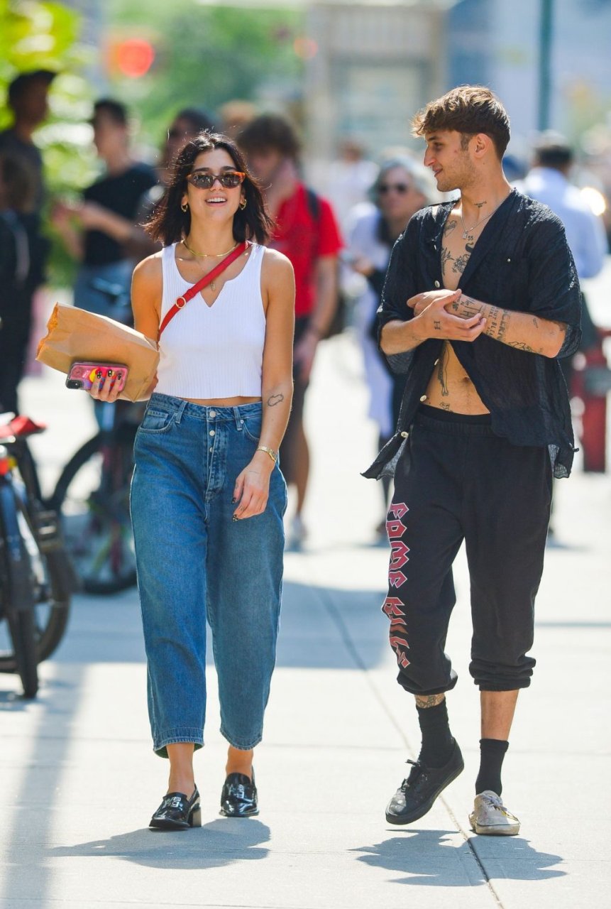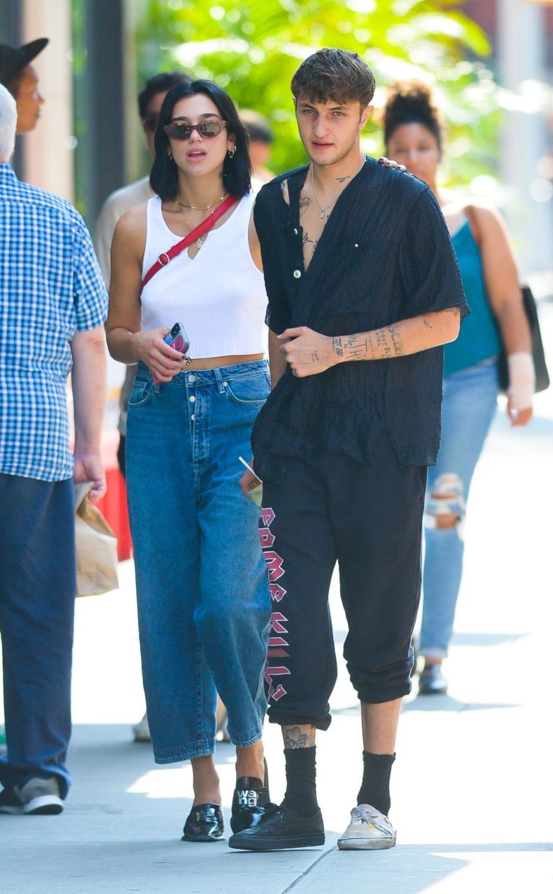 Dua Lipa e Anwar Hadid exibem carinho em público na cidade de Nova York, 11/09/2019. A cantora de 24 anos usava um top branco que mostrava a barriga combinado com jeans de pernas largas e mocassins de couro verniz. O modelo de 20 anos usava uma camisa preta desabotoada combinada com calças de moletom pretas e dois sapatos diferentes.