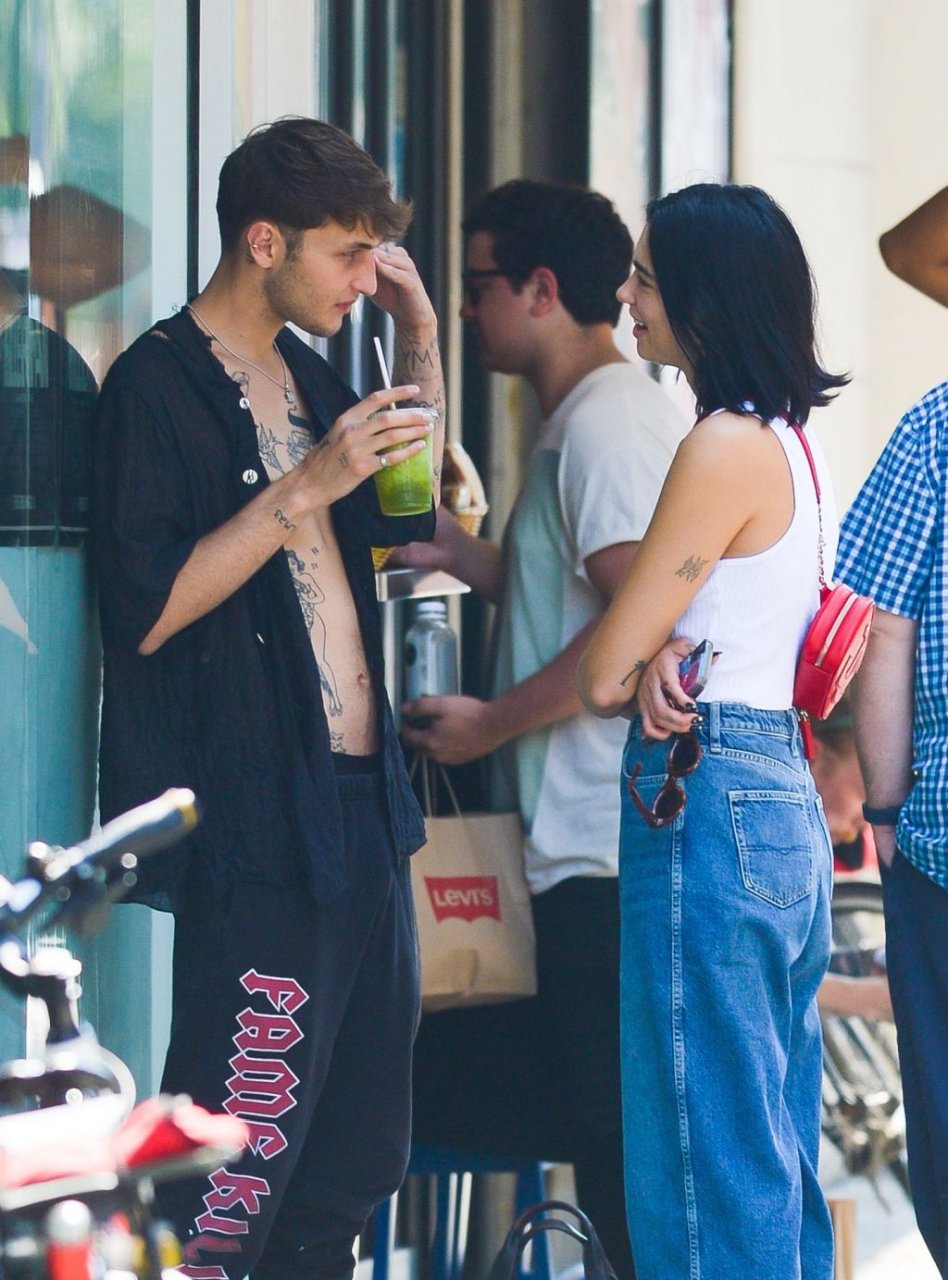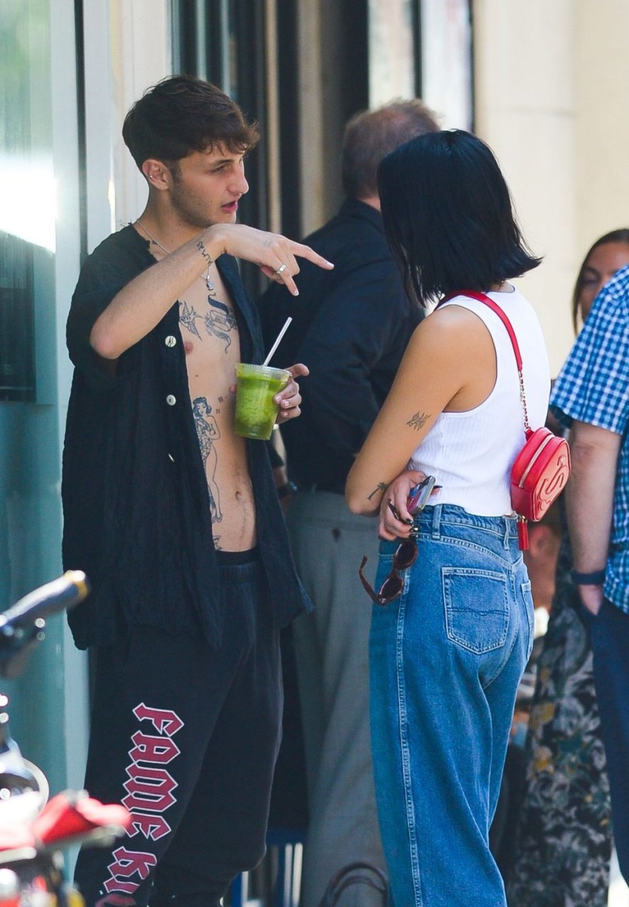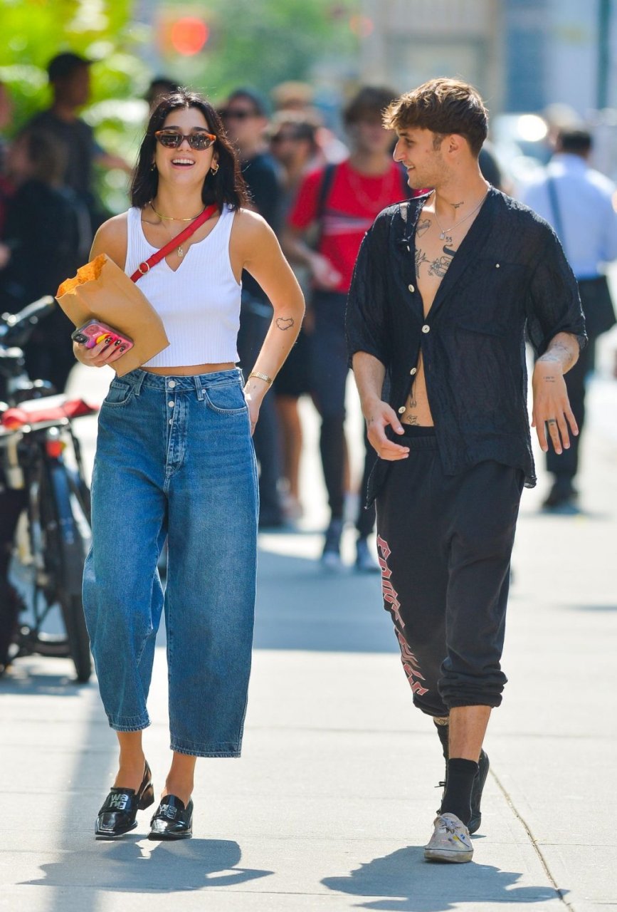 Dua Lipa e Anwar Hadid exibem carinho em público na cidade de Nova York, 11/09/2019. A cantora de 24 anos usava um top branco que mostrava a barriga combinado com jeans de pernas largas e mocassins de couro verniz. O modelo de 20 anos usava uma camisa preta desabotoada combinada com calças de moletom pretas e dois sapatos diferentes.