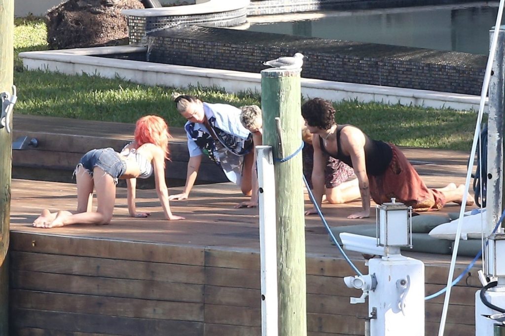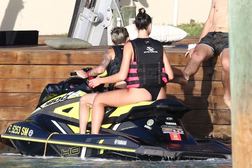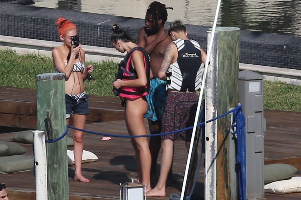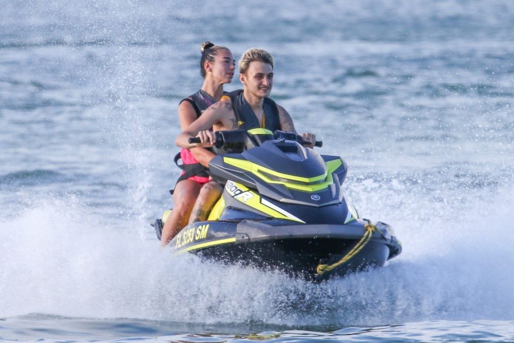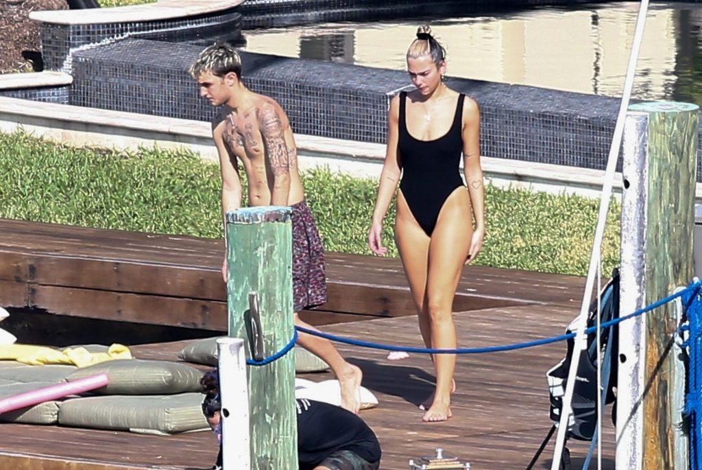 É sexta-feira… a cantora Dua Lipa e o namorado Anwar Hadid estão começando o fim de semana com yoga e diversão de jetski em Miami com amigos, 01/03/2020.