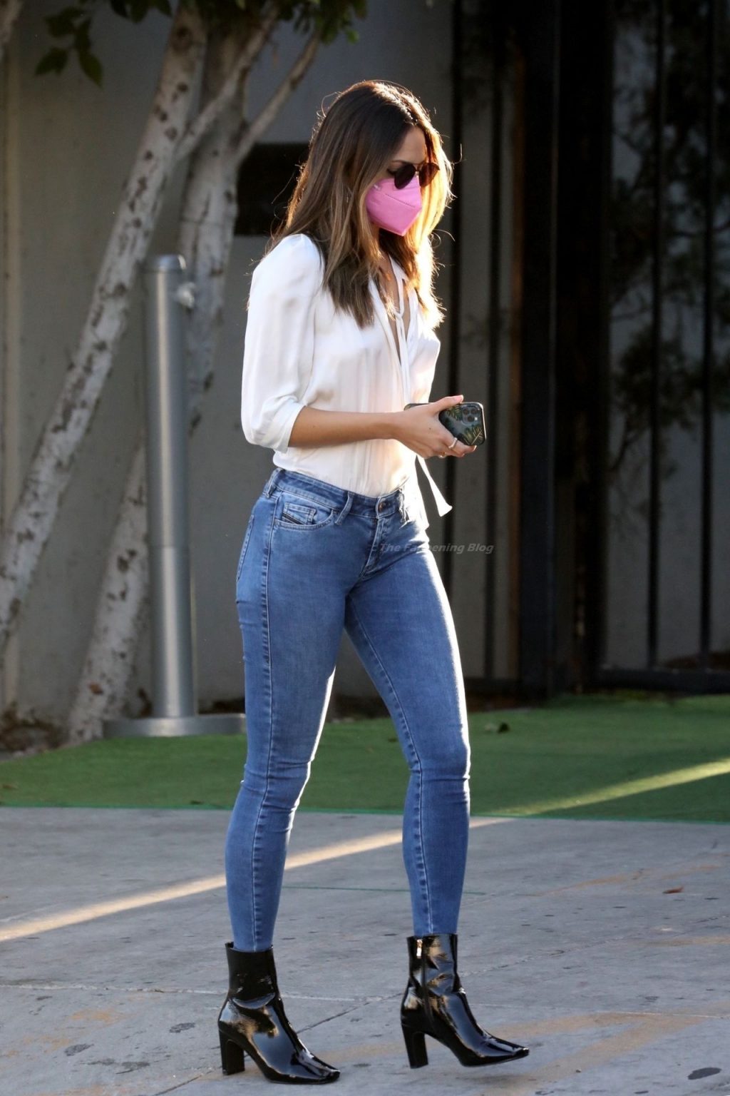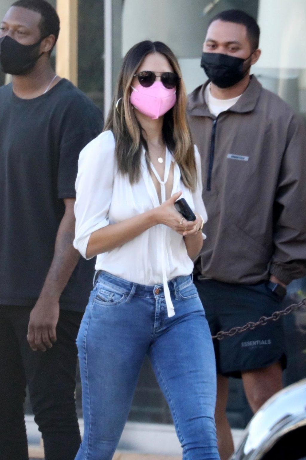 Atriz Eiza Gonzalez é vista saindo do 40 Love neste início de noite após passar um tempo com alguns amigos durante um jantar cedo no pub, 03/04/2021. Eiza usava uma máscara rosa vibrante promovendo o uso contínuo de máscaras.