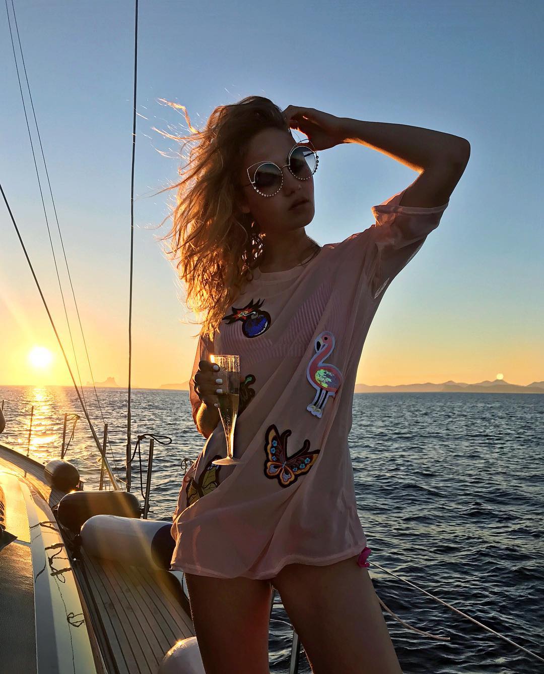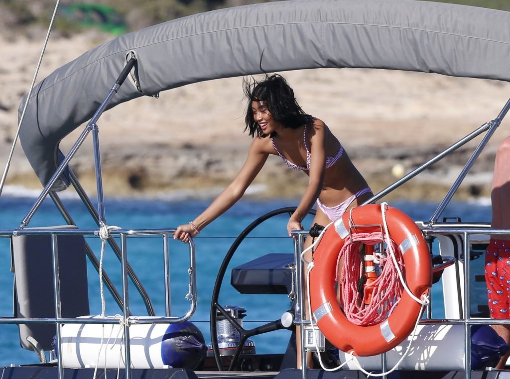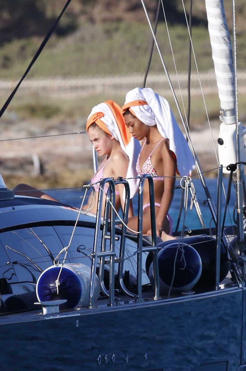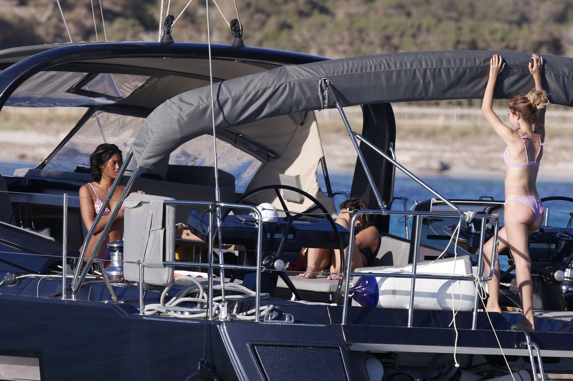 Modelos Elena Carriere, Anuthida Ploypetch, Rosa Crespo e outras garotas se divertindo em Formentera durante um dia em um barco, 16/06/2017.