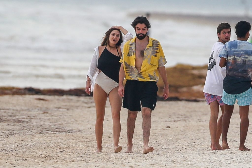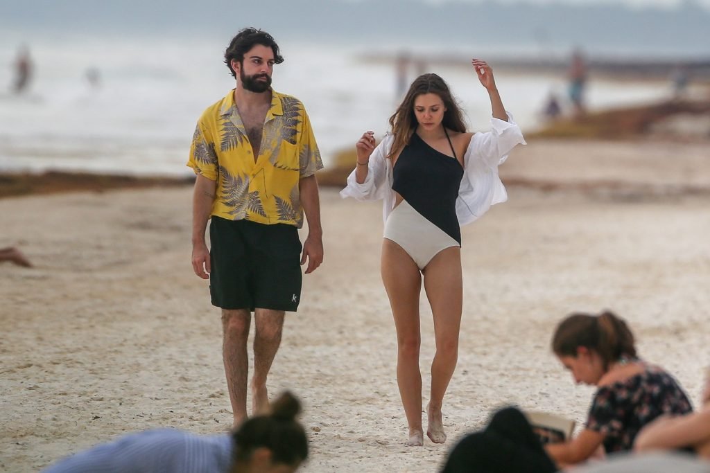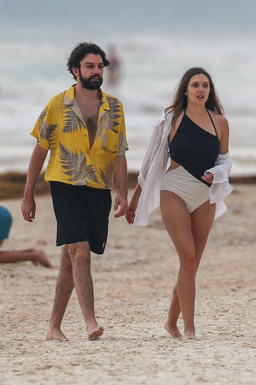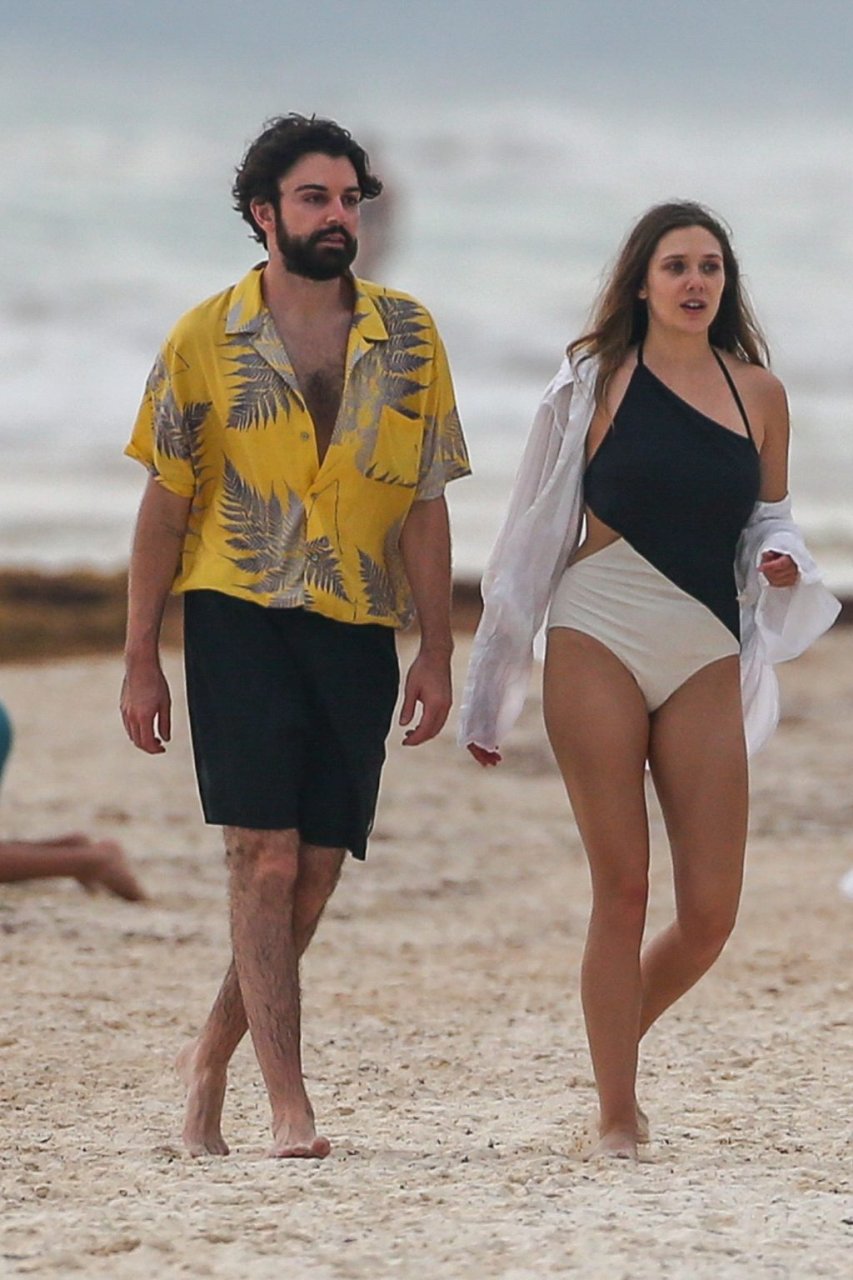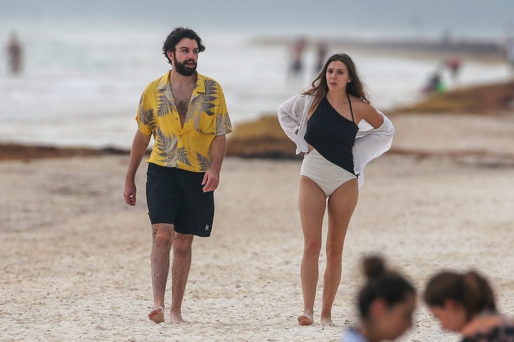 A atriz americana Elizabeth Olsen (29) foi vista usando um maiô preto e branco com o namorado Robbie Arnett na praia no México, 28/07/2018.