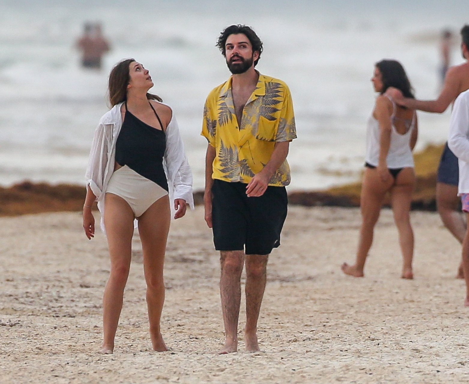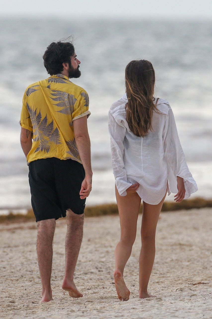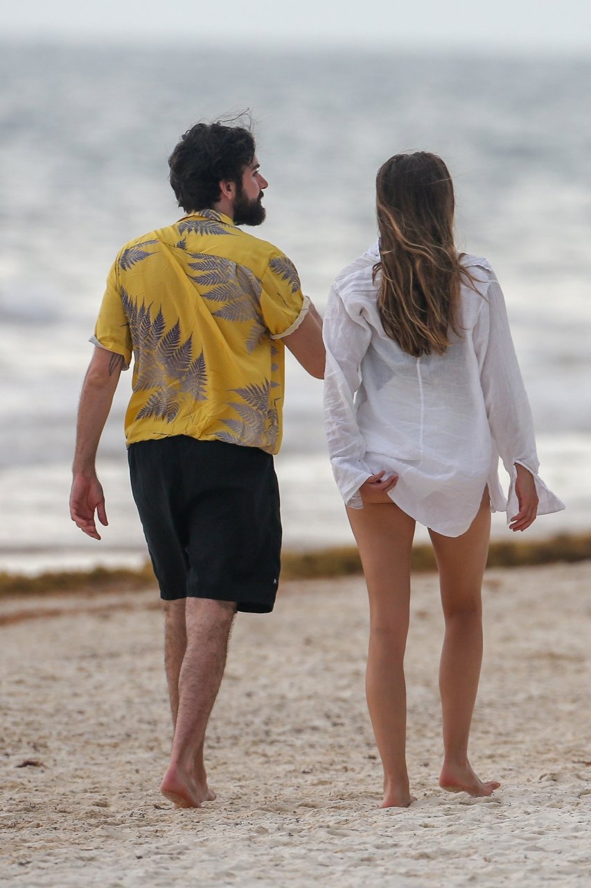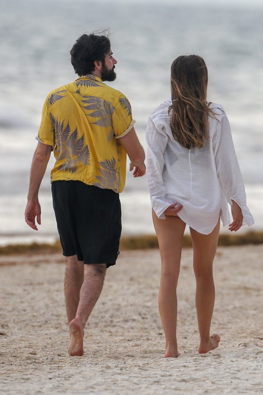 A atriz americana Elizabeth Olsen (29) foi vista usando um maiô preto e branco com o namorado Robbie Arnett na praia no México, 28/07/2018.