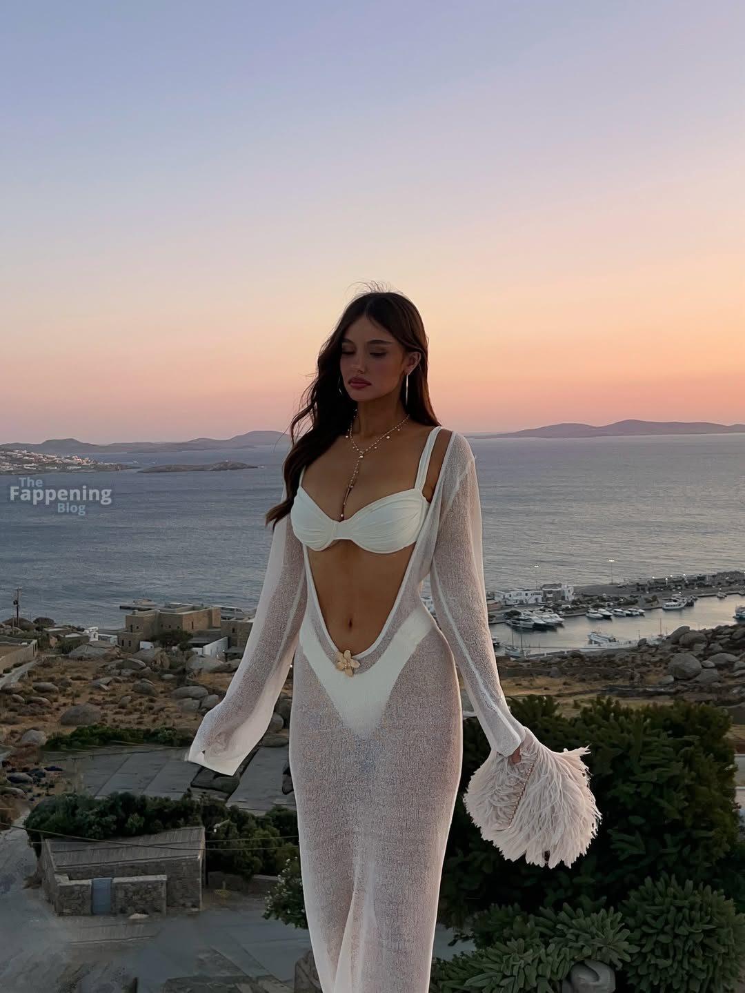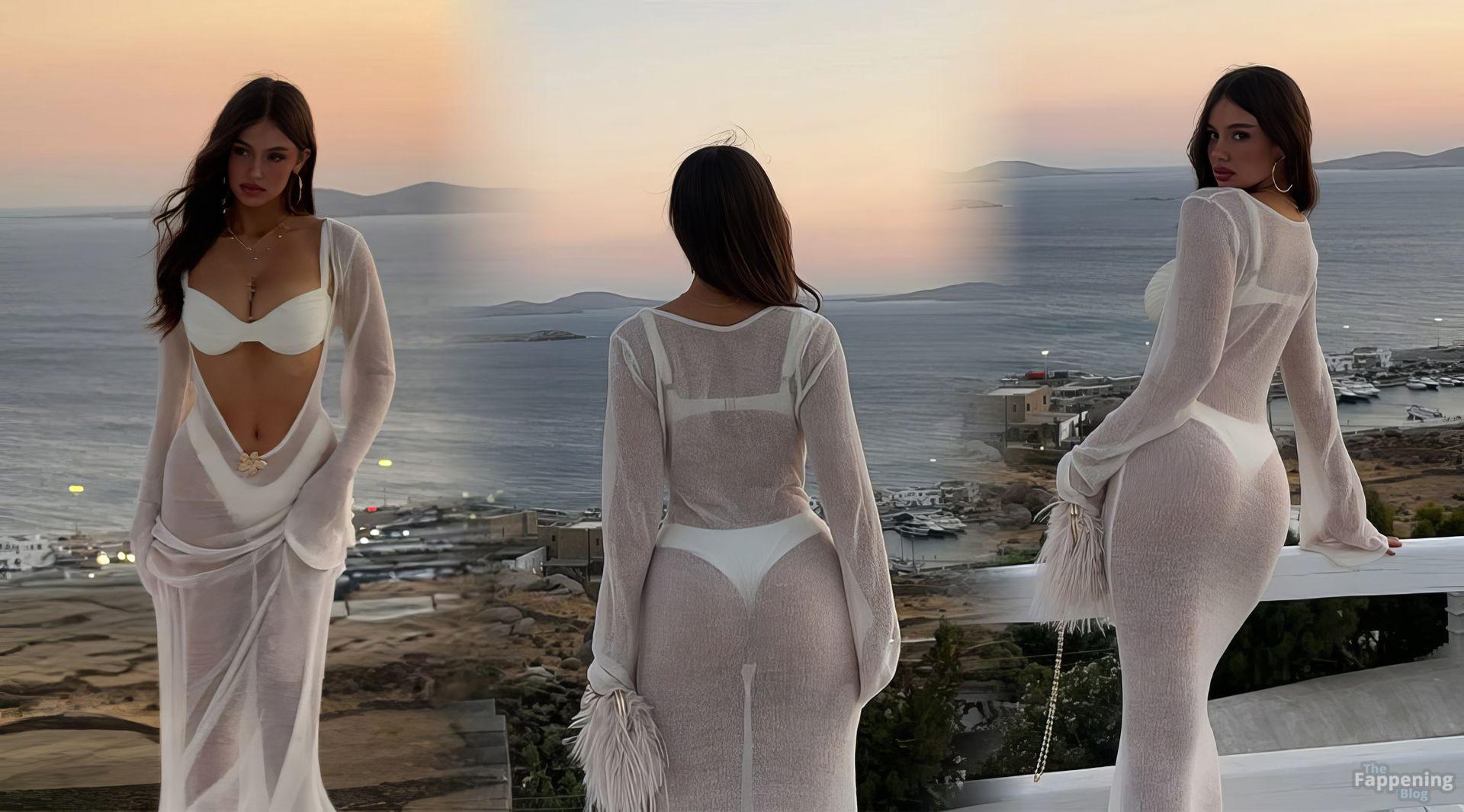 A estrela australiana do TikTok, Ella Cervetto, está mostrando sua figura sexy com um vestido branco transparente sobre um biquíni, exibindo looks deslumbrantes em um ensaio fotográfico ao pôr do sol à beira-mar.