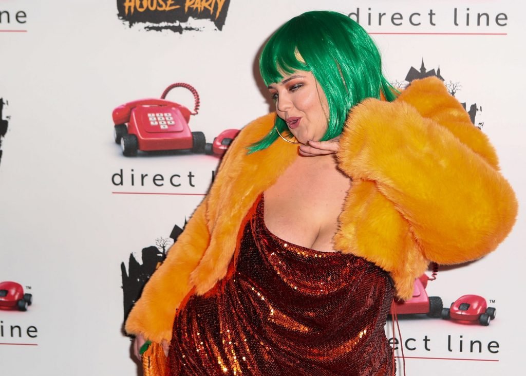 A participante de “The Circle”, Ella May, exibiu seu decote, usando uma peruca verde na Festa da Casa Assombrada KISS na SSE Arena, Wembley, 25/10/2019.