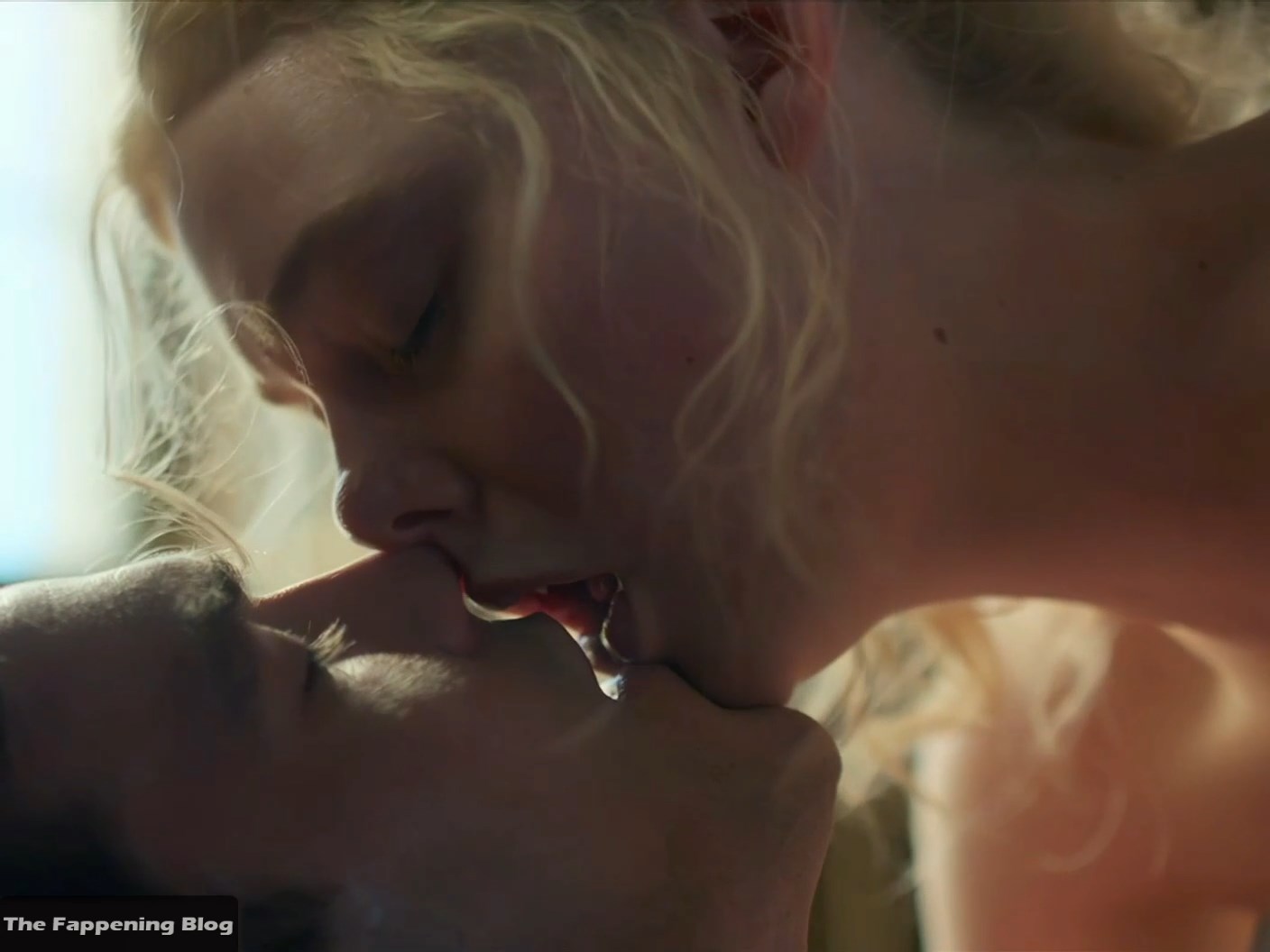 Elle Fanning está se beijando com um rapaz e abrindo seu corpete antes que o rapaz levante suas roupas íntimas sobre a cabeça dela. O rapaz então a carrega para sentá-la em uma mesa enquanto vemos o seio esquerdo dela algumas vezes enquanto ela e o rapaz fazem sexo com o braço de Elle ao redor dele.