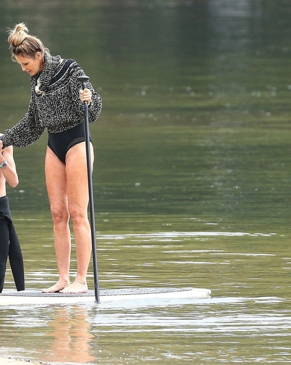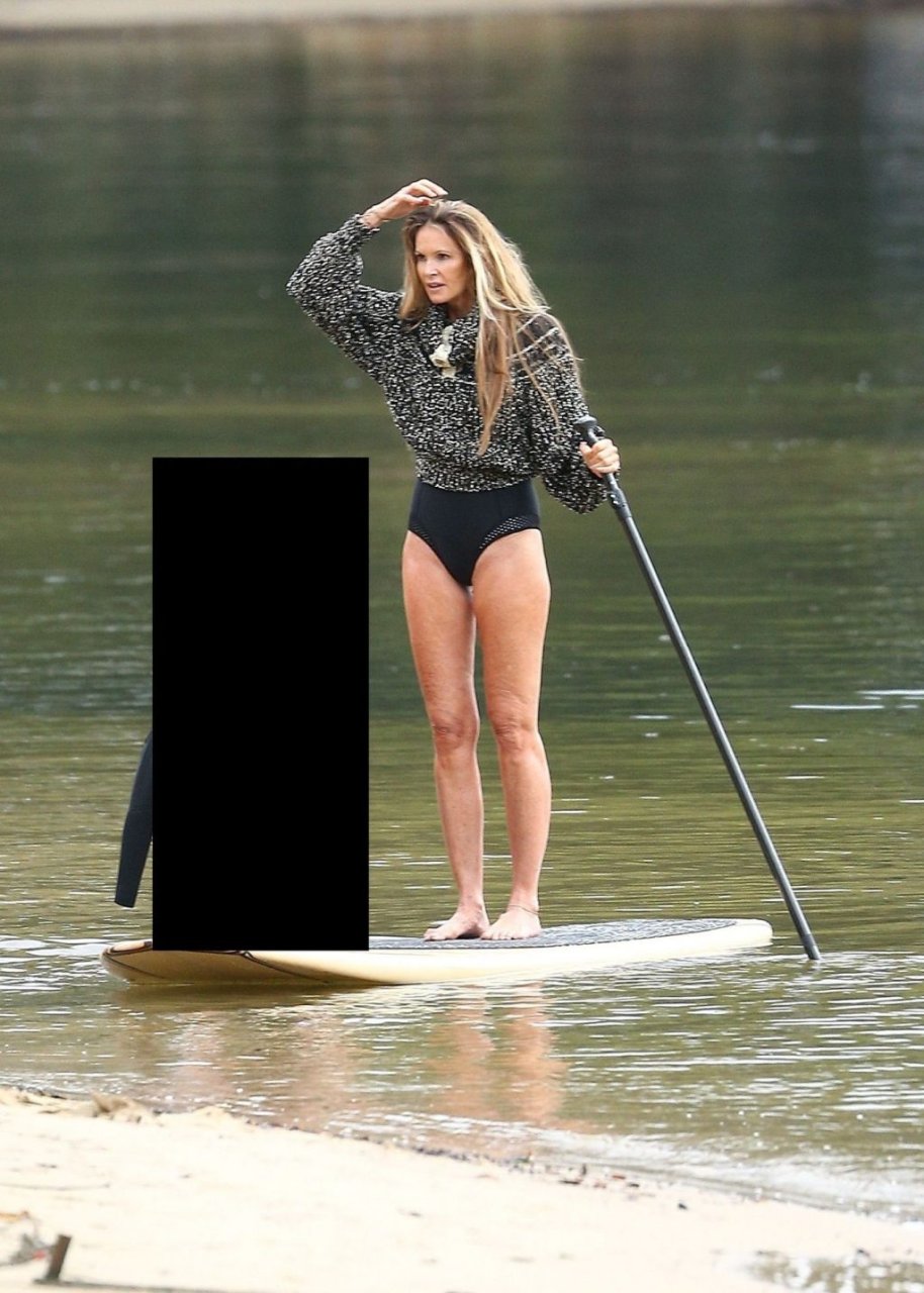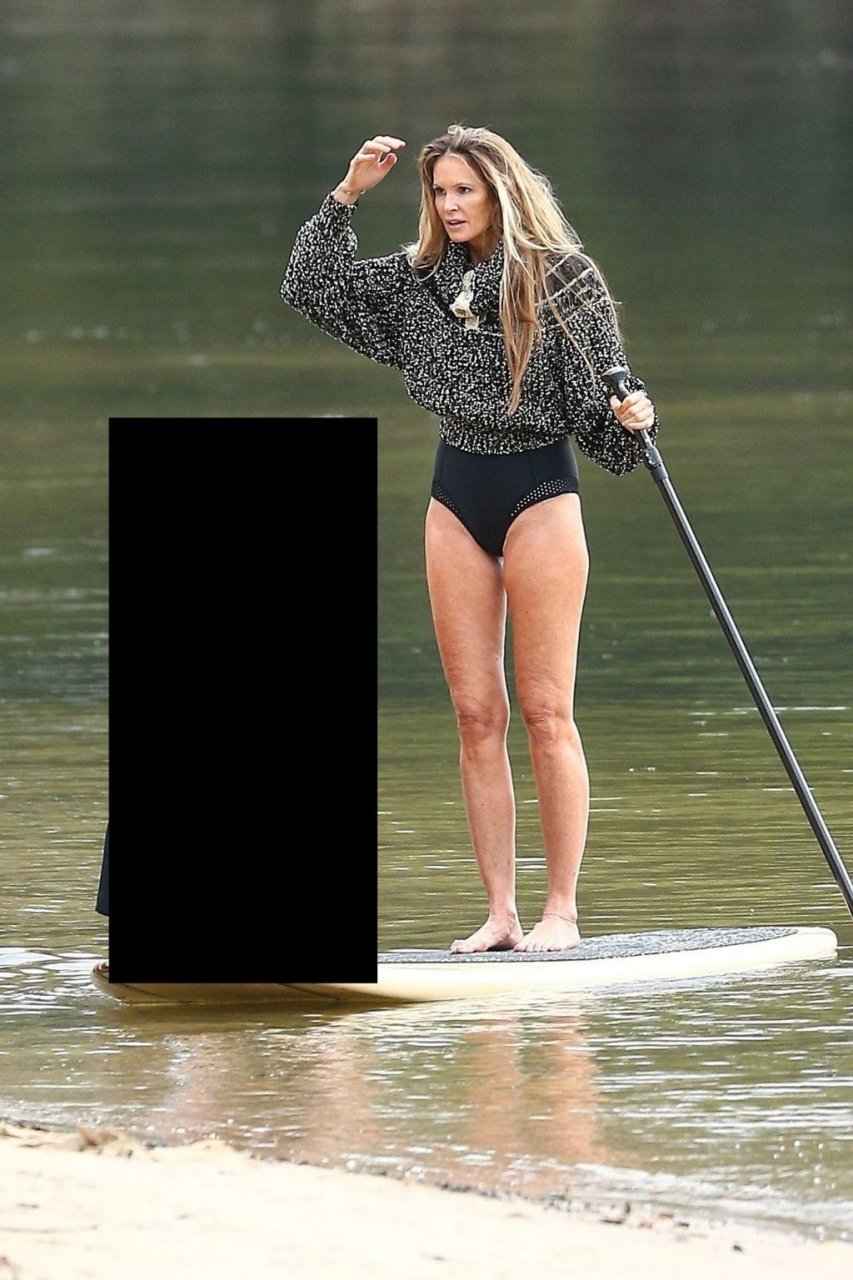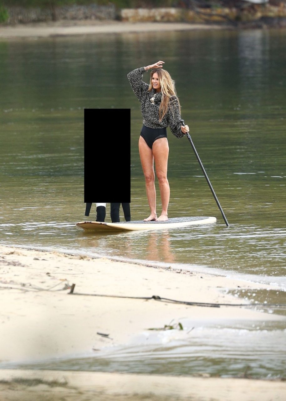 Elle Macpherson com seus dois filhos Cy Busson e Flynn Busson são vistos durante uma sessão de fotos para um anúncio de coleções de marcas em Sydney, Austrália, 19/03/2019. Elle, que fará 55 anos em 29 de março, parecia incrível enquanto exibia suas pernas esbeltas posando em uma prancha de stand-up paddle. A modelo estava de ótimo humor durante a sessão.