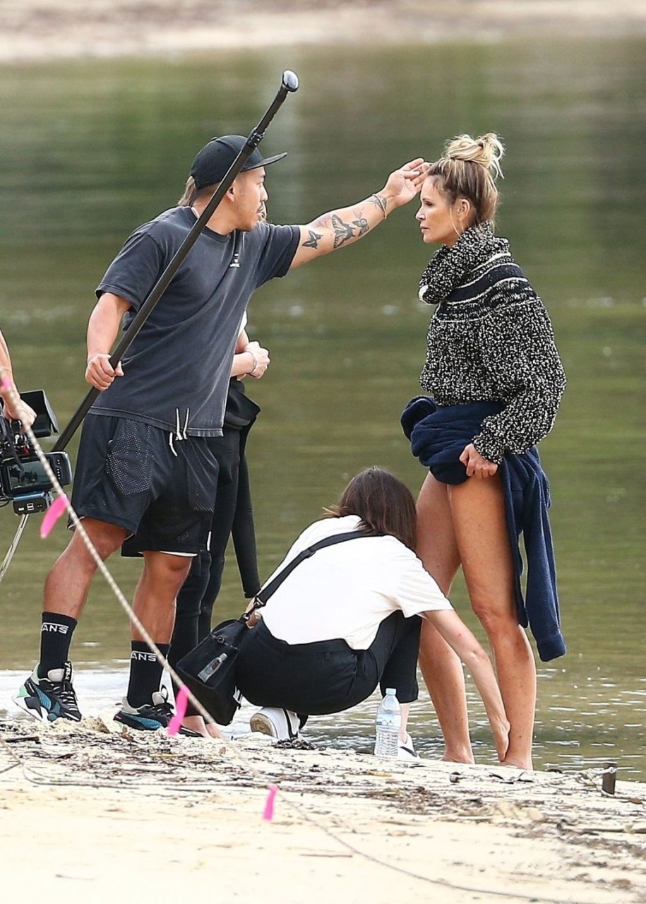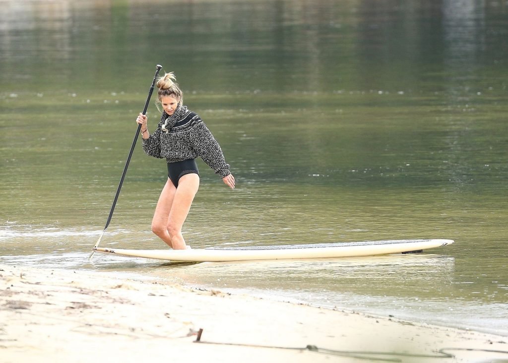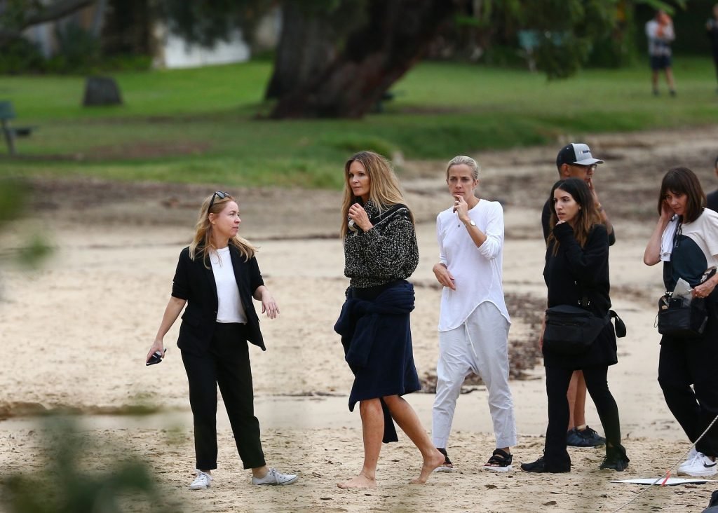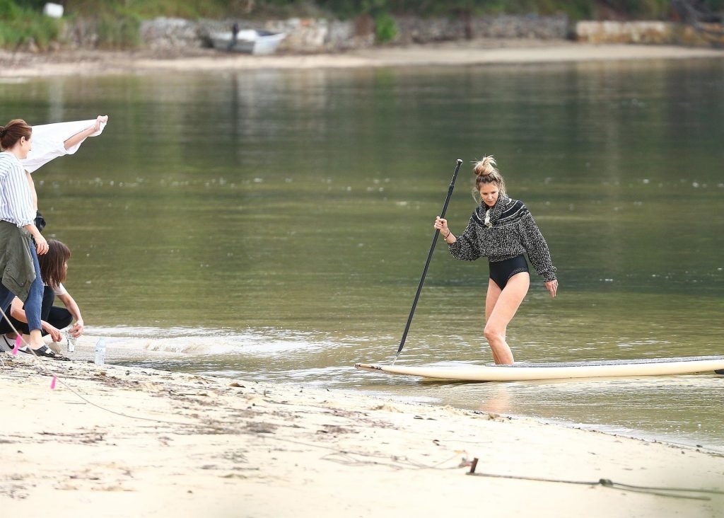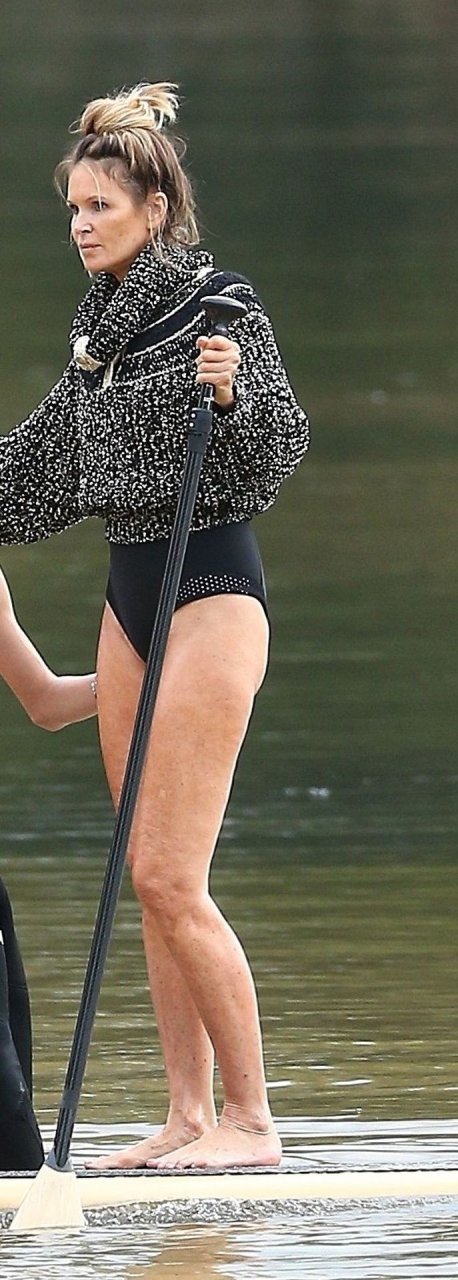 Elle Macpherson com seus dois filhos Cy Busson e Flynn Busson são vistos durante uma sessão de fotos para um anúncio de coleções de marcas em Sydney, Austrália, 19/03/2019. Elle, que fará 55 anos em 29 de março, parecia incrível enquanto exibia suas pernas esbeltas posando em uma prancha de stand-up paddle. A modelo estava de ótimo humor durante a sessão.