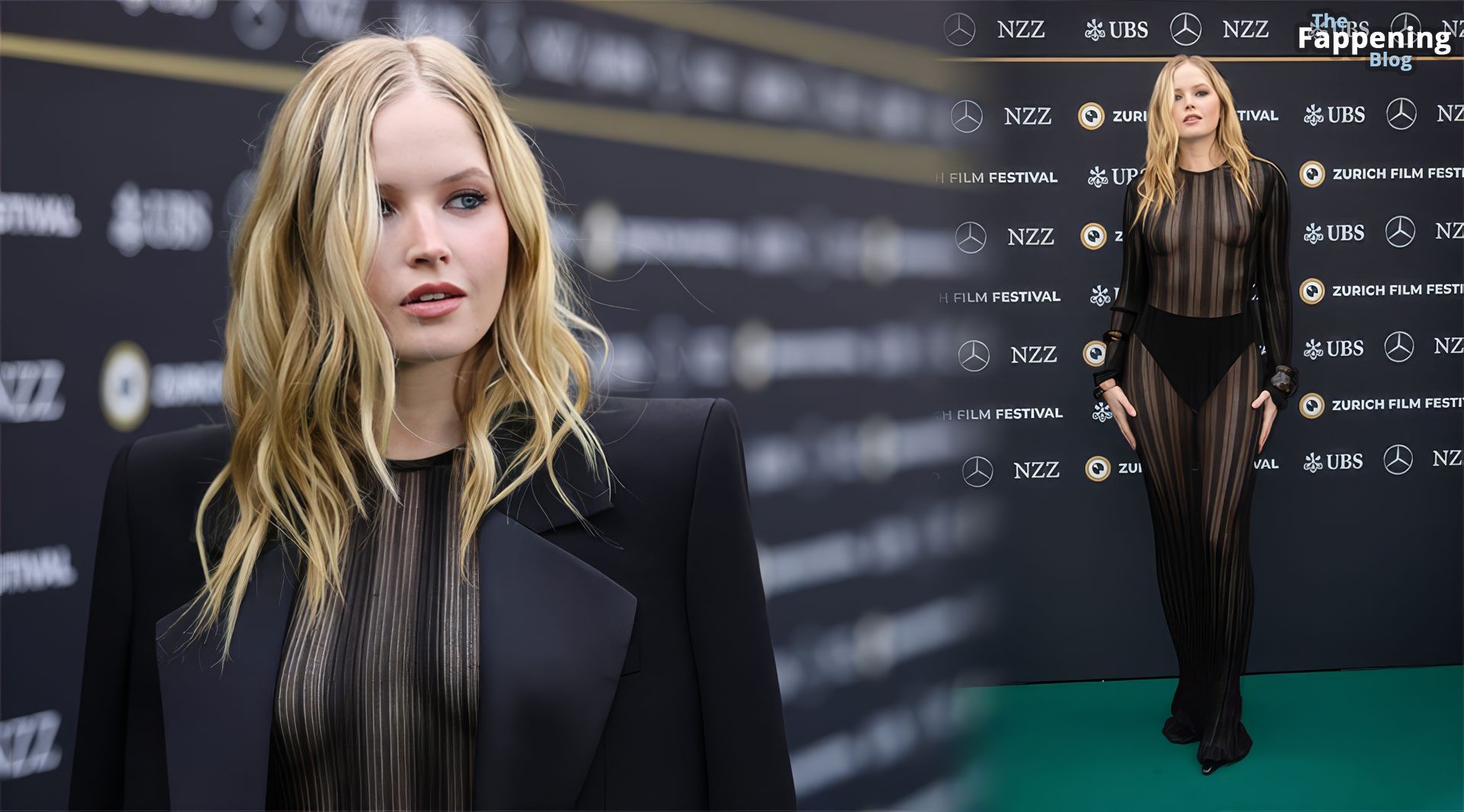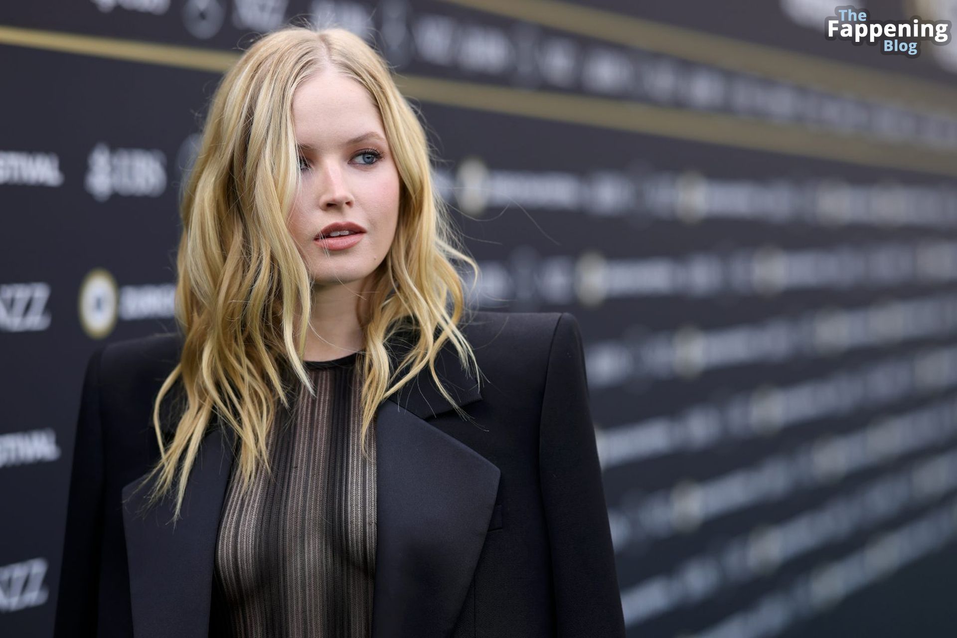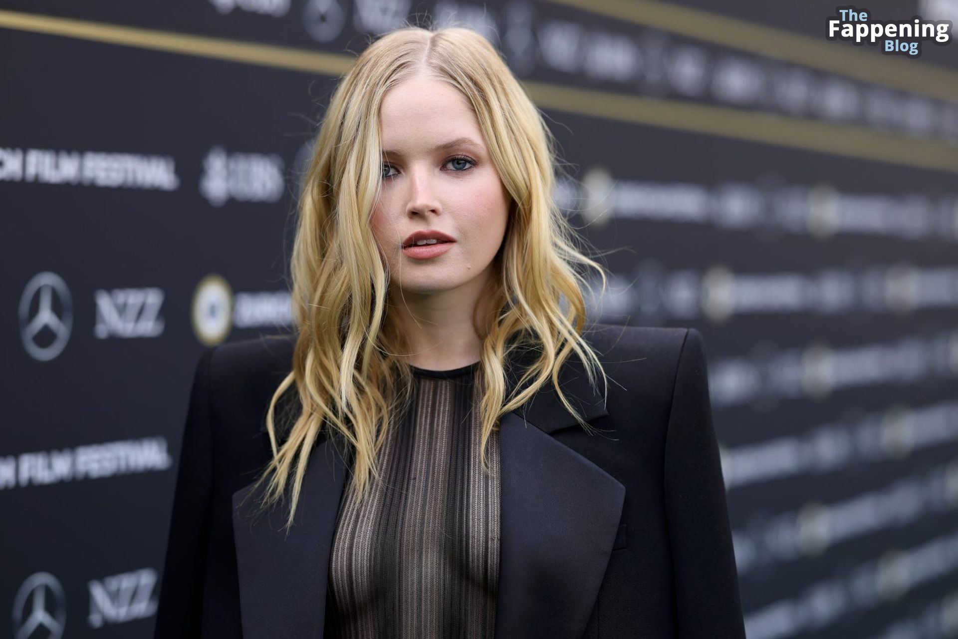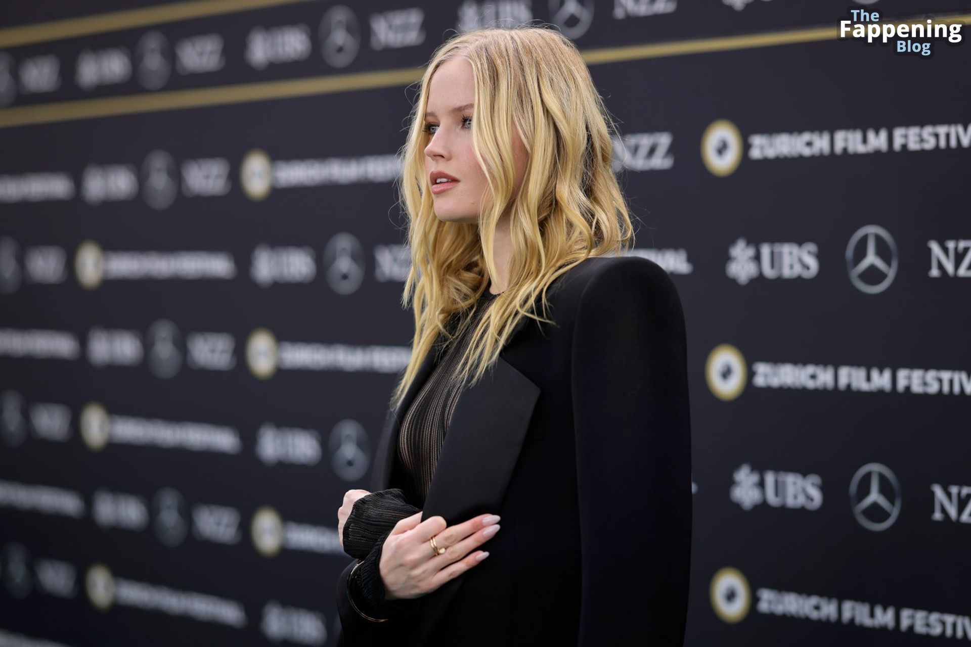 Ellie Bamber foi fotografada usando um vestido preto transparente no Festival de Cinema de Zurique, sem sutiã e mostrando os mamilos na estreia de “William Tell”.