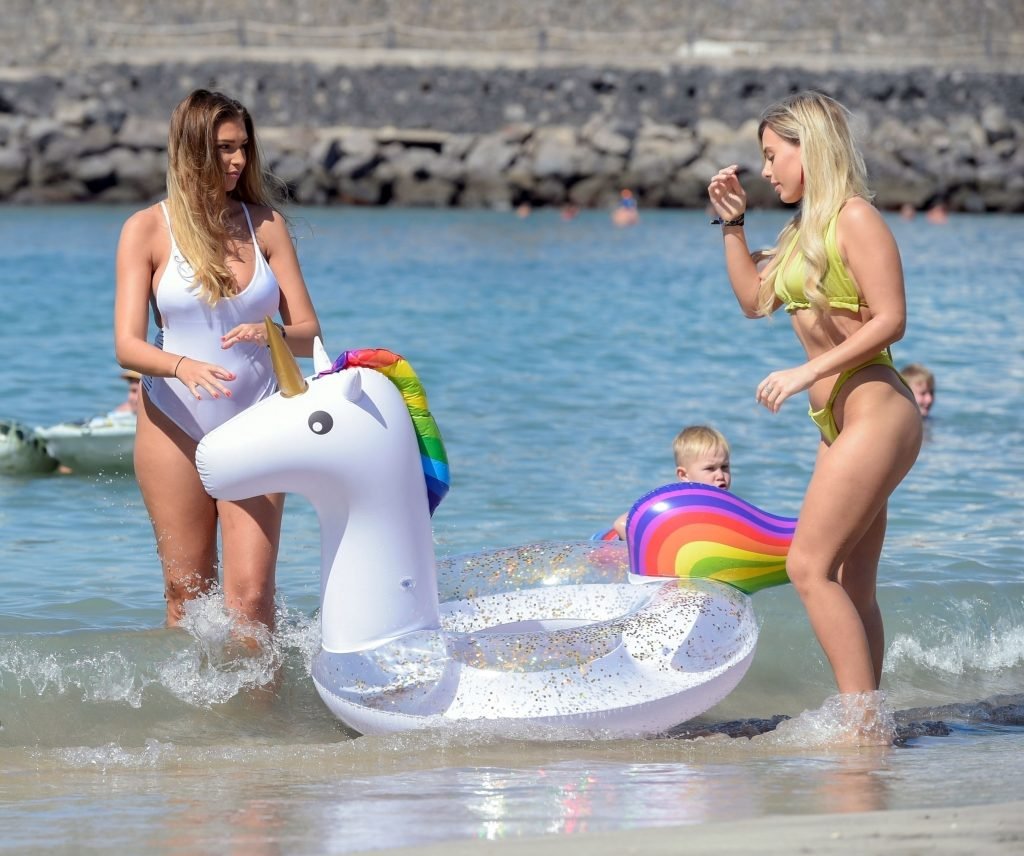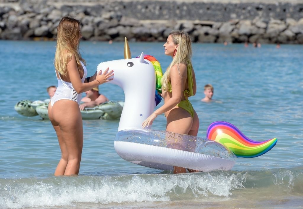 2018 Love Island Babe Ellie Brown mostra seu biquíni fio dental enquanto brinca no mar com a melhor amiga Zara McDermott e um inflável gigante de unicórnio. A dupla do Love Island 2018 também estava curtindo exibir alguns seios enquanto estavam na praia em Ibiza.