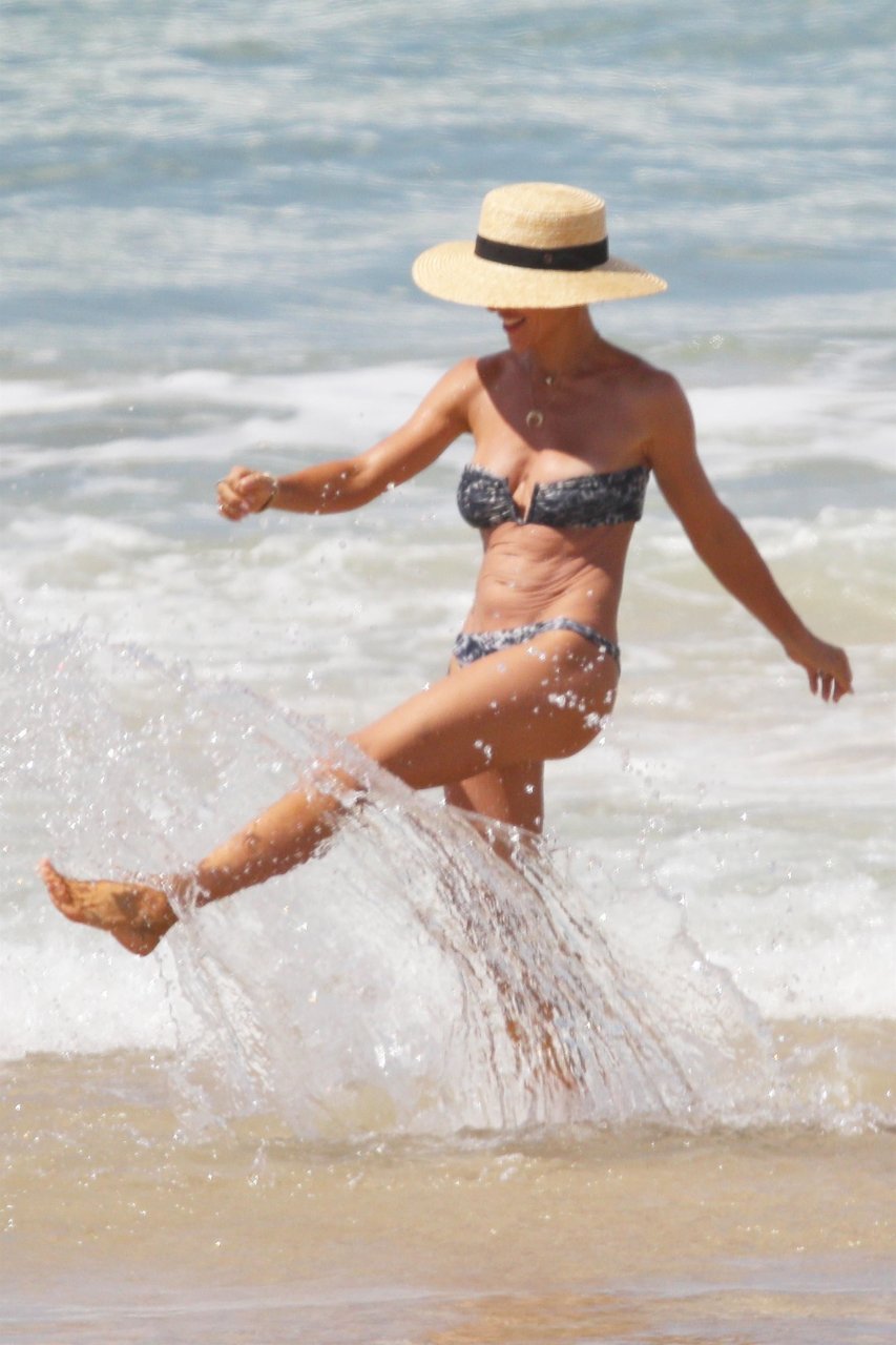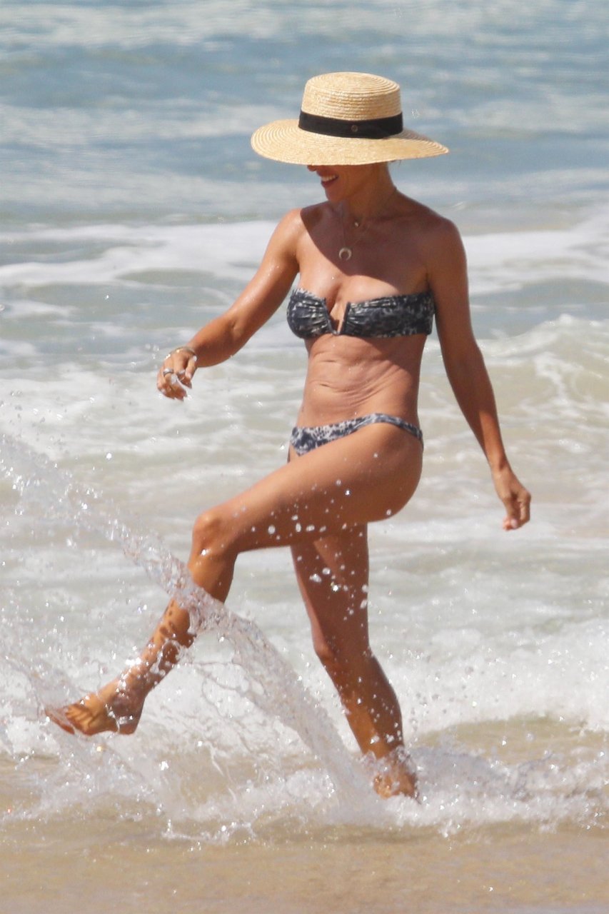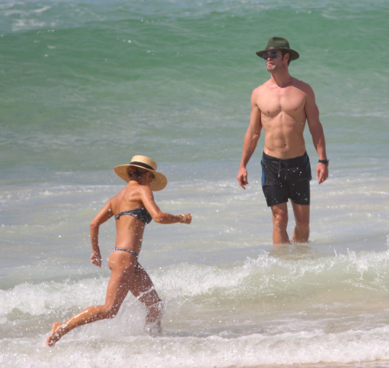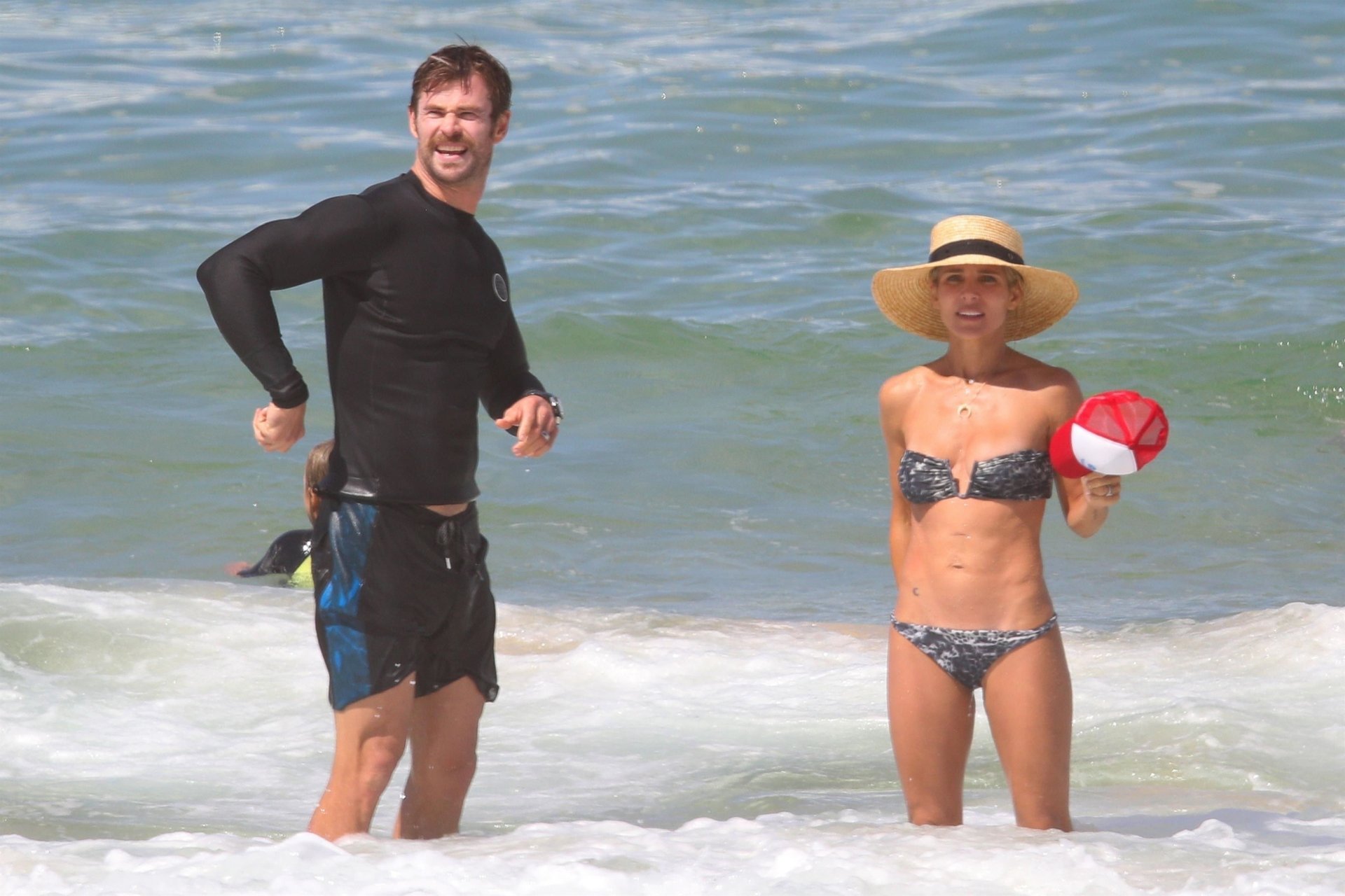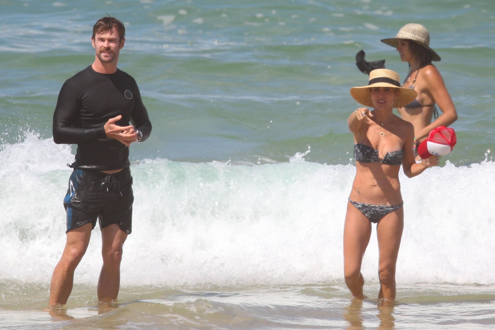 Chris Hemsworth e sua esposa Elsa Pataky fotografados na praia em Byron Bay, Austrália. Elsa Pataky é atriz (Velozes e Furiosos 8), modelo e produtora. Idade – 41.