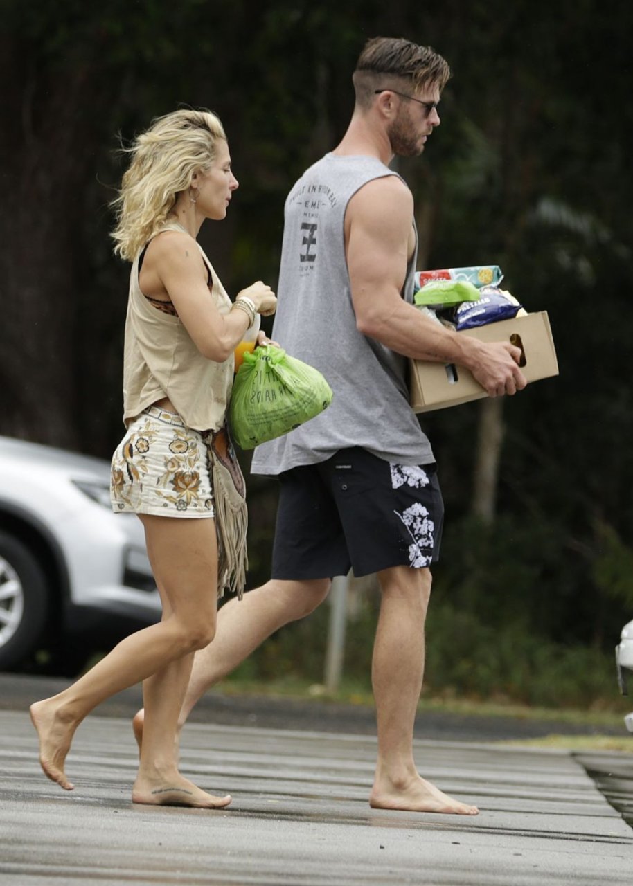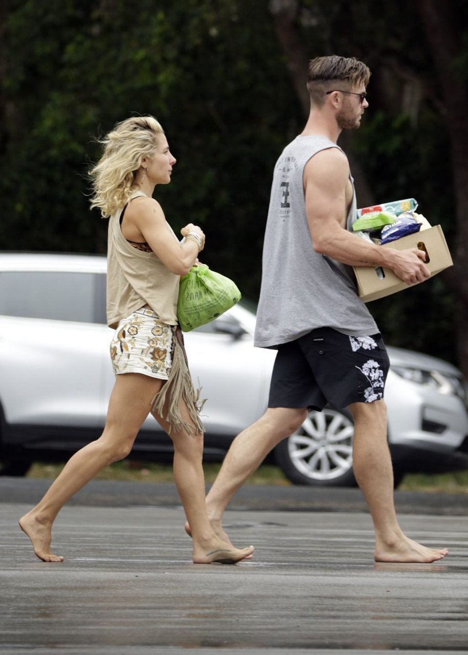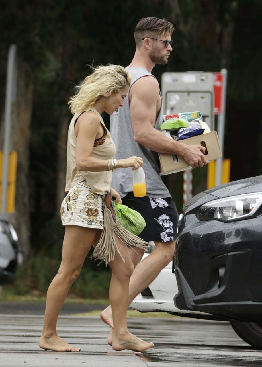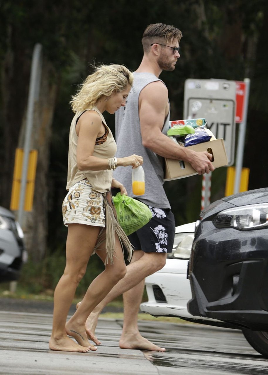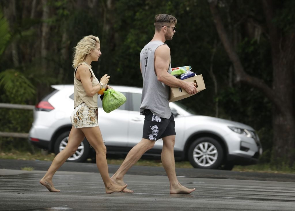 Chris Hemsworth exibe um novo corte de cabelo enquanto faz compras de supermercado com sua esposa, Elsa Pataky, em Byron Bay, 02/06/2019.