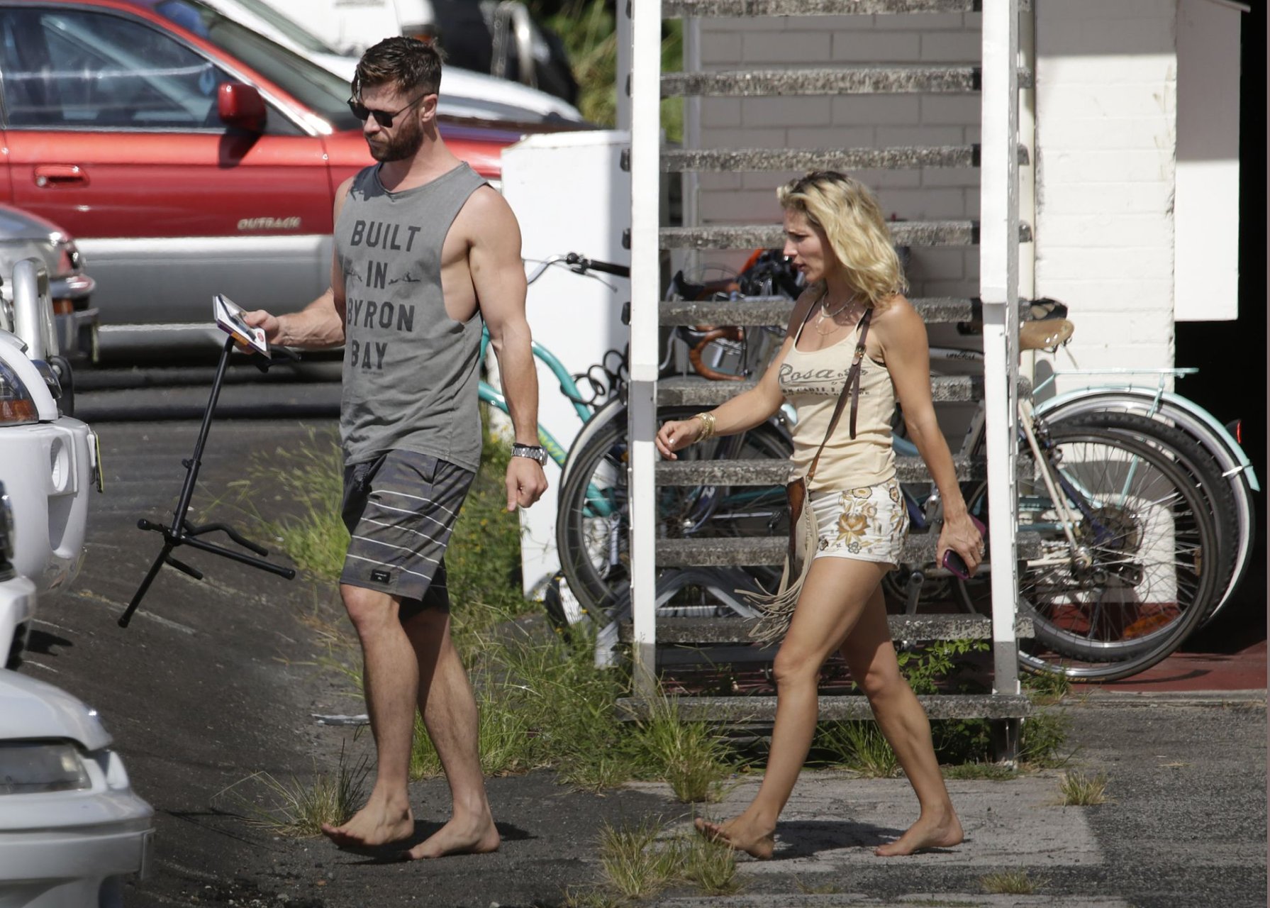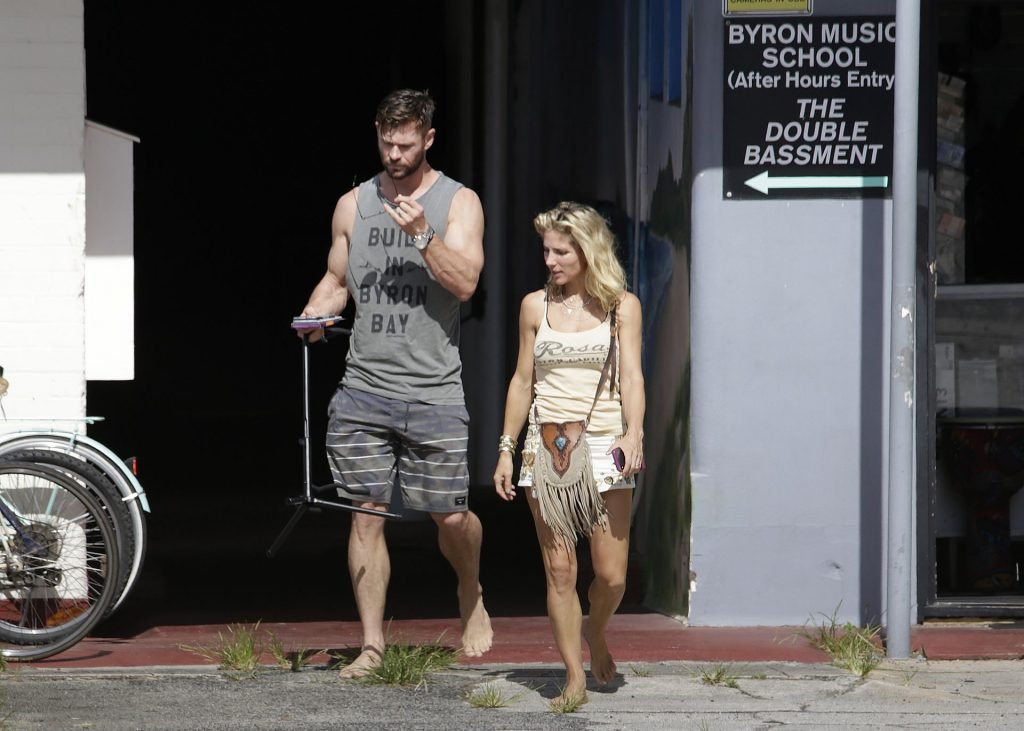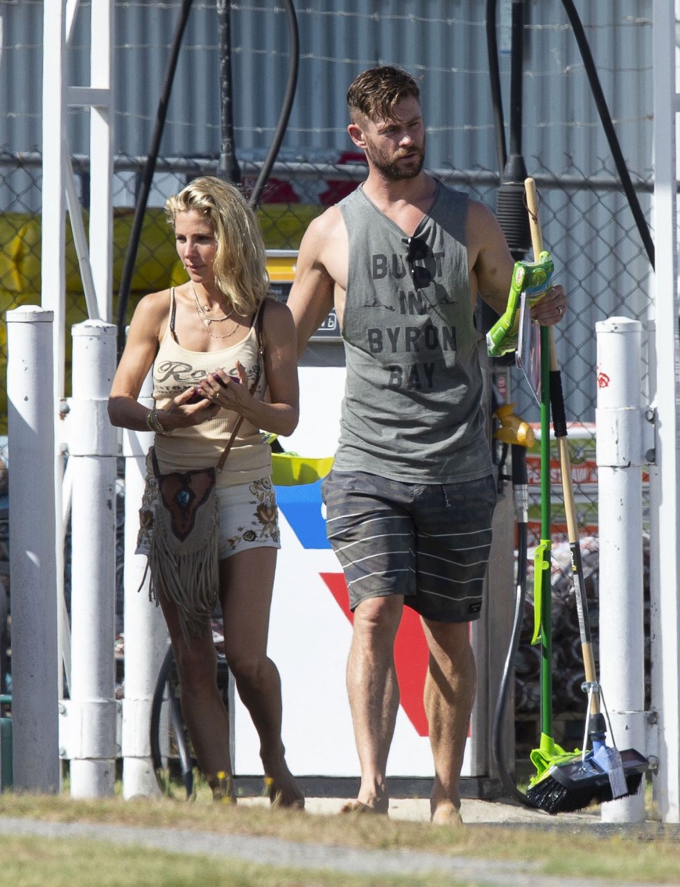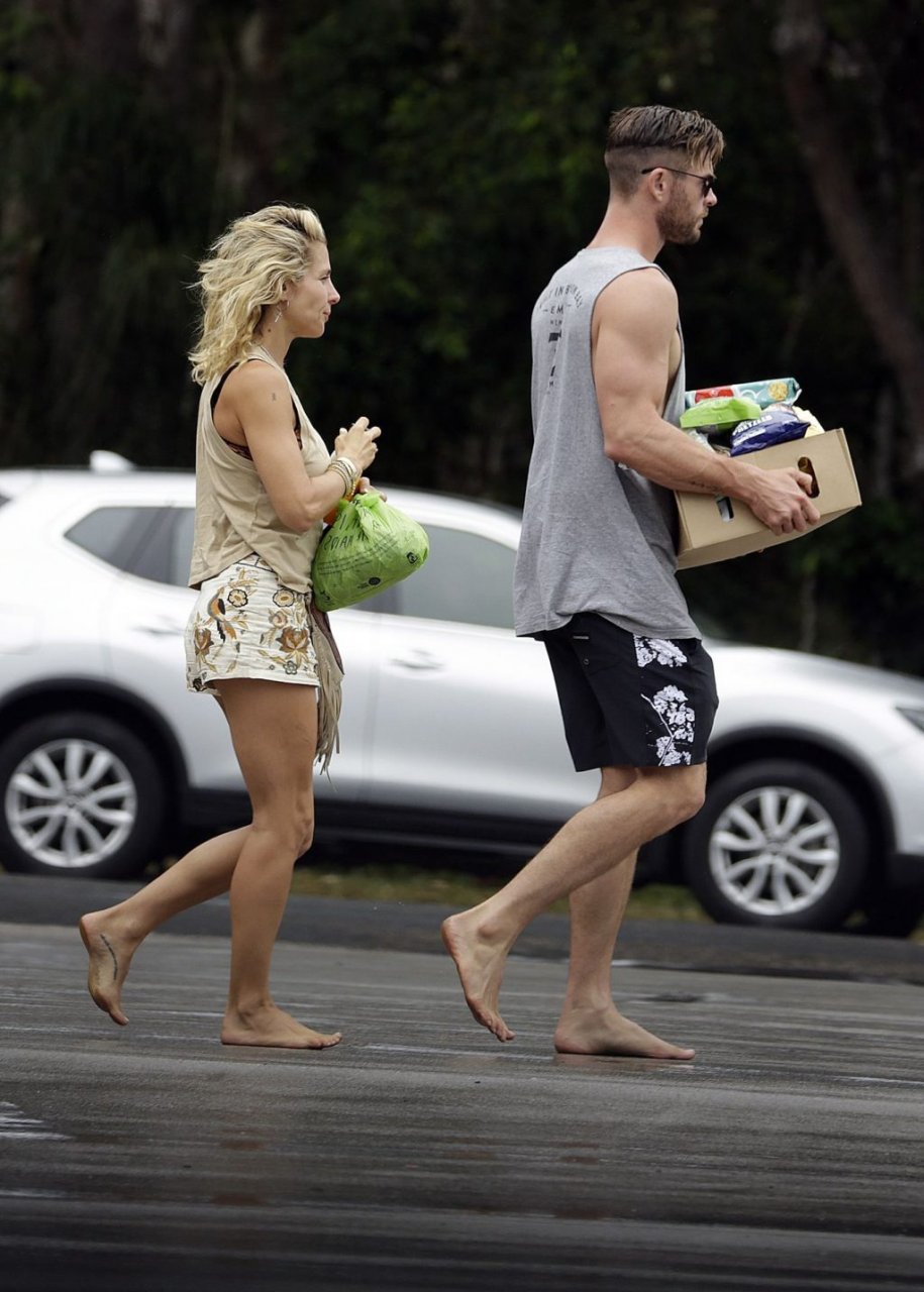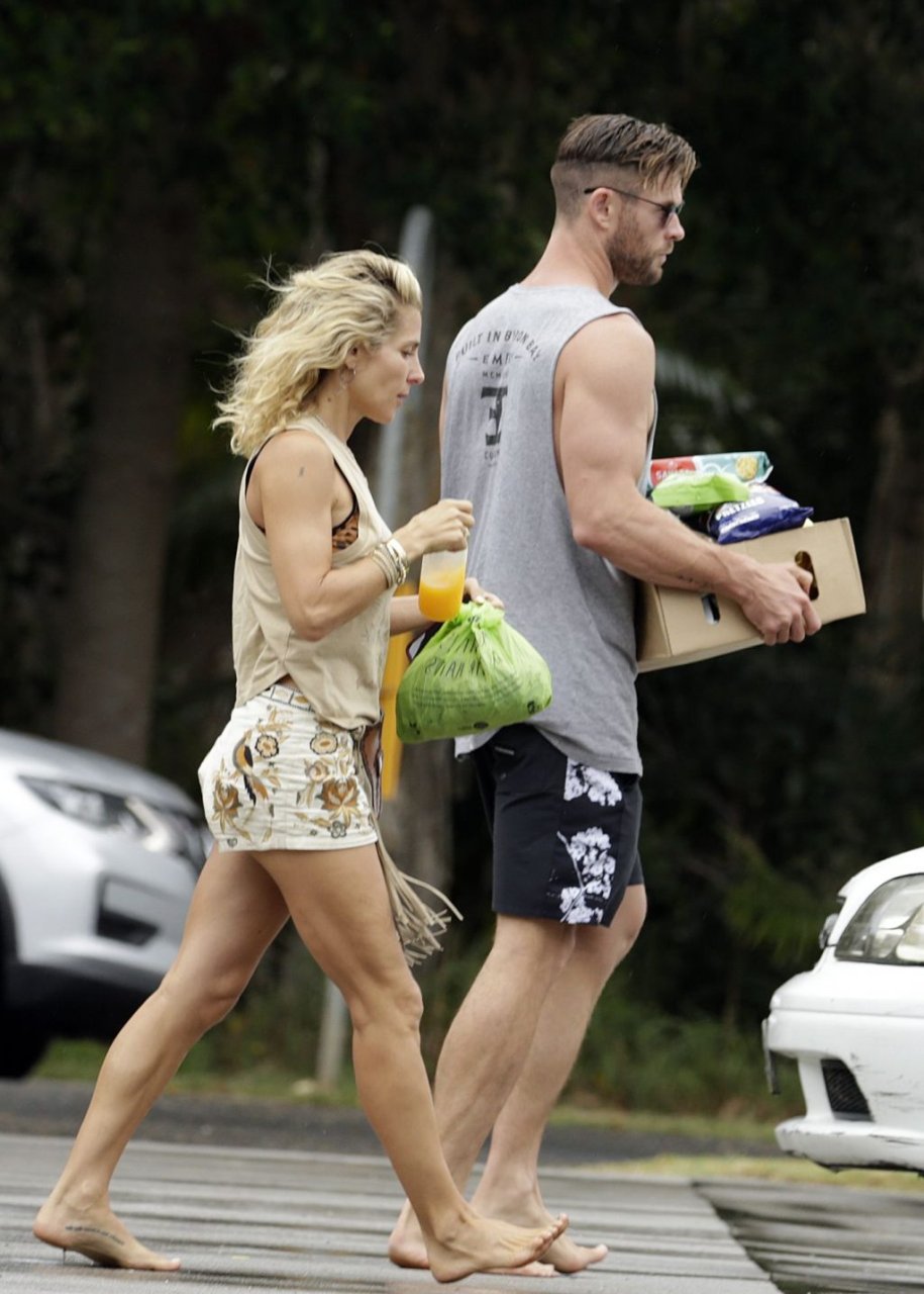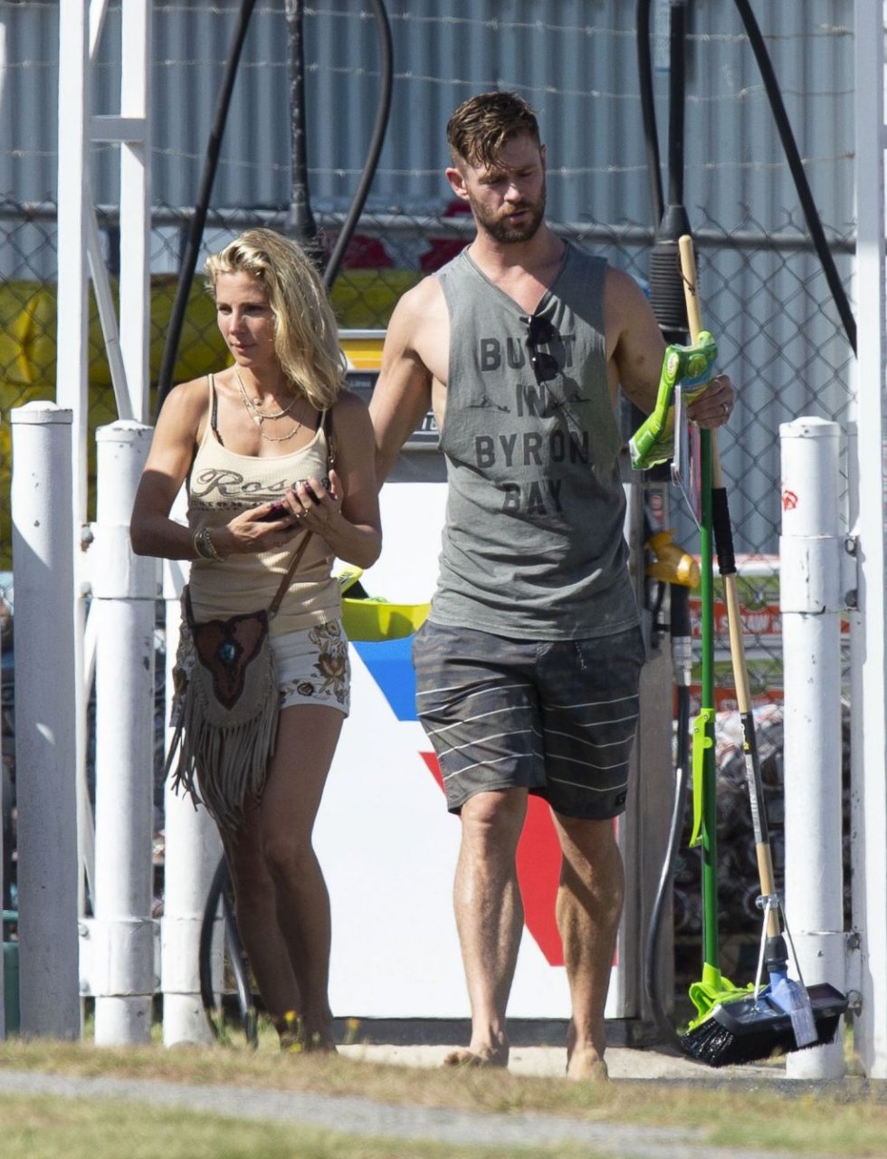 Chris Hemsworth exibe um novo corte de cabelo enquanto faz compras de supermercado com sua esposa, Elsa Pataky, em Byron Bay, 02/06/2019.