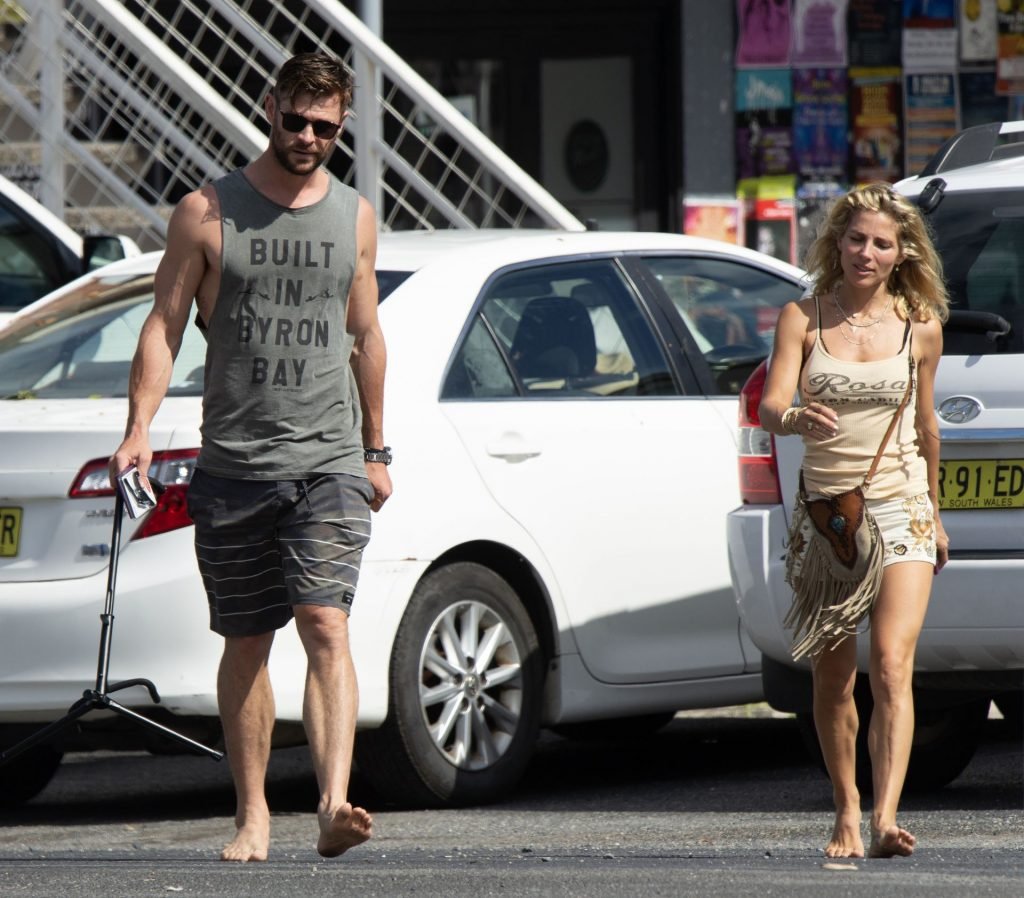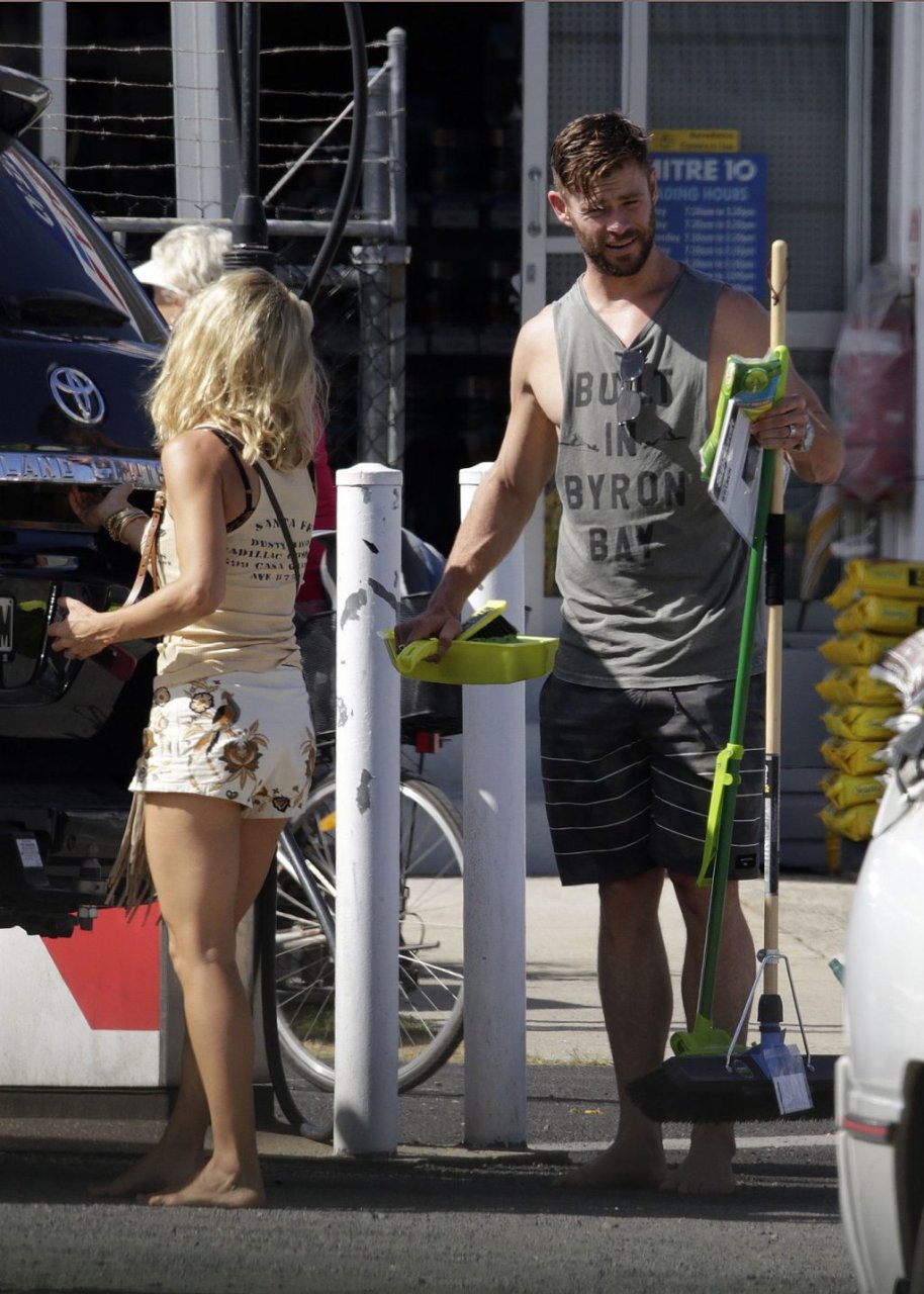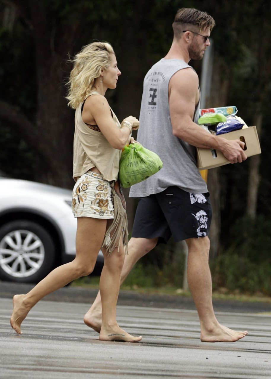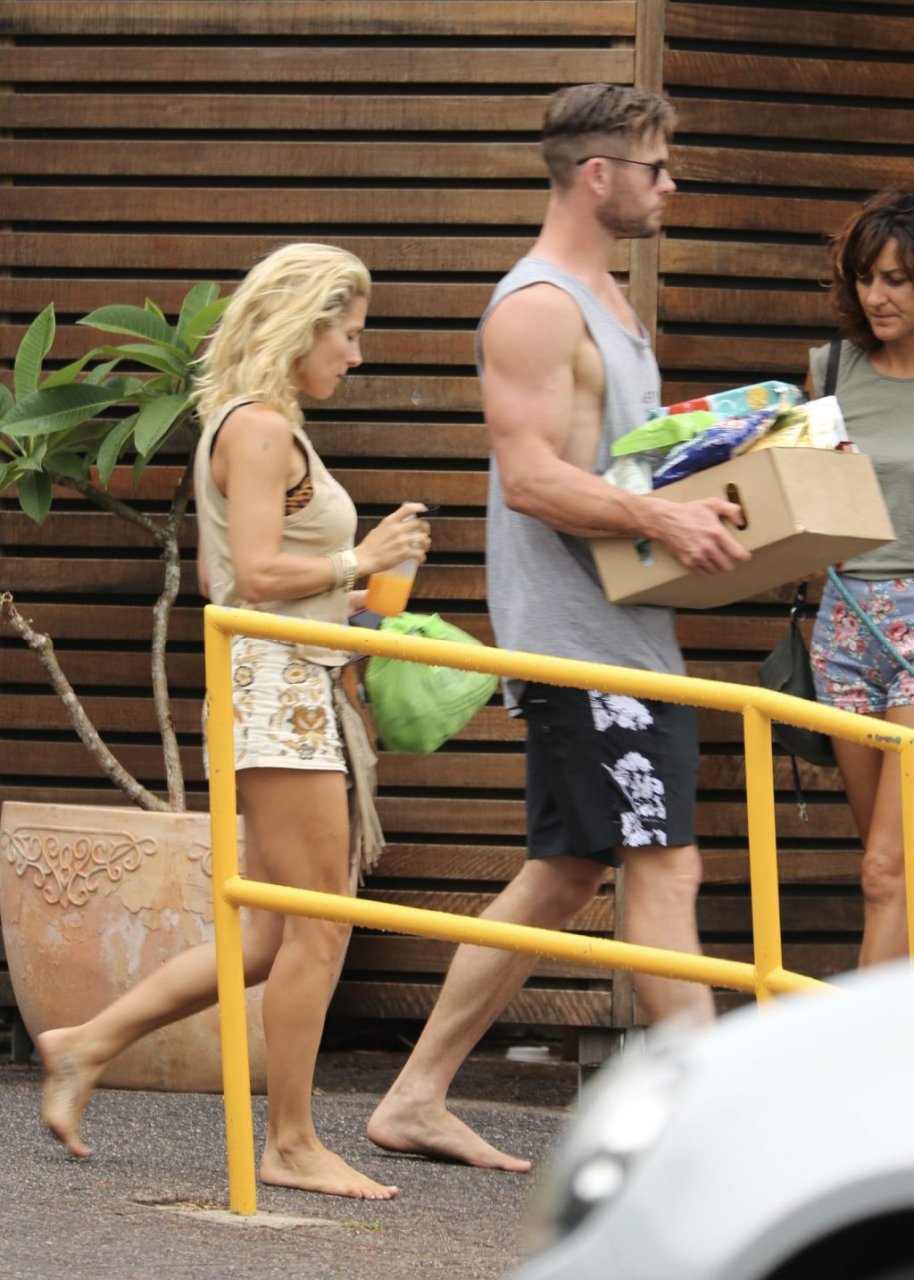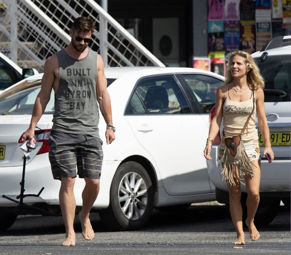 Chris Hemsworth exibe um novo corte de cabelo enquanto faz compras de supermercado com sua esposa, Elsa Pataky, em Byron Bay, 02/06/2019.