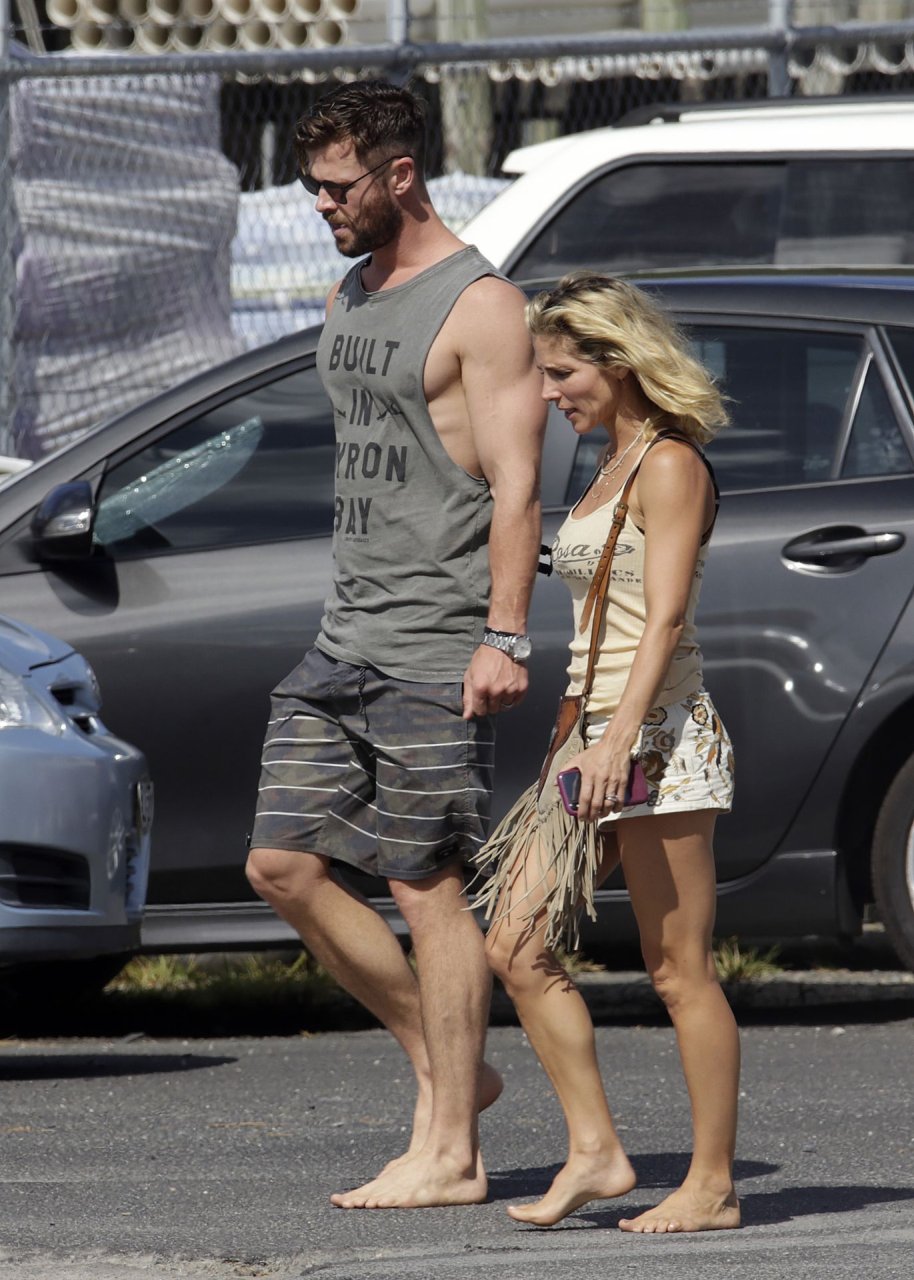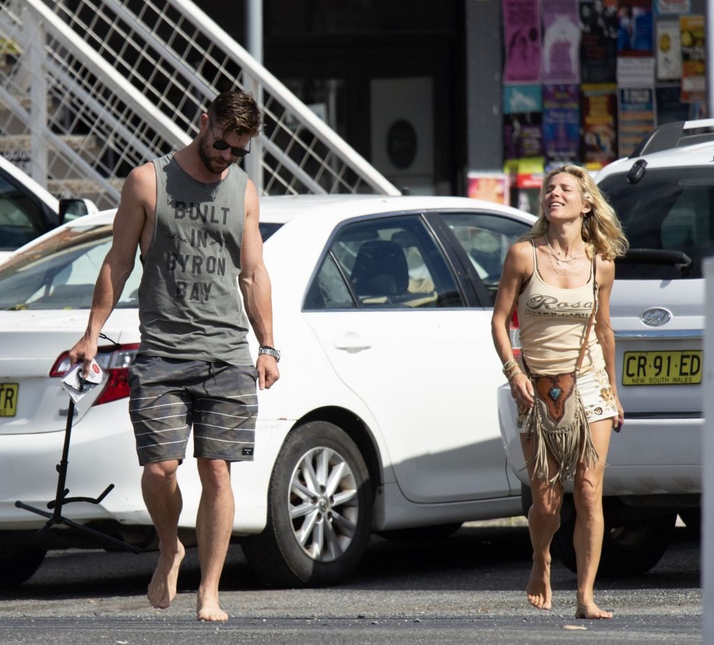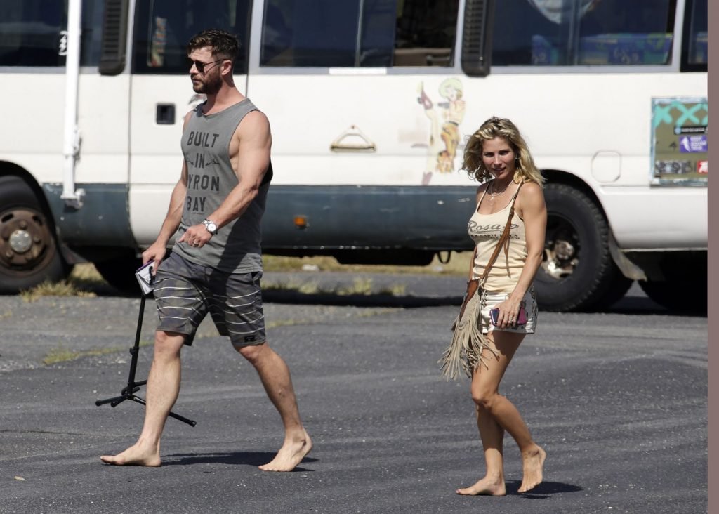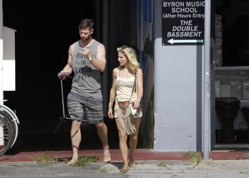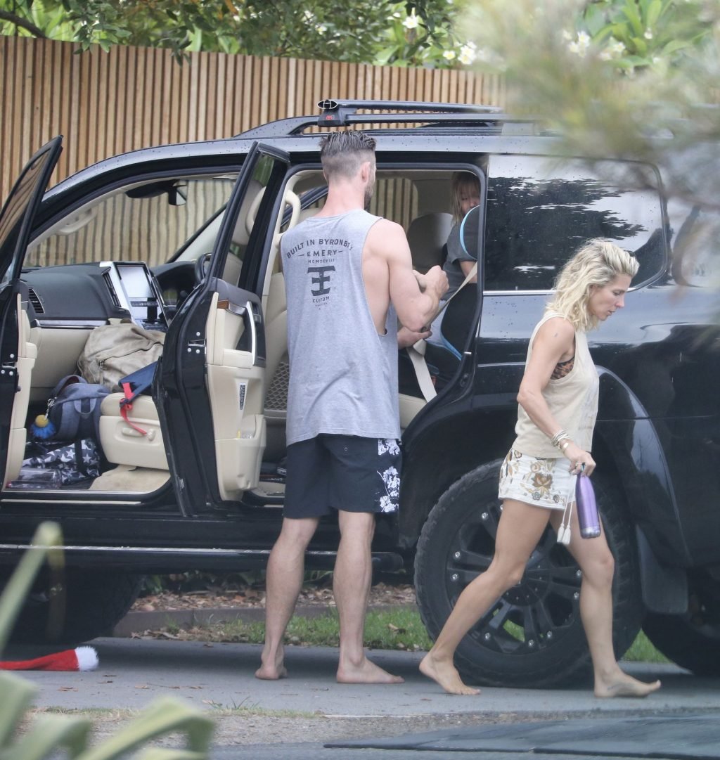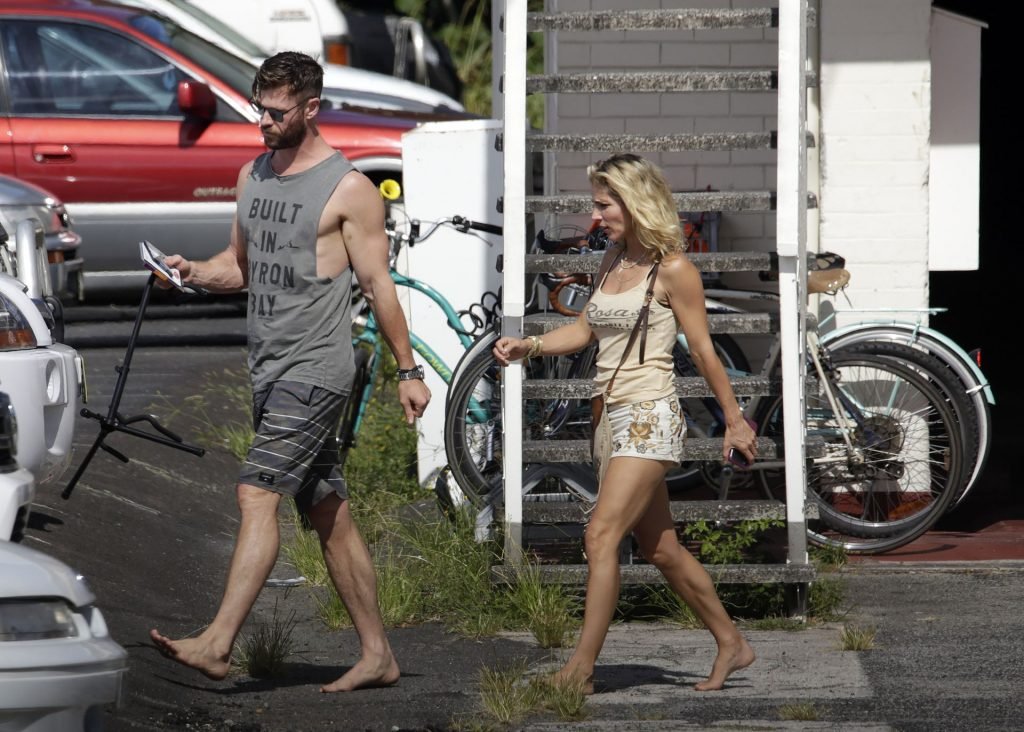 Chris Hemsworth exibe um novo corte de cabelo enquanto faz compras de supermercado com sua esposa, Elsa Pataky, em Byron Bay, 02/06/2019.