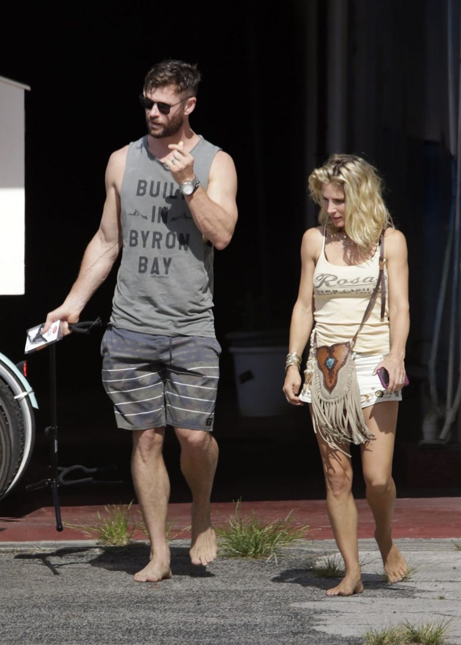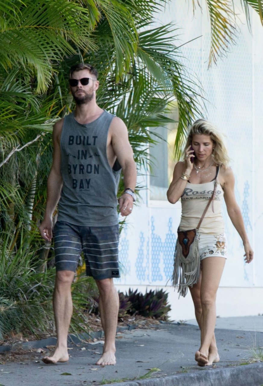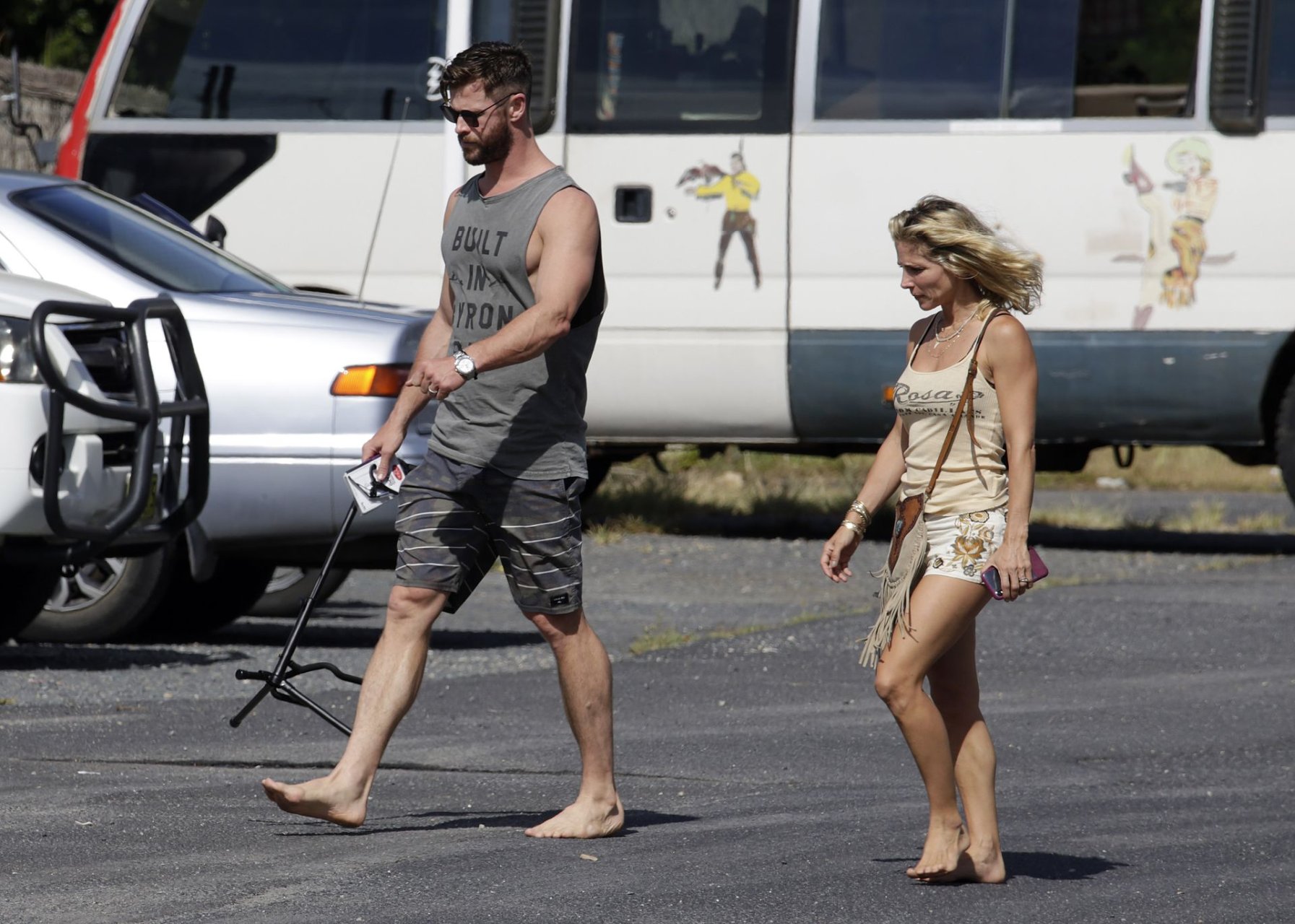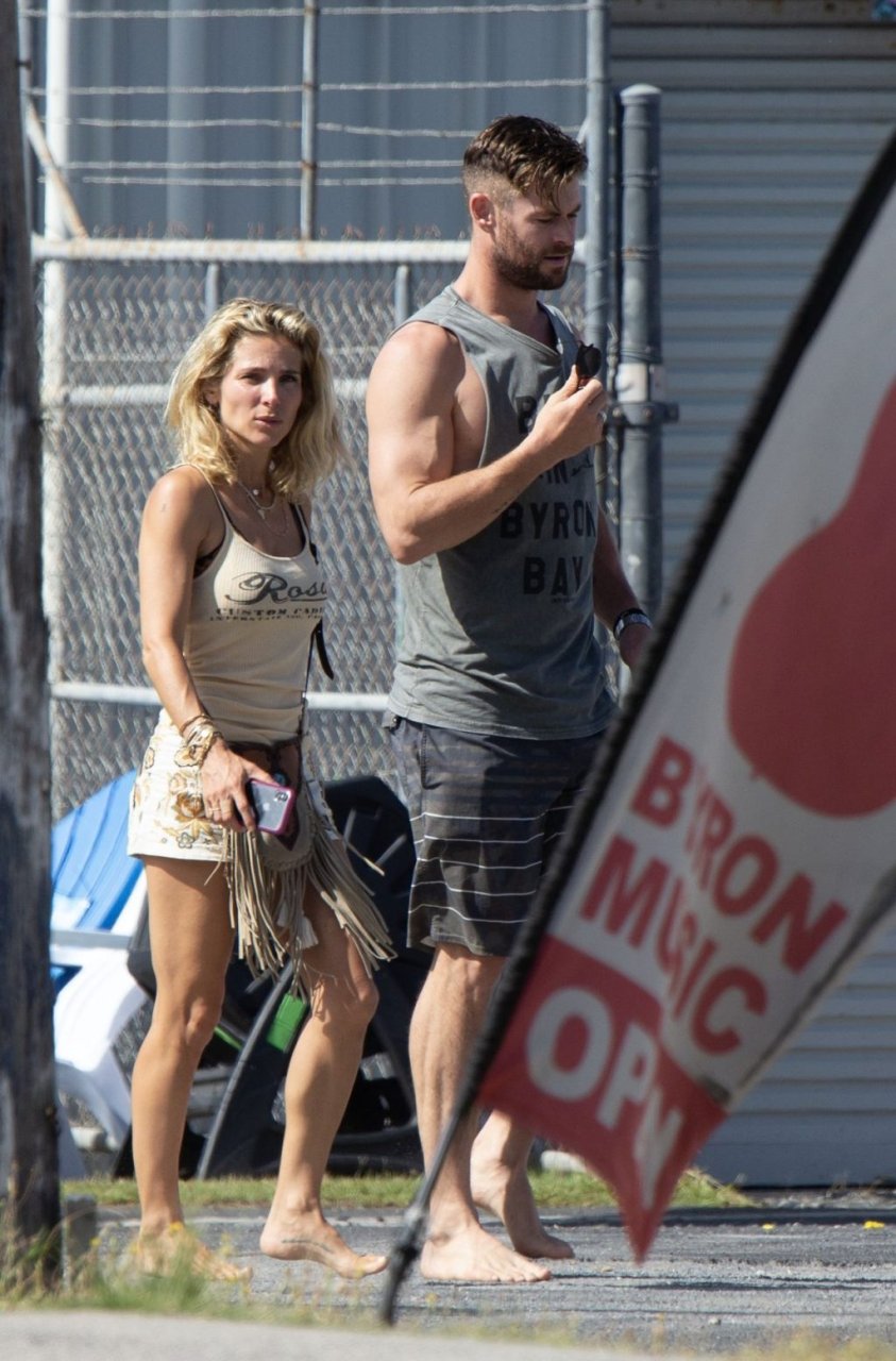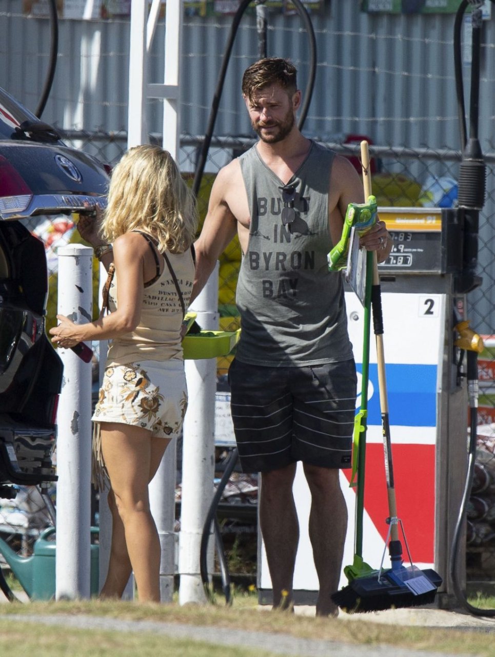 Chris Hemsworth exibe um novo corte de cabelo enquanto faz compras de supermercado com sua esposa, Elsa Pataky, em Byron Bay, 02/06/2019.