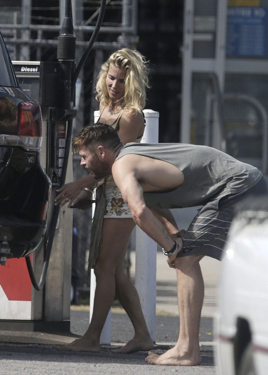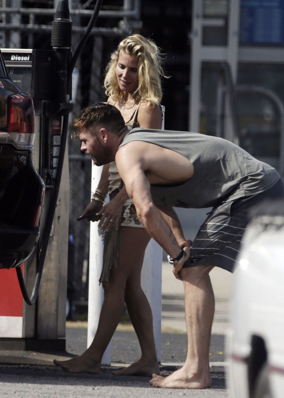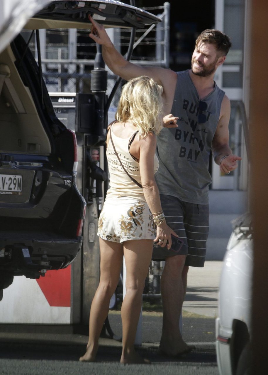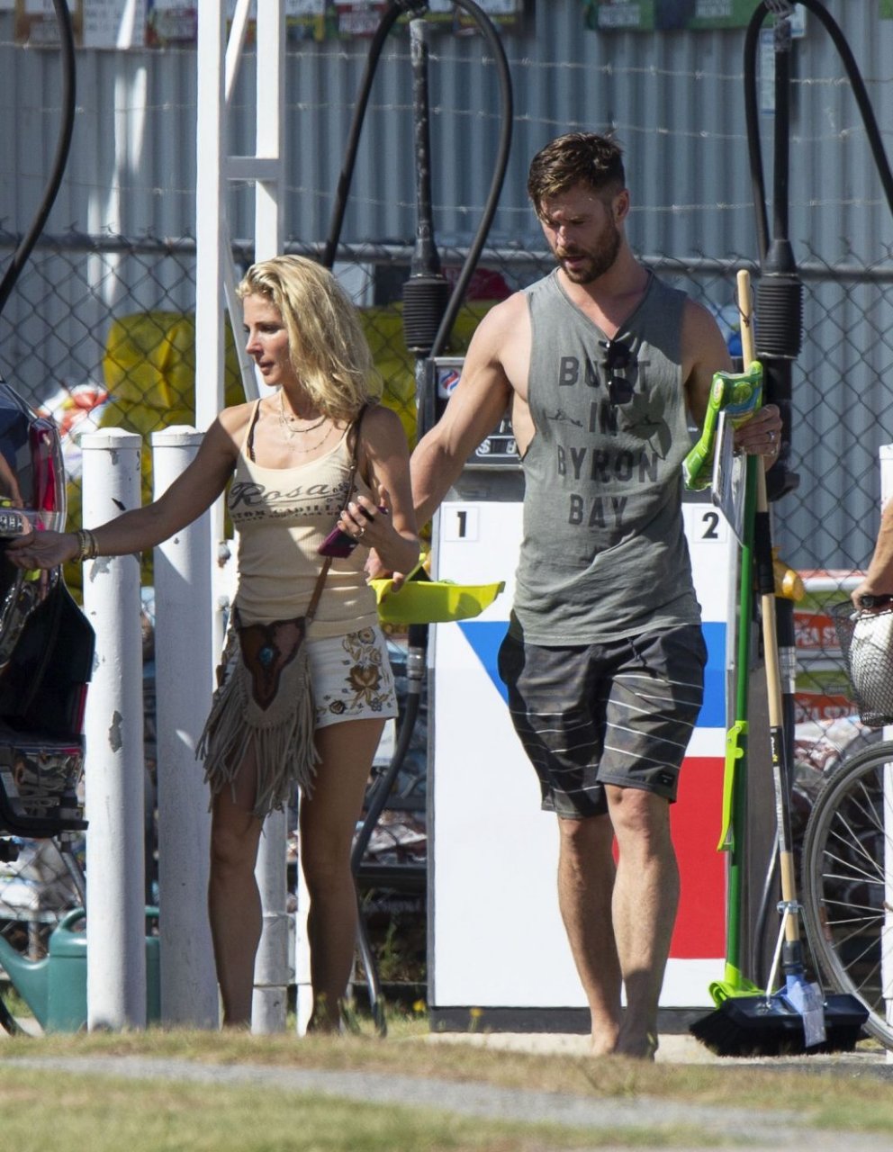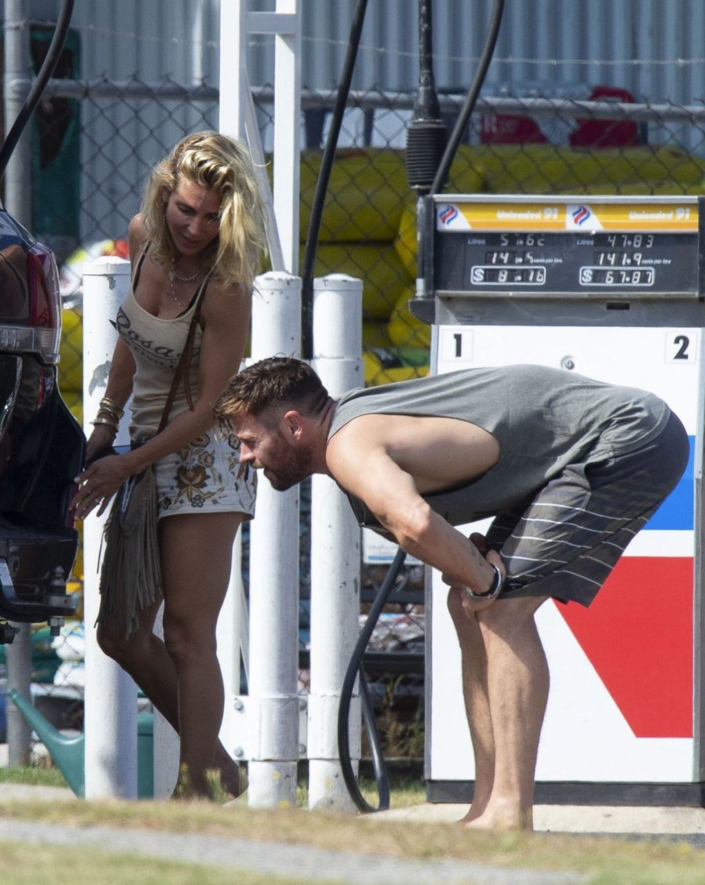 Chris Hemsworth exibe um novo corte de cabelo enquanto faz compras de supermercado com sua esposa, Elsa Pataky, em Byron Bay, 02/06/2019.