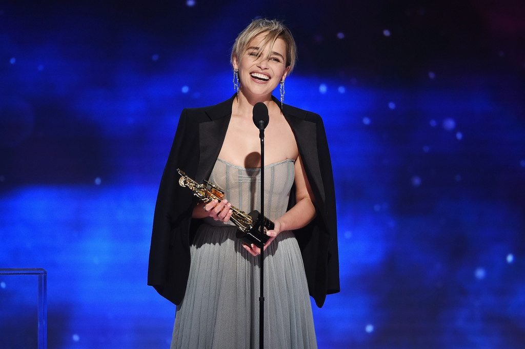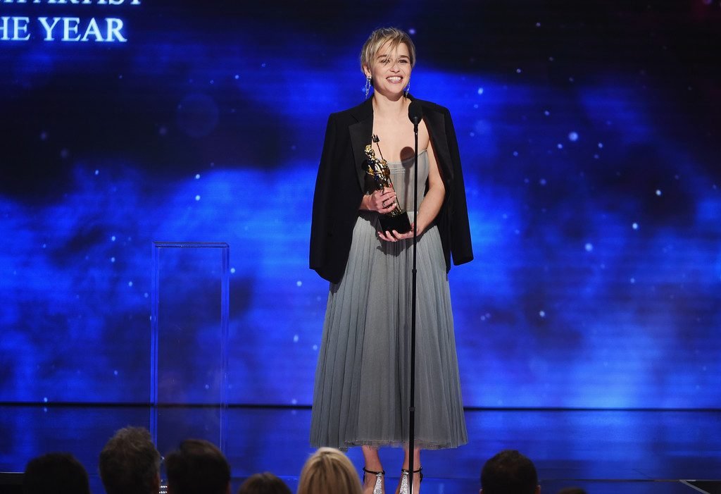 Emilia Clarke participa do British Academy Britannia Awards 2018 em Beverly Hills, 26/10/2018. Neste evento, a atriz de 32 anos apareceu com um vestido simples azul claro.