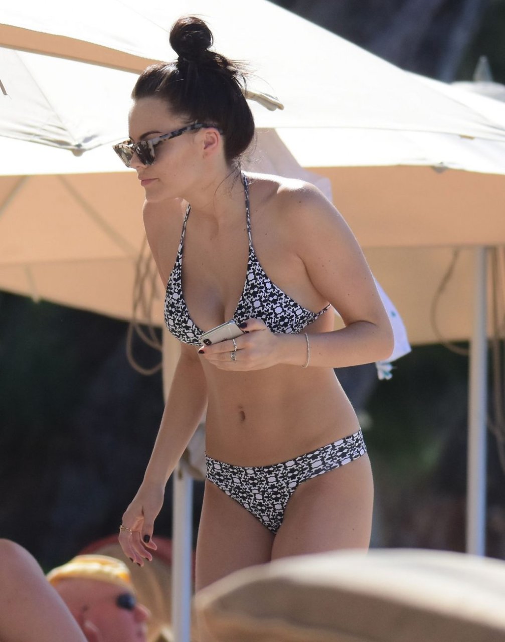 Modelo inglesa e estrela de reality show Emily Blackwell (22) é fotografada em Barbados usando um biquíni fio dental, 09/12/2018.