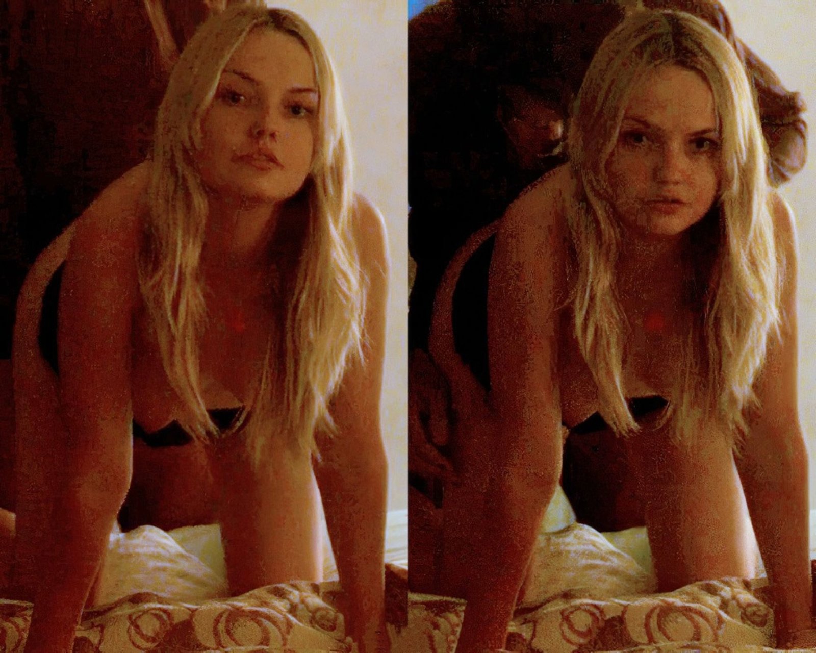 Como você pode ver no vídeo Nudogram e no gif abaixo, Emily filmou nua de quatro em uma cama enquanto um rapaz está atrás dela e eles fazem sexo. Emily olhando seu reflexo no espelho.