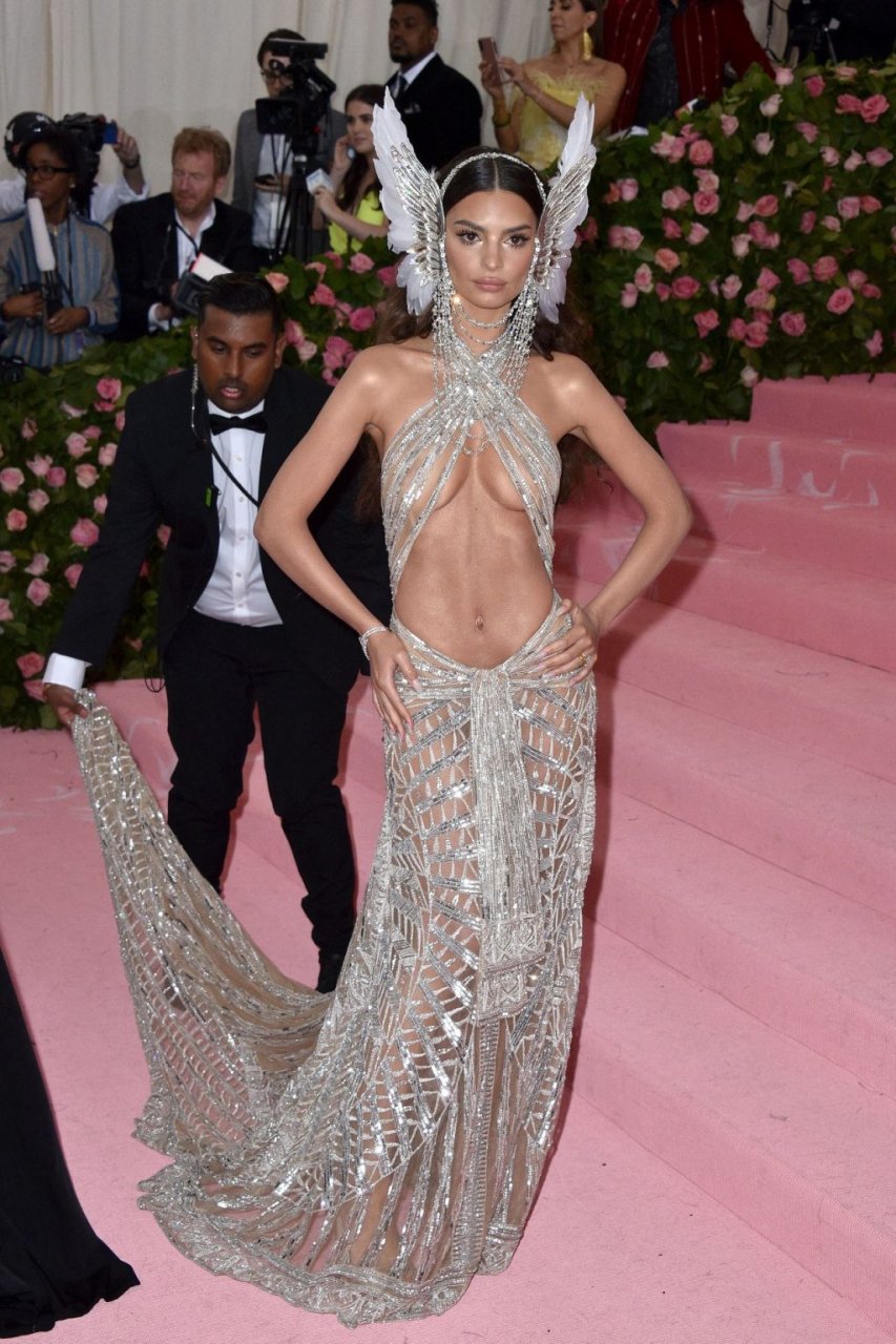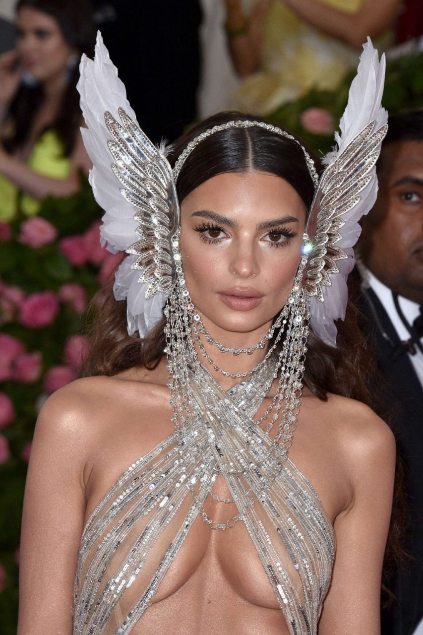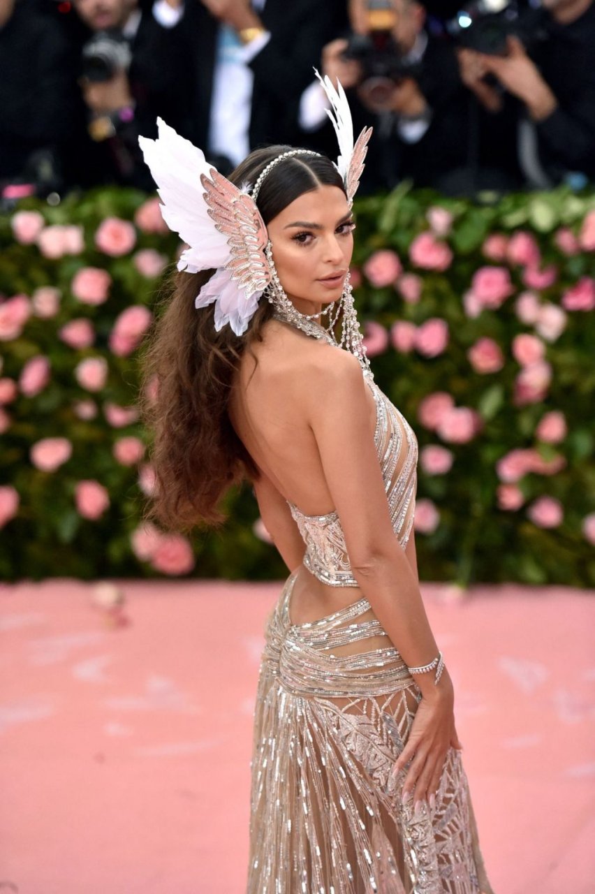 Modela/atriz Emily Ratajkowski exibe seu deslumbrante look no MET Gala 2019 em Nova York, 05/05/2019. Emily apareceu no tapete rosa com um vestido revelador, cobrindo apenas o mais interessante. O MET Gala é uma festa à fantasia, então a modelo usou orelhas de elfo.