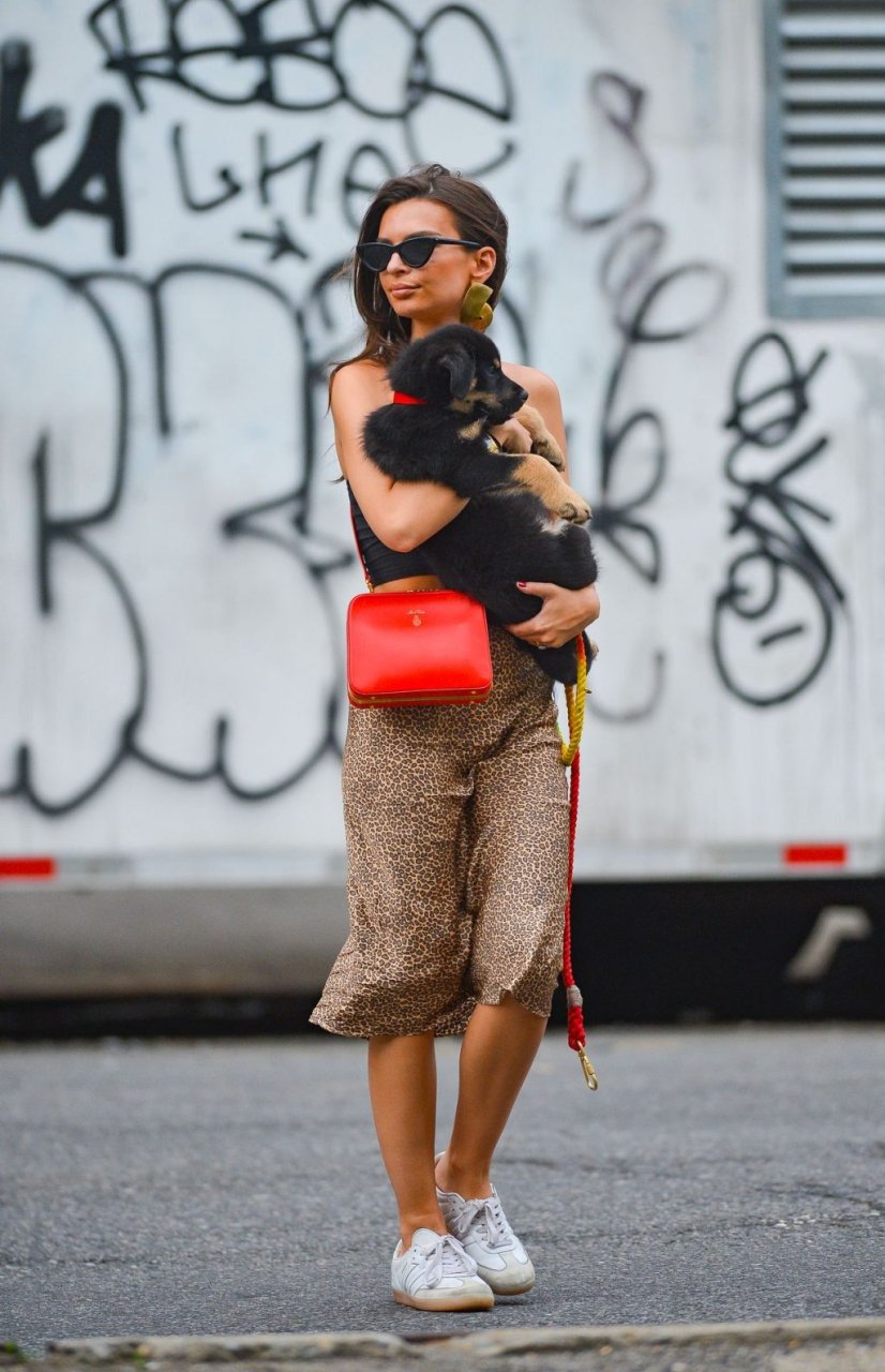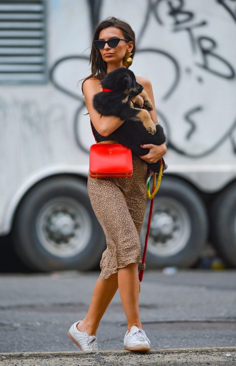 Supermodelo Emily Ratajkowski está em Nova York aproveitando a companhia de seu novo filhote! Emily leva seu novo Rottweiler para jantar no Gemma, no East Village, 20/05/2019. Emily optou por um visual discreto com uma saia de estampa animal combinada com uma blusa preta e contrastada com uma bolsa vermelha.