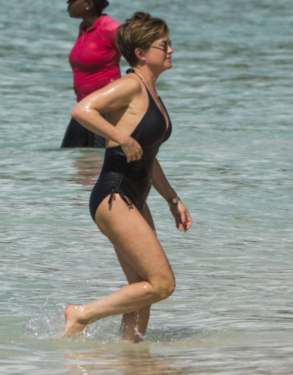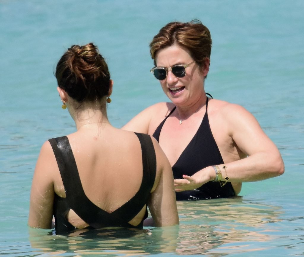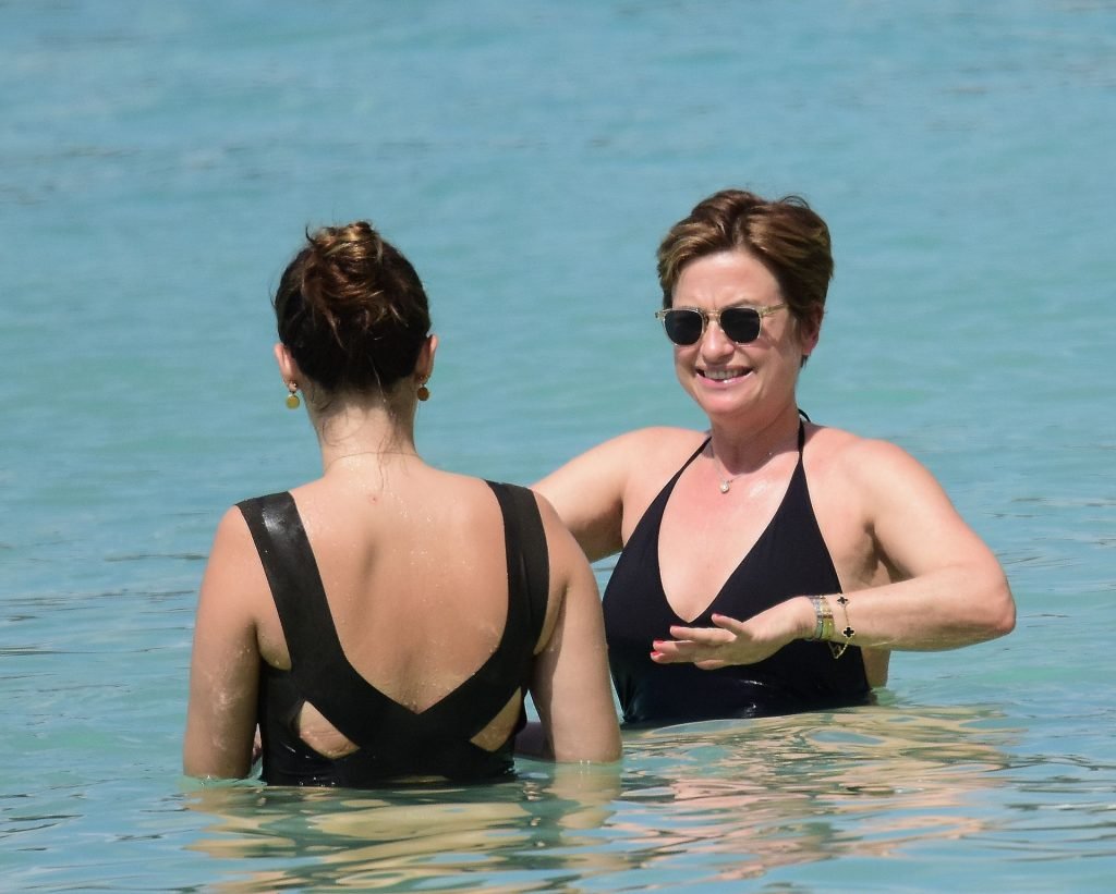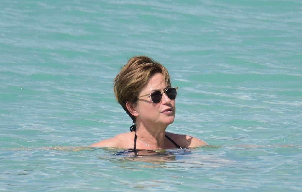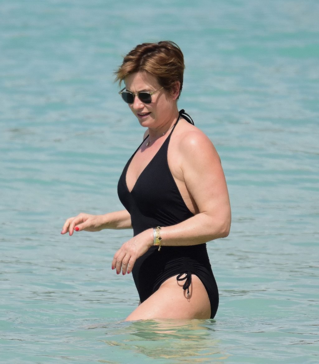 Apresentadora de TV britânica Emma Forbes (53) foi vista usando um maiô clássico na praia em Barbados, 27/12/2018.