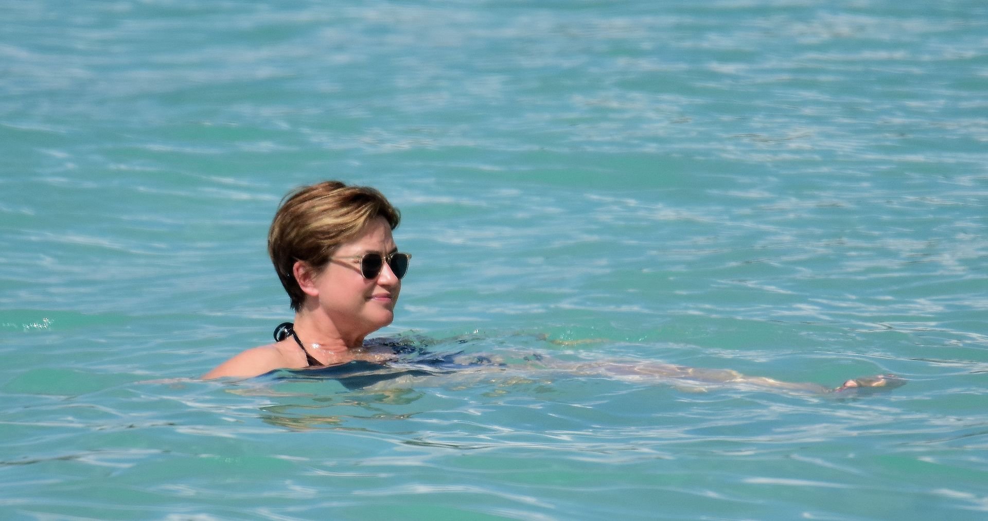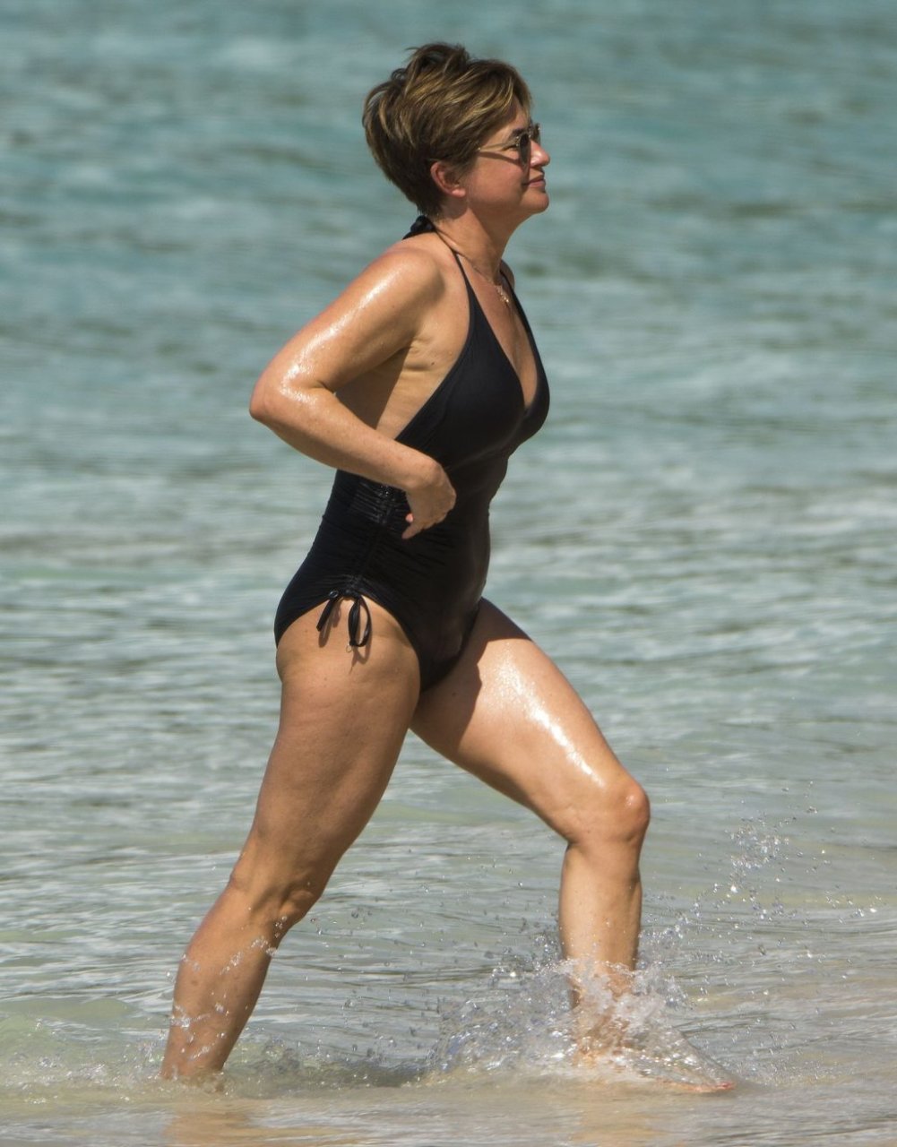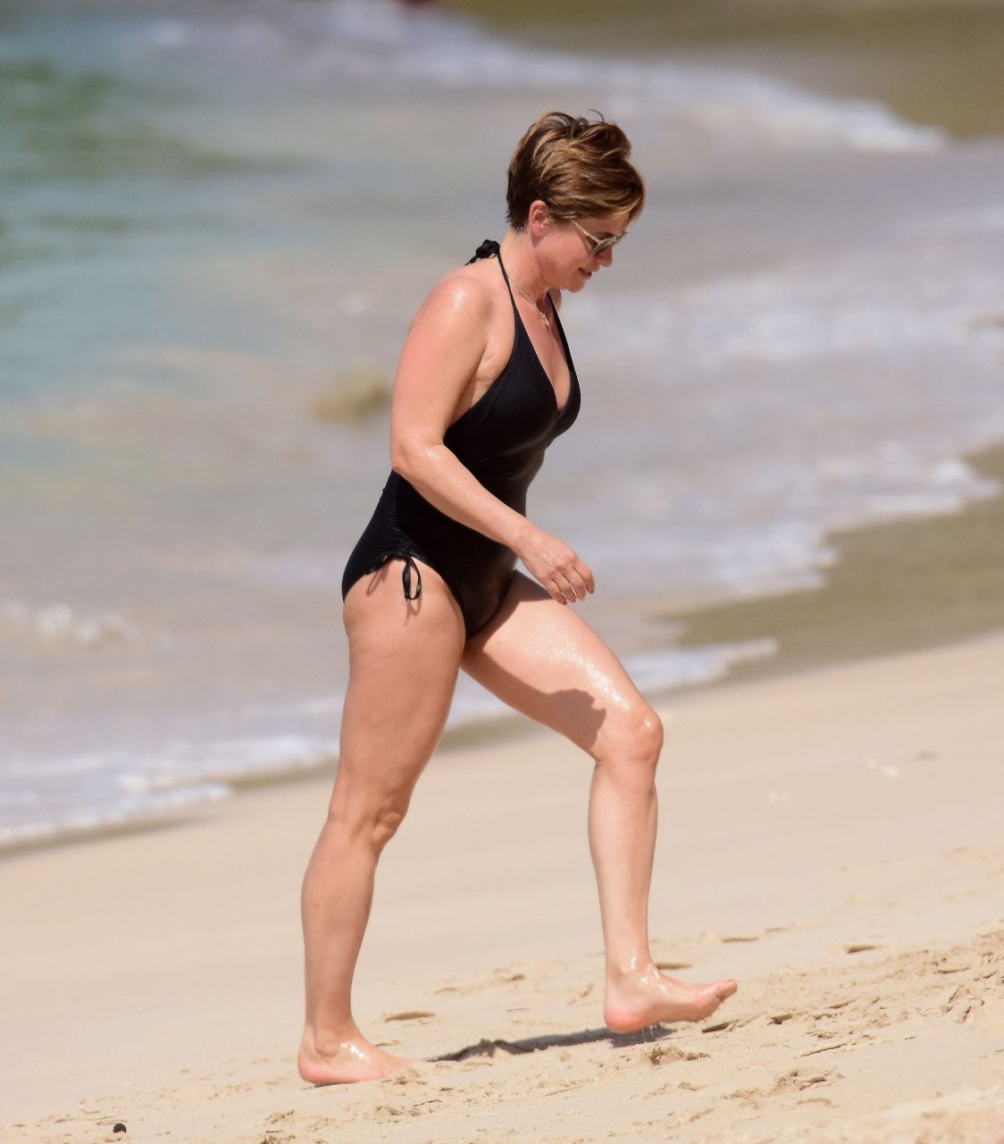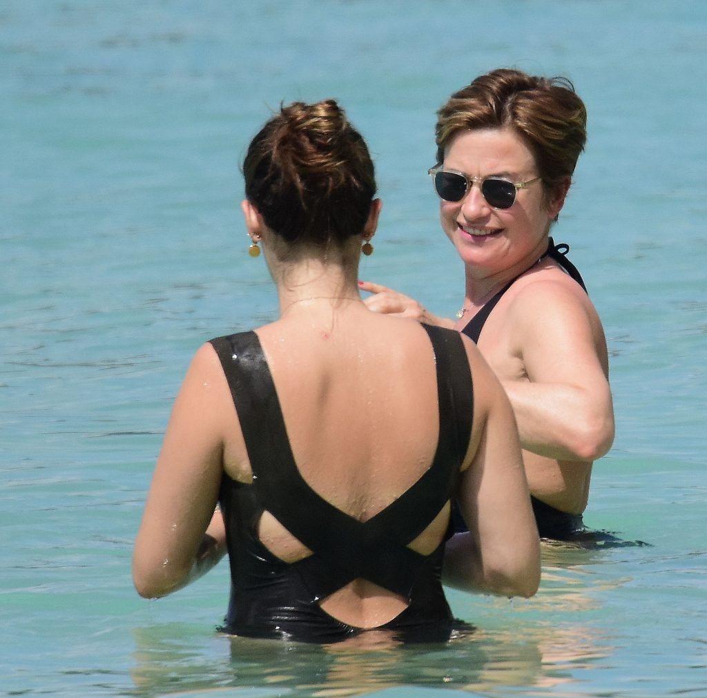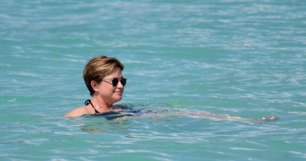Apresentadora de TV britânica Emma Forbes (53) foi vista usando um maiô clássico na praia em Barbados, 27/12/2018.