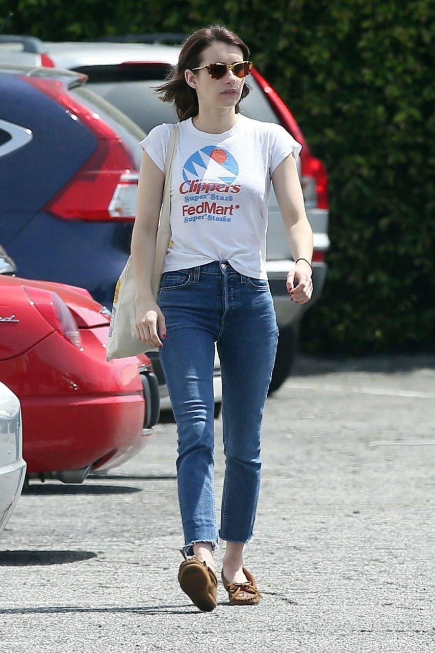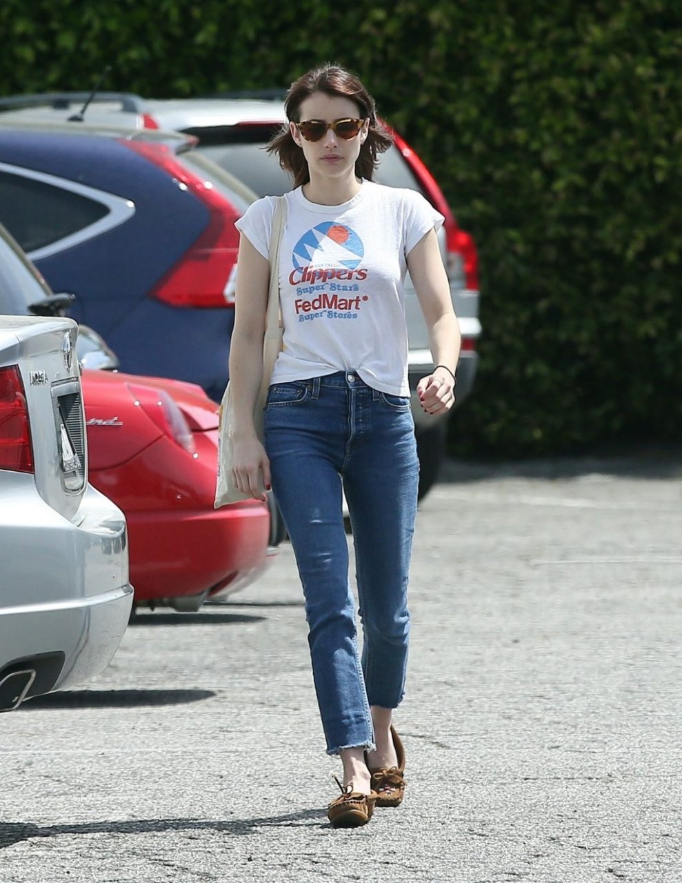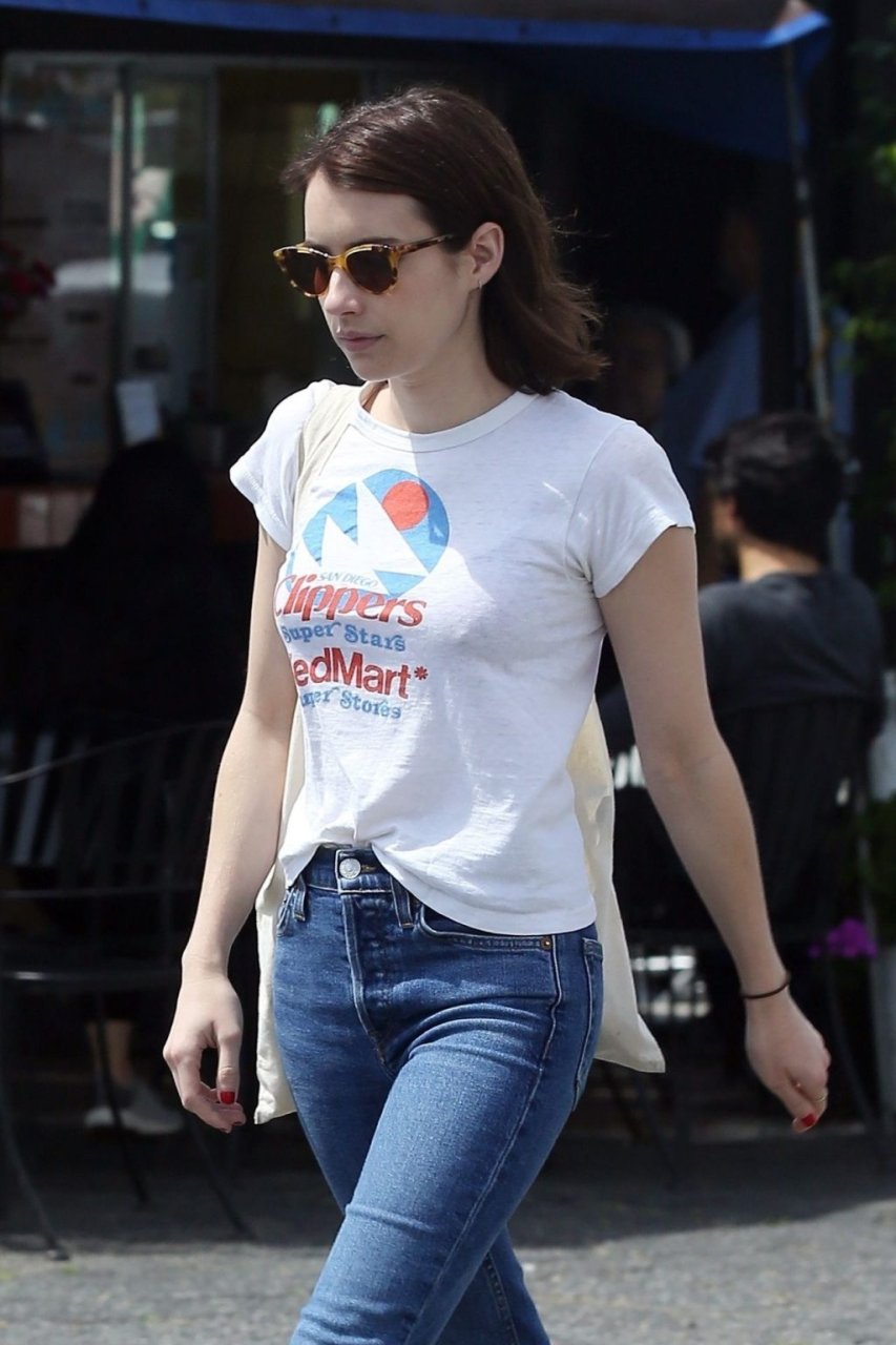 Atriz Emma Roberts resolve alguns afazeres enquanto passeia pelo bairro Los Feliz em Los Angeles, vestindo uma camiseta branca sem sutiã e jeans azul, 09/04/2019.