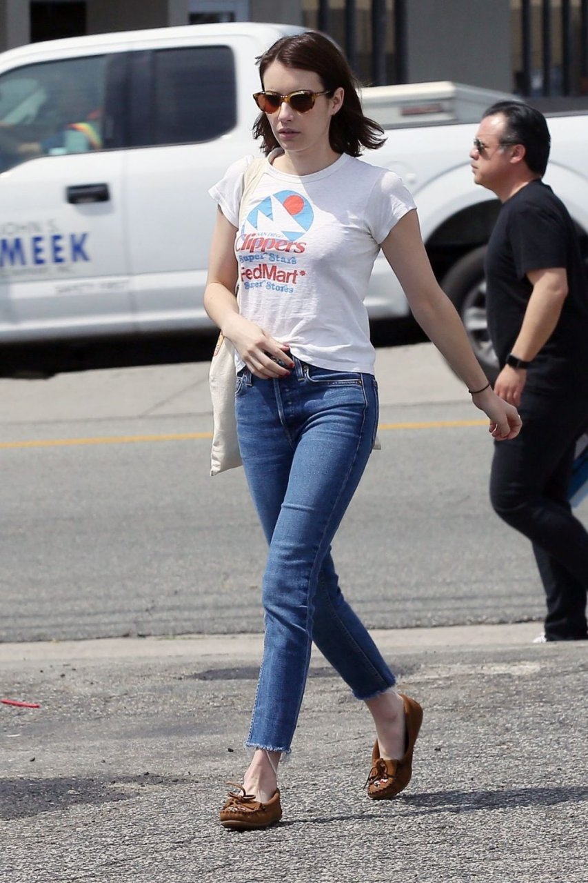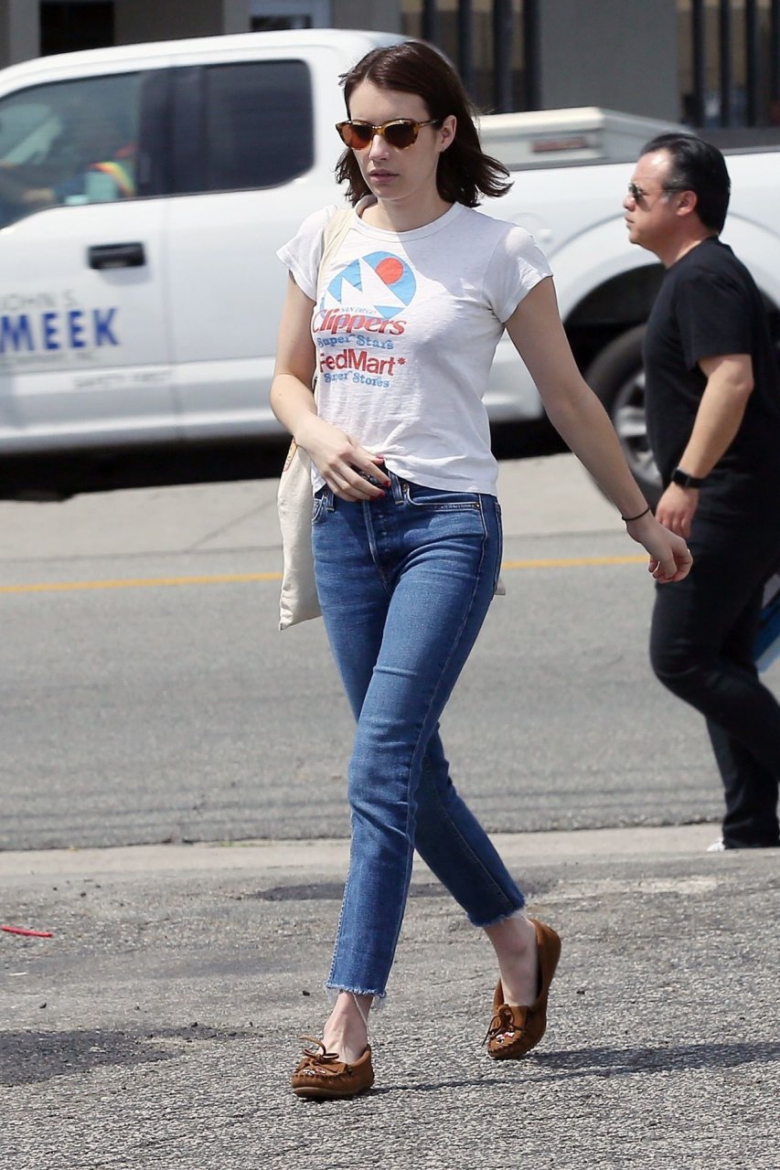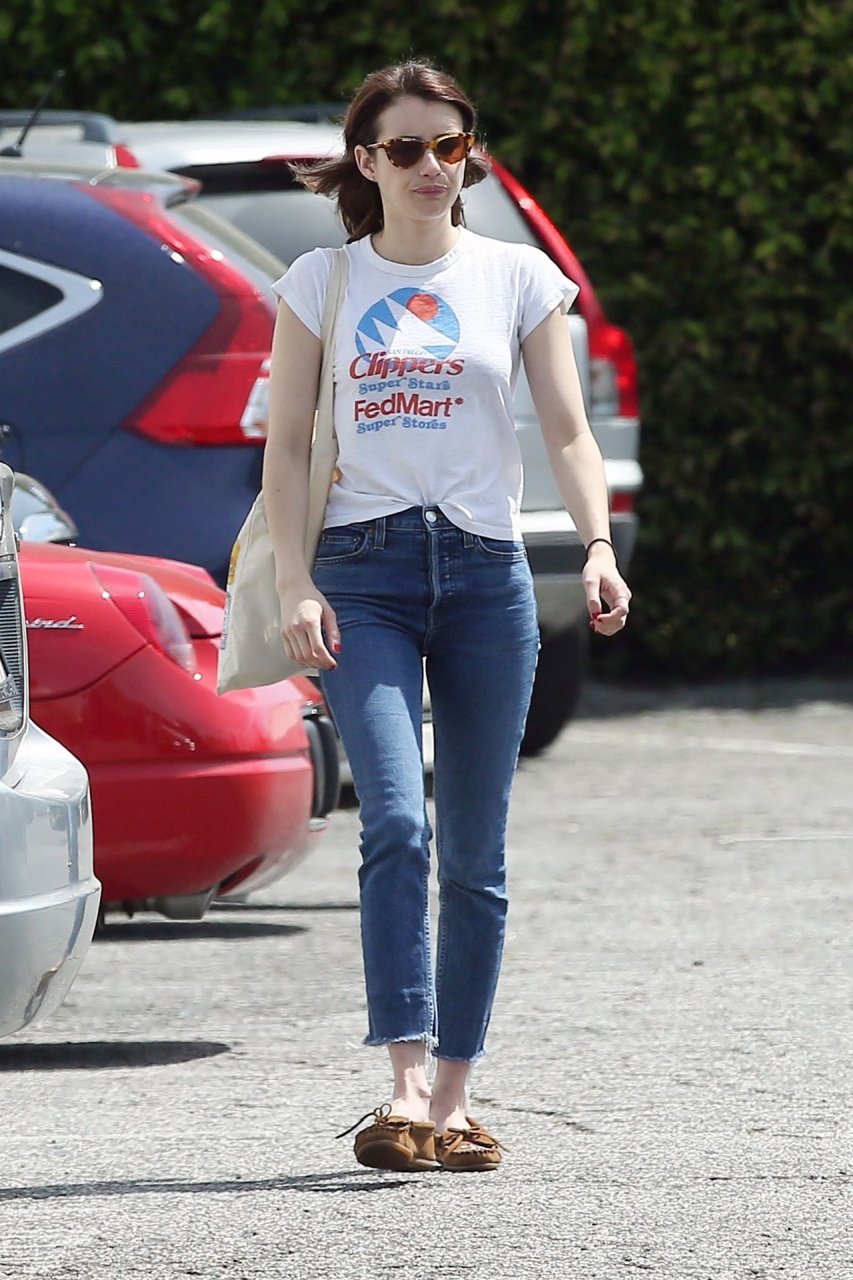 Atriz Emma Roberts resolve alguns afazeres enquanto passeia pelo bairro Los Feliz em Los Angeles, vestindo uma camiseta branca sem sutiã e jeans azul, 09/04/2019.