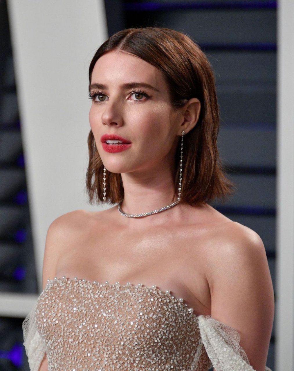 Atriz/cantora/compositora/modelo americana Emma Roberts impressiona todos os convidados e fotógrafos usando um vestido transparente na Vanity Fair Oscar Party de 2019 em Beverly Hills, 24/02/2019.