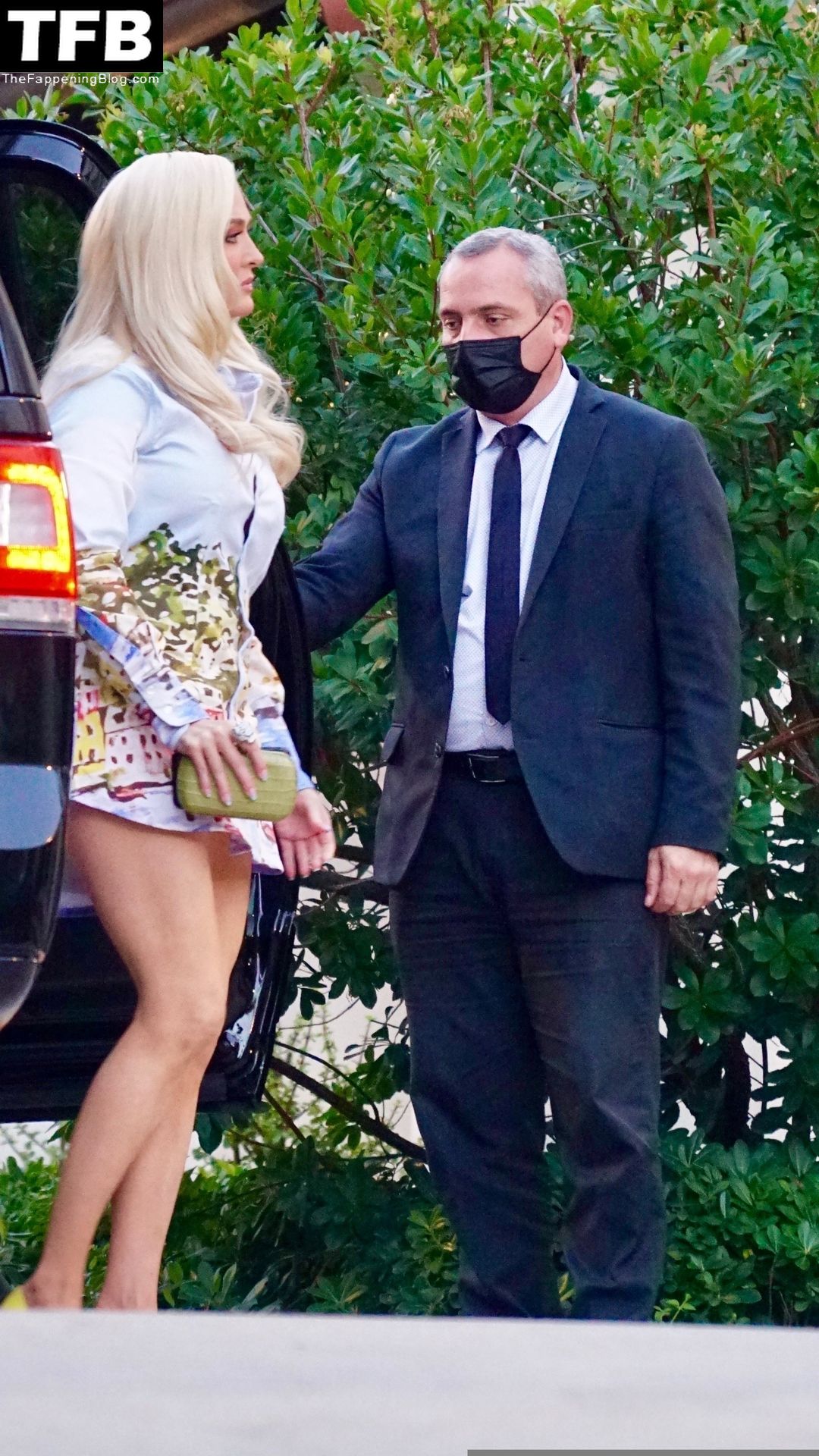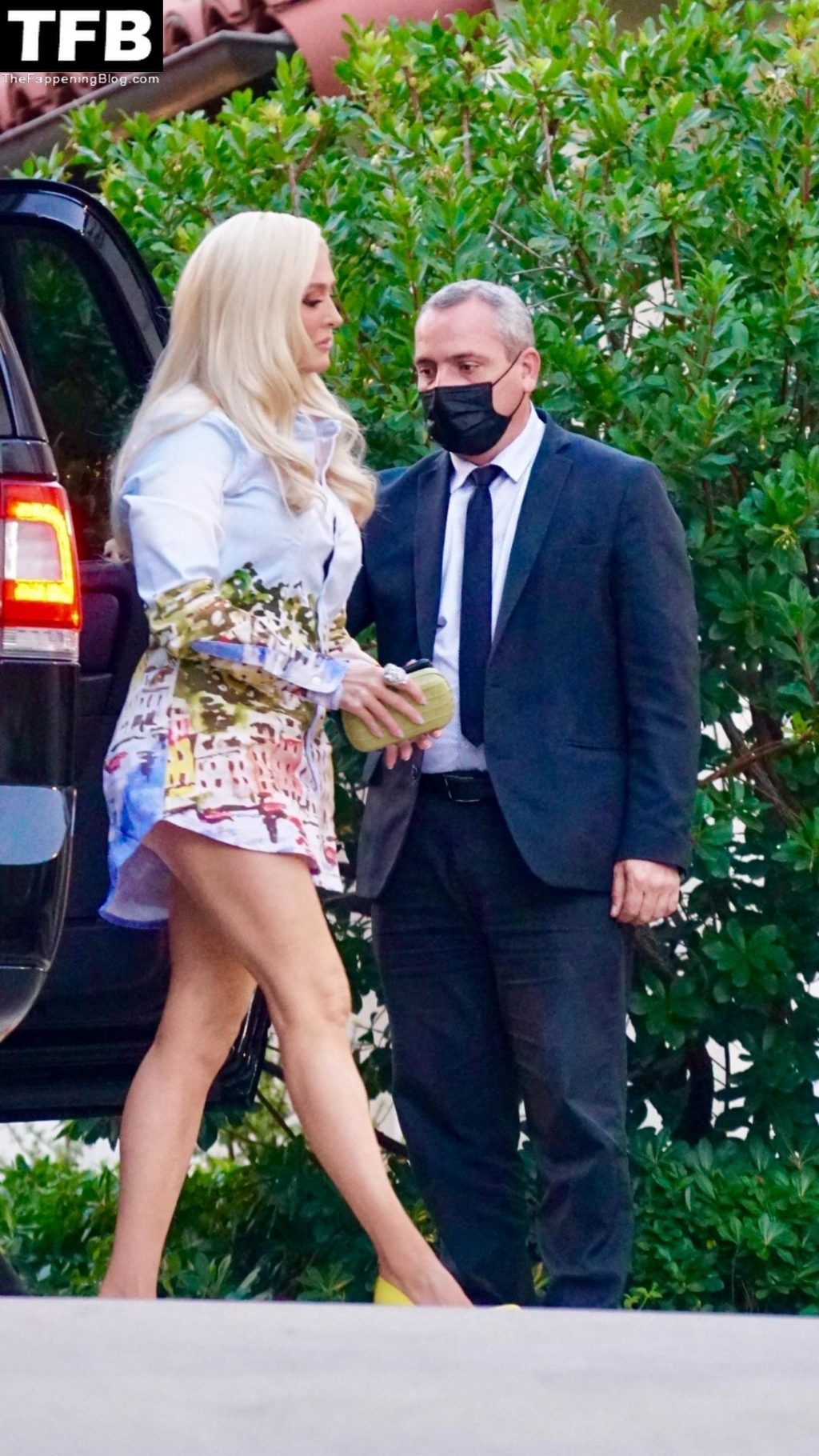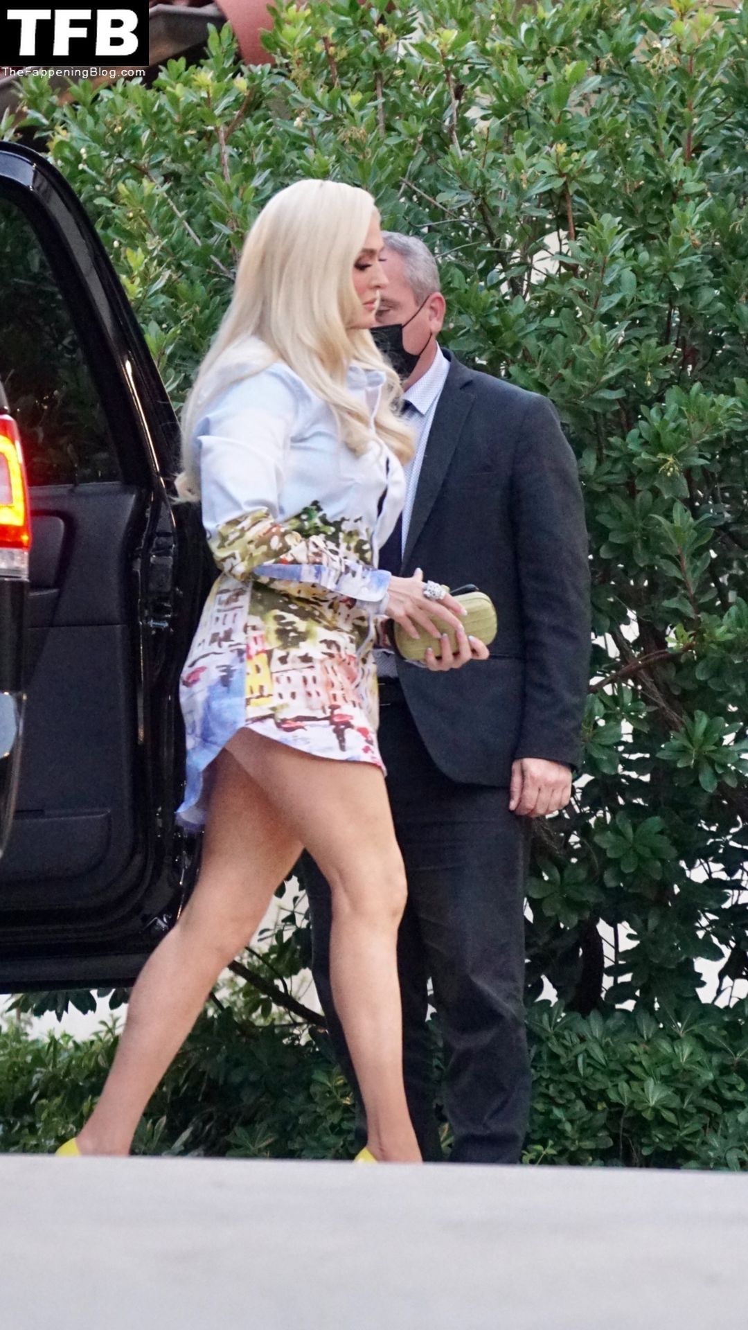Cantora Erika Jayne exibe suas pernas tonificadas em um vestido curto e saltos amarelos ao chegar em uma casa em Bel Air para gravar RHOBH, 05/11/2021.
