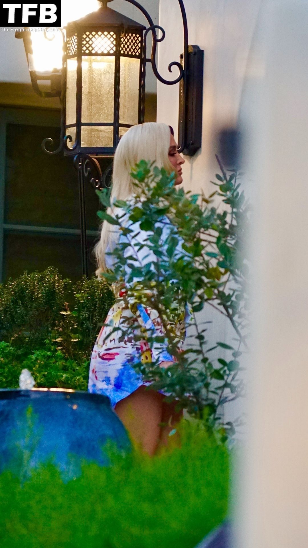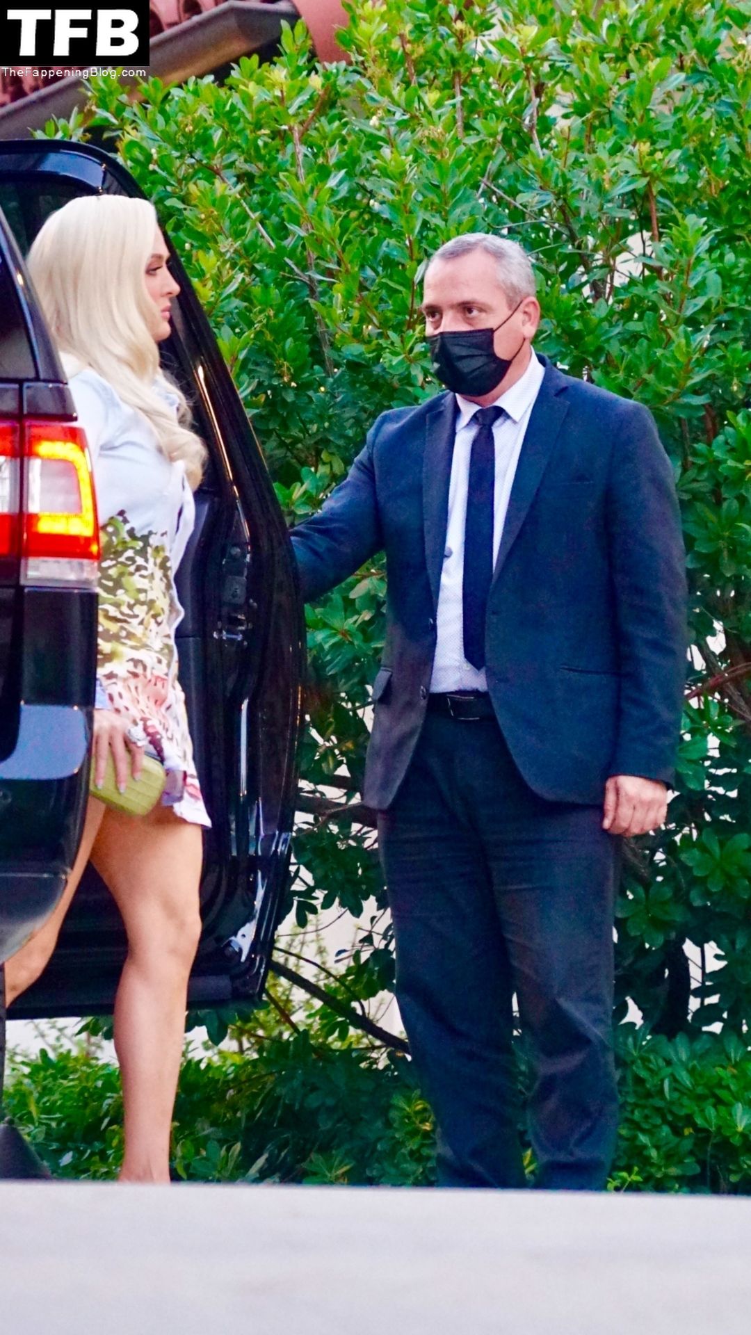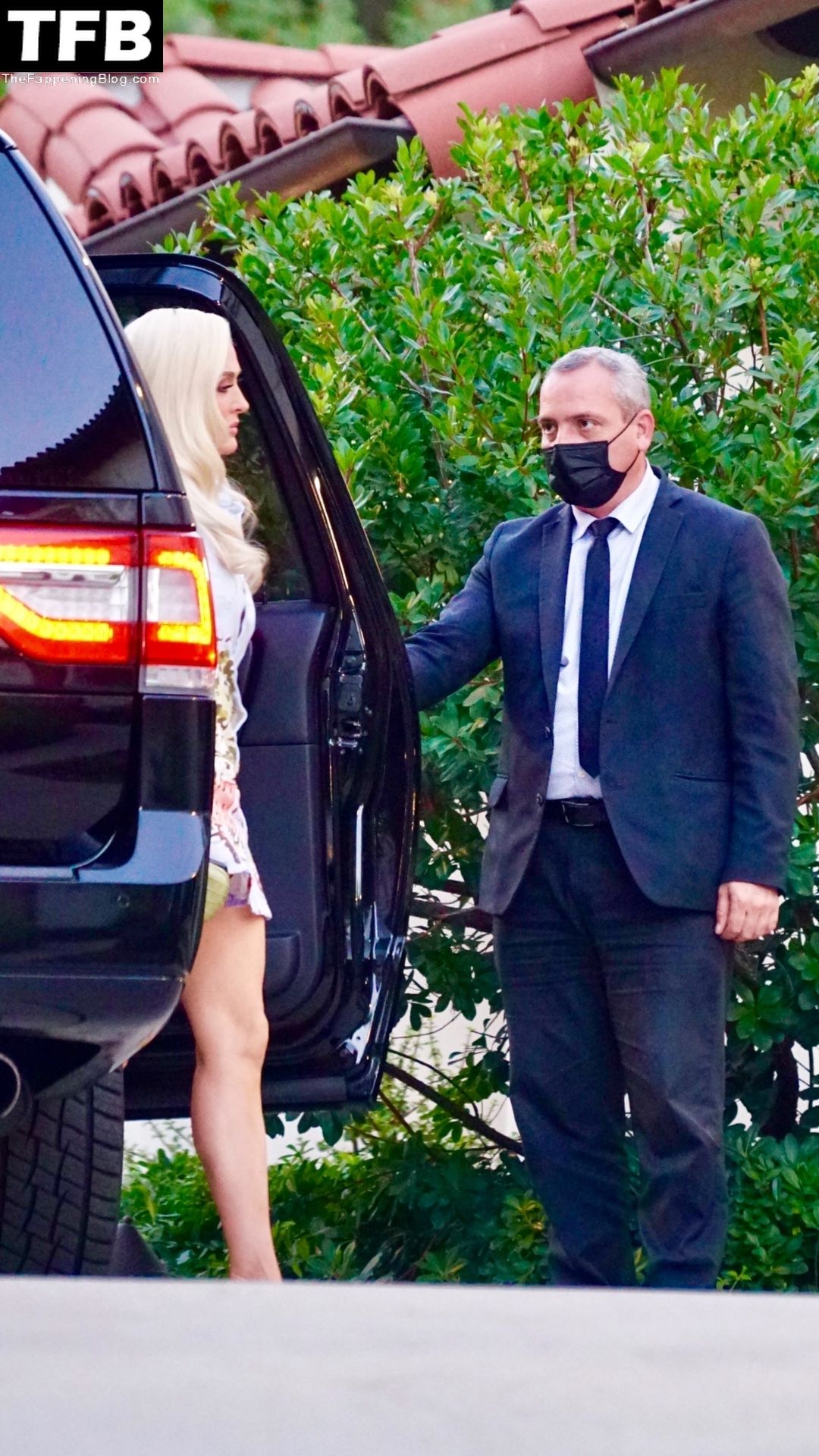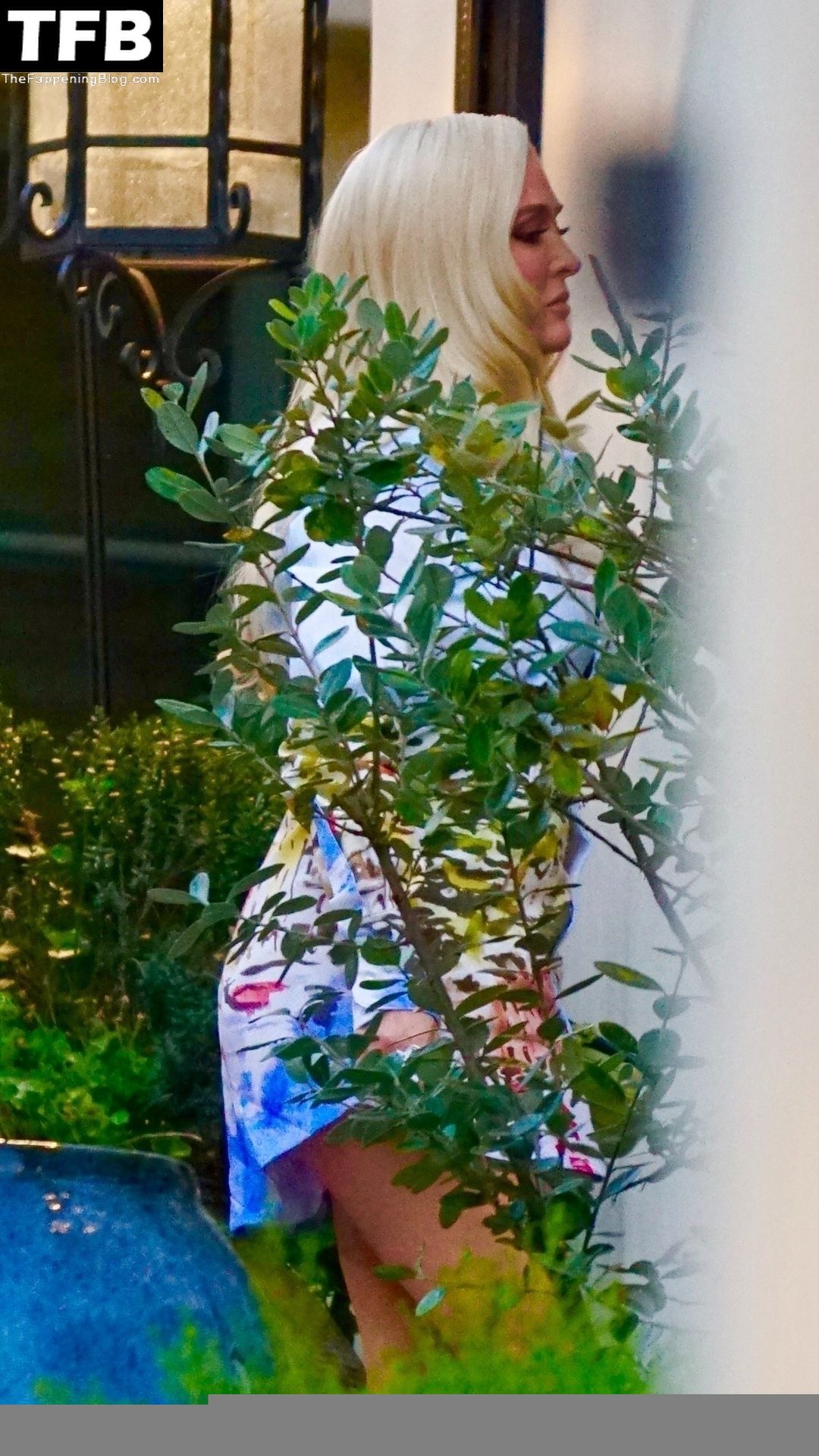 Cantora Erika Jayne exibe suas pernas tonificadas em um vestido curto e saltos amarelos ao chegar em uma casa em Bel Air para gravar RHOBH, 05/11/2021.