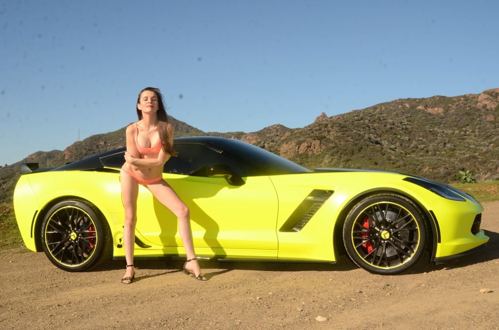 Erika Jordan e Alicia Arden estão posando em uma sessão de fotos com um Corvette C7 Z06 Supercar de $150.000 em Malibu, 13/03/2017.