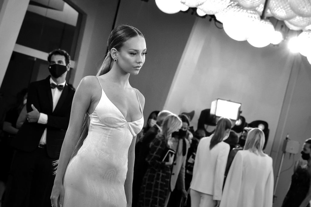 Jovem Ester Exposito chega ao photocall do filme Lacci no 77º Festival de Cinema de Veneza na Itália, 02/09/2020. A atriz exibe sua silhueta sexy em um elegante vestido branco.