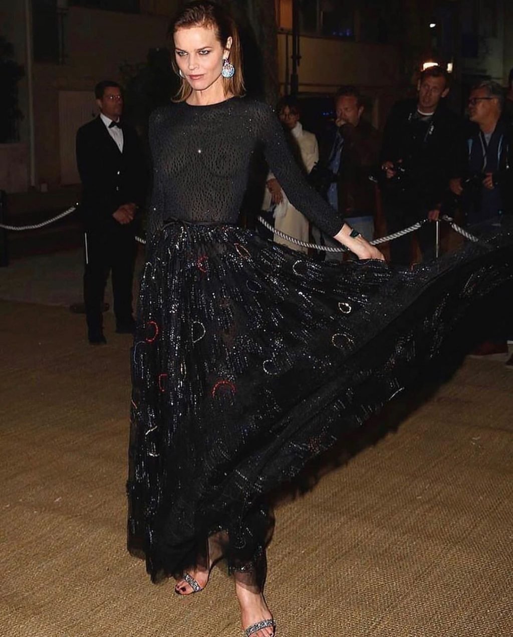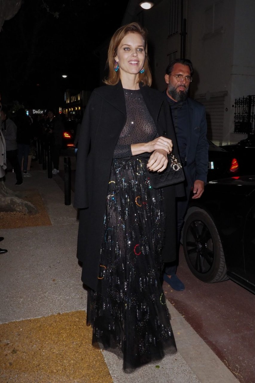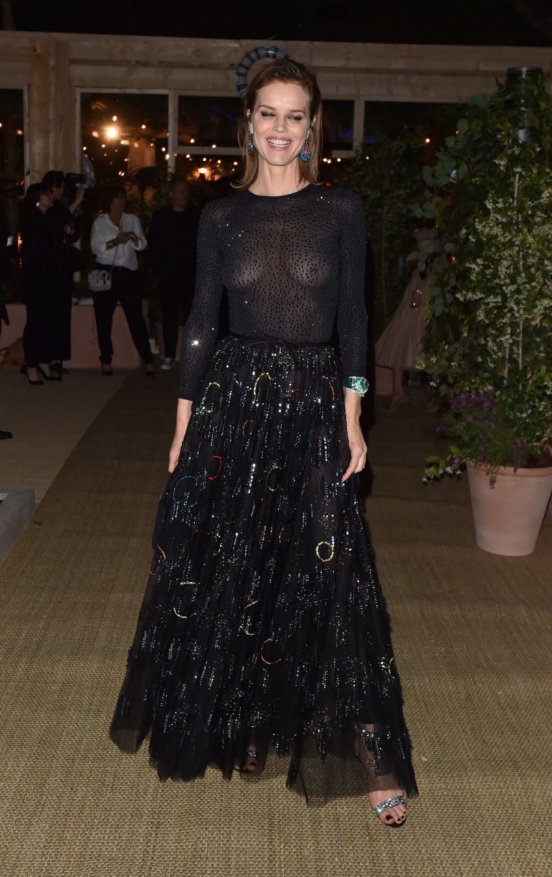 Eva Herzigova sem sutiã foi vista na festa Dior Vogue durante o 72º Festival Internacional de Cinema de Cannes, 15/05/2019. A modelo de 46 anos mostrou seus seios, usando um vestido transparente.